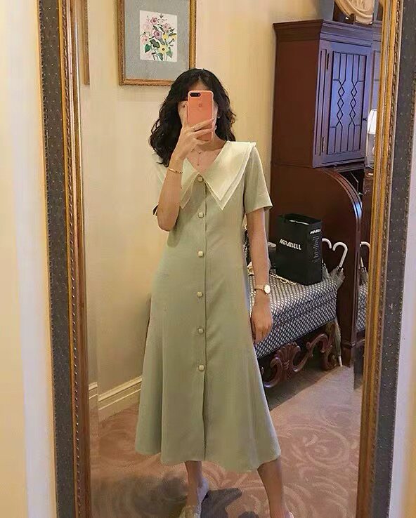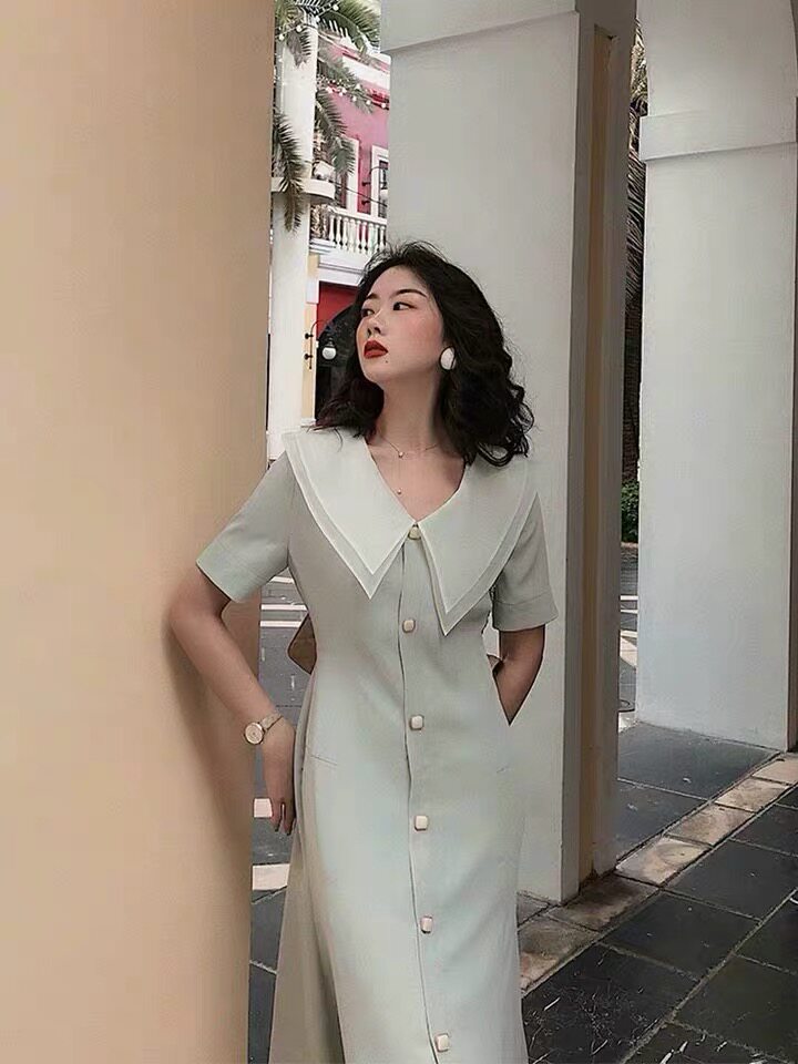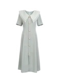 Военно-морское платье, французский стиль, в стиле Шанель, высокая талия, V-образный вырез