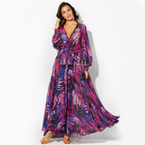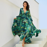 Краса фонарь рукав v -neck зеленый лист юбка для печати листьев