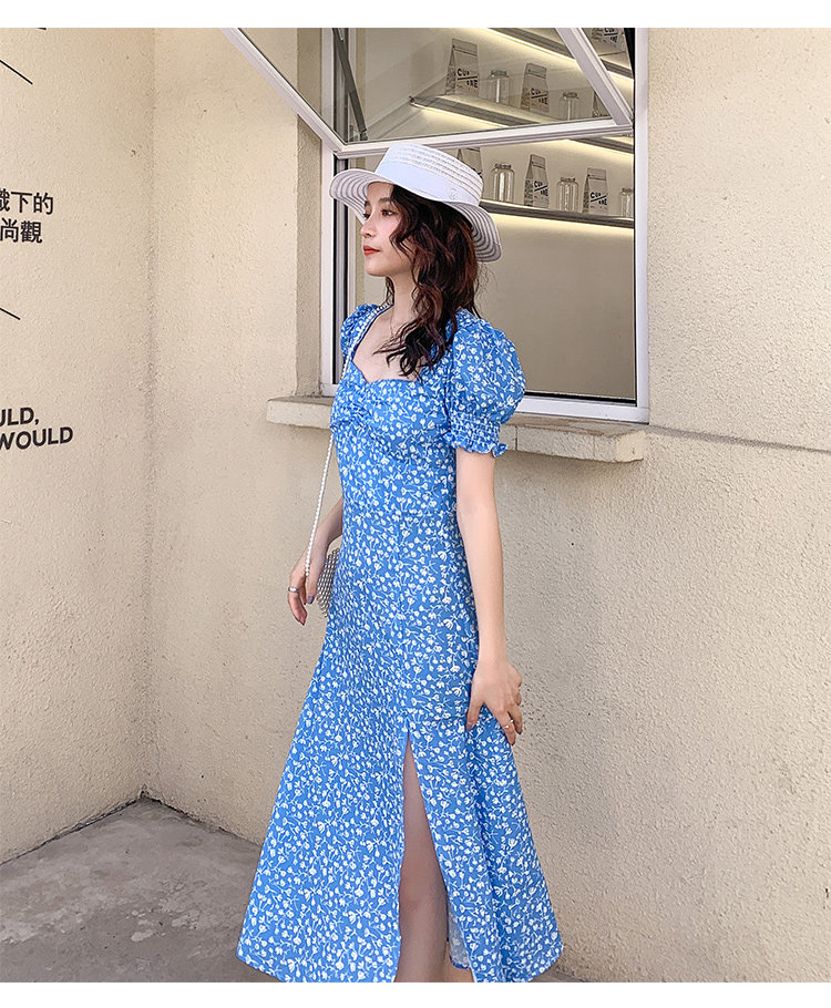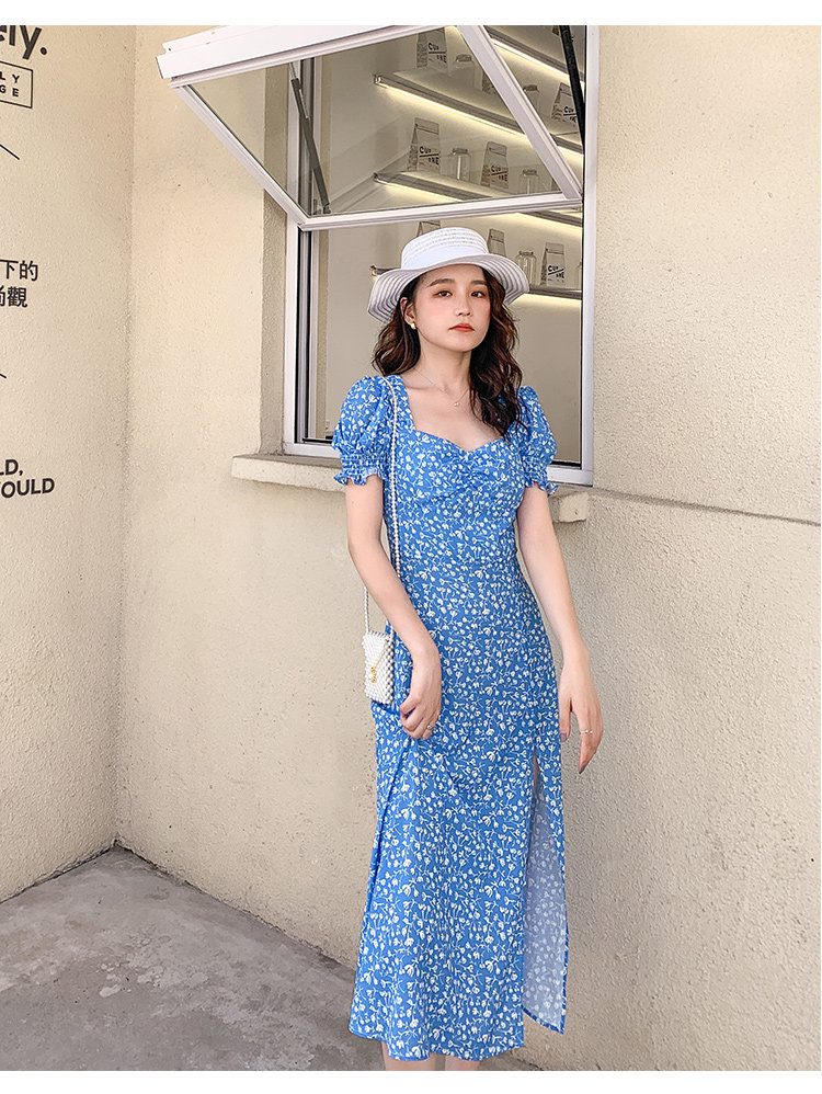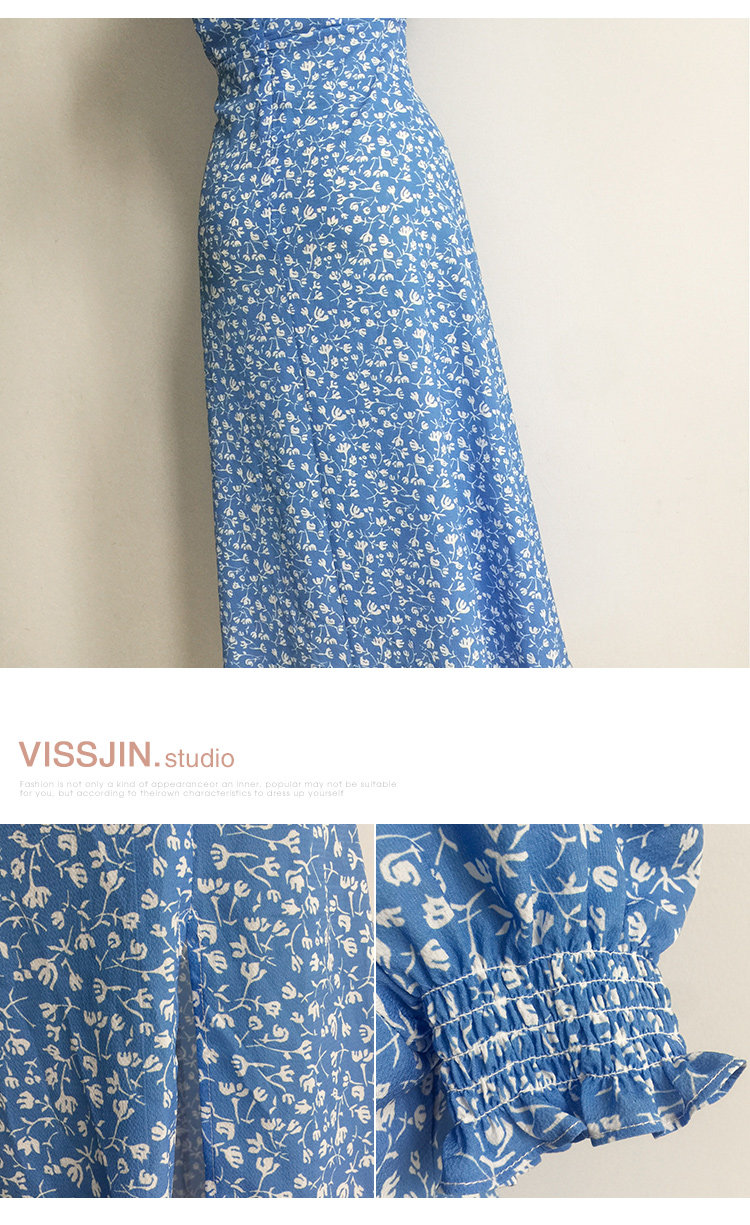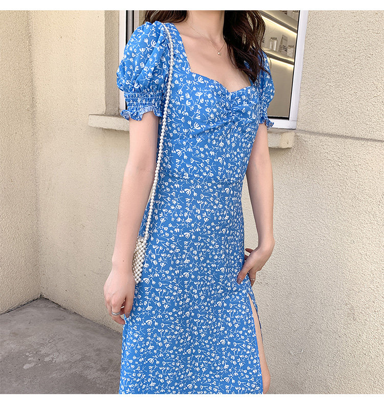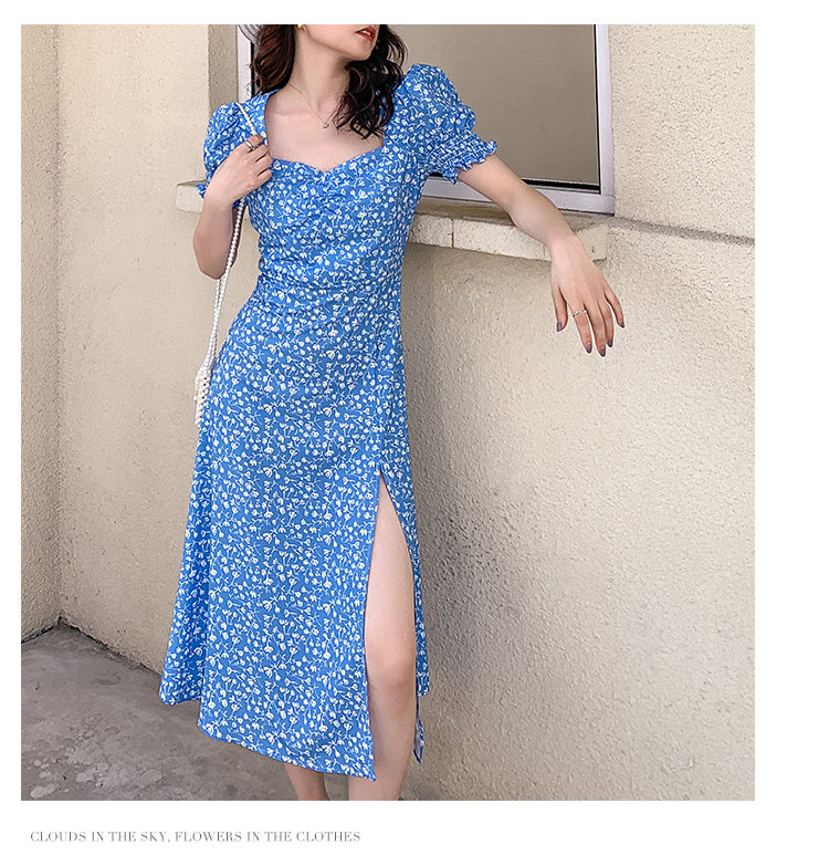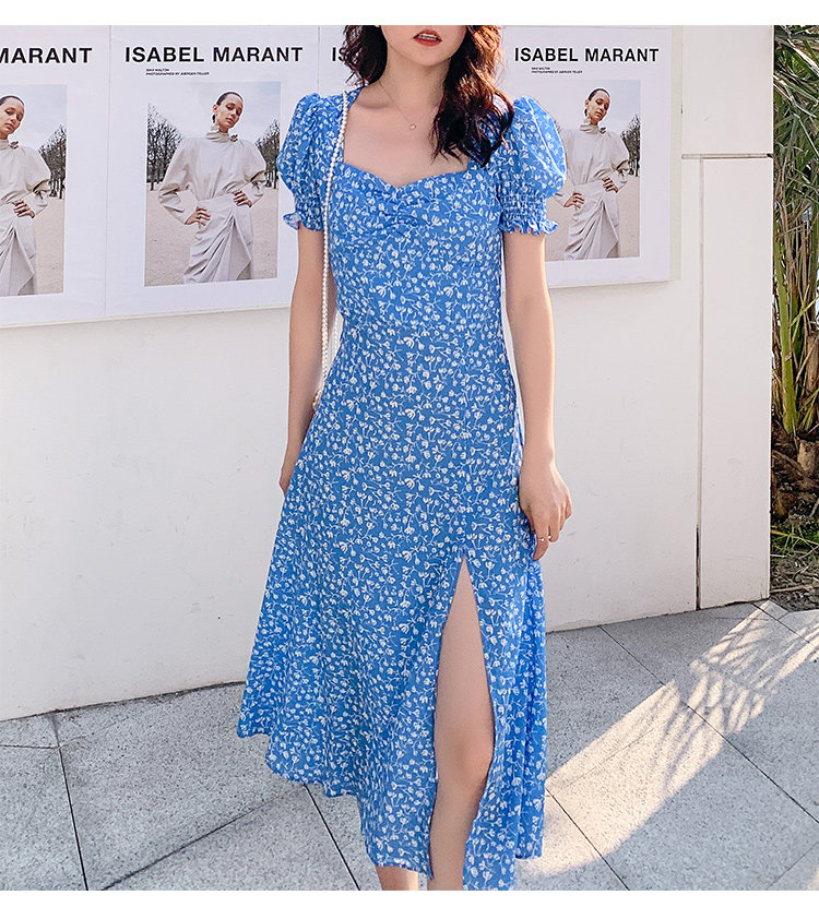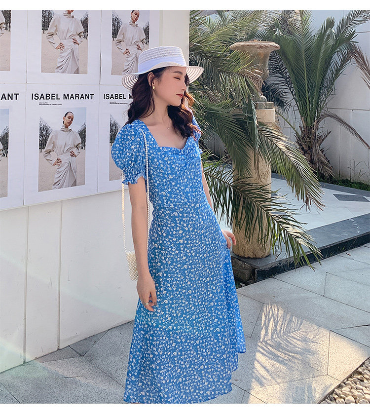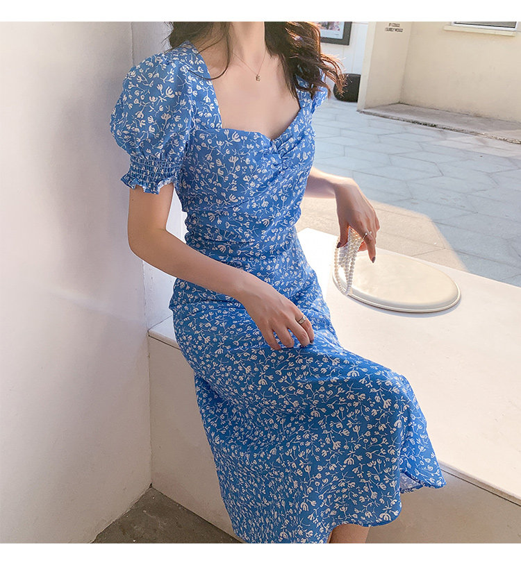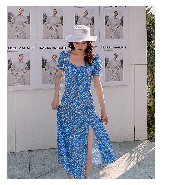 Ретро синее платье, юбка, французский стиль, цветочный принт