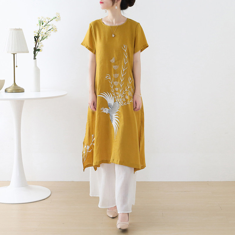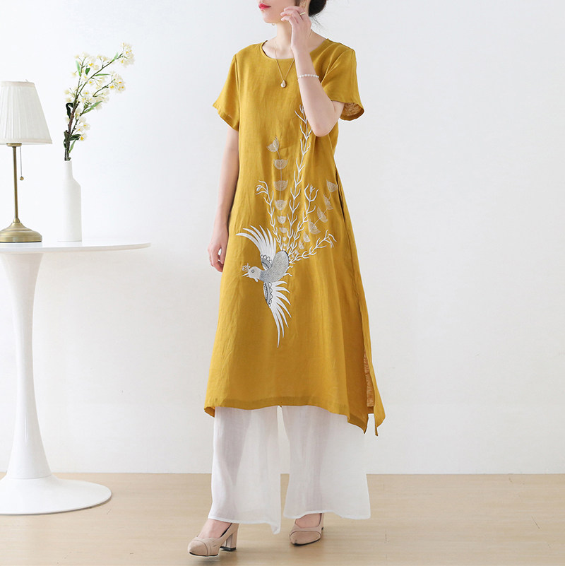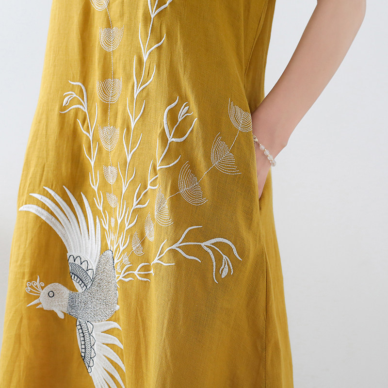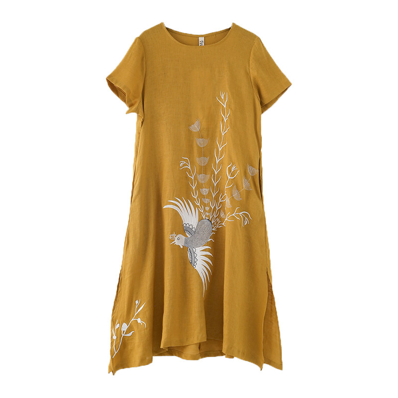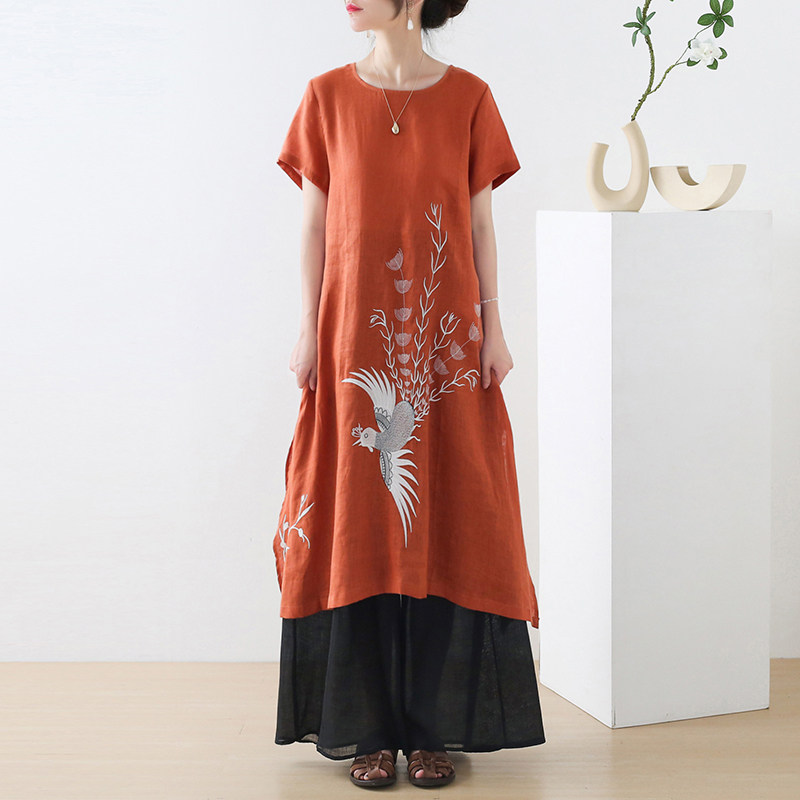 Летнее длинное платье с коротким рукавом, юбка, средней длины, с вышивкой, из хлопка и льна, А-силуэт