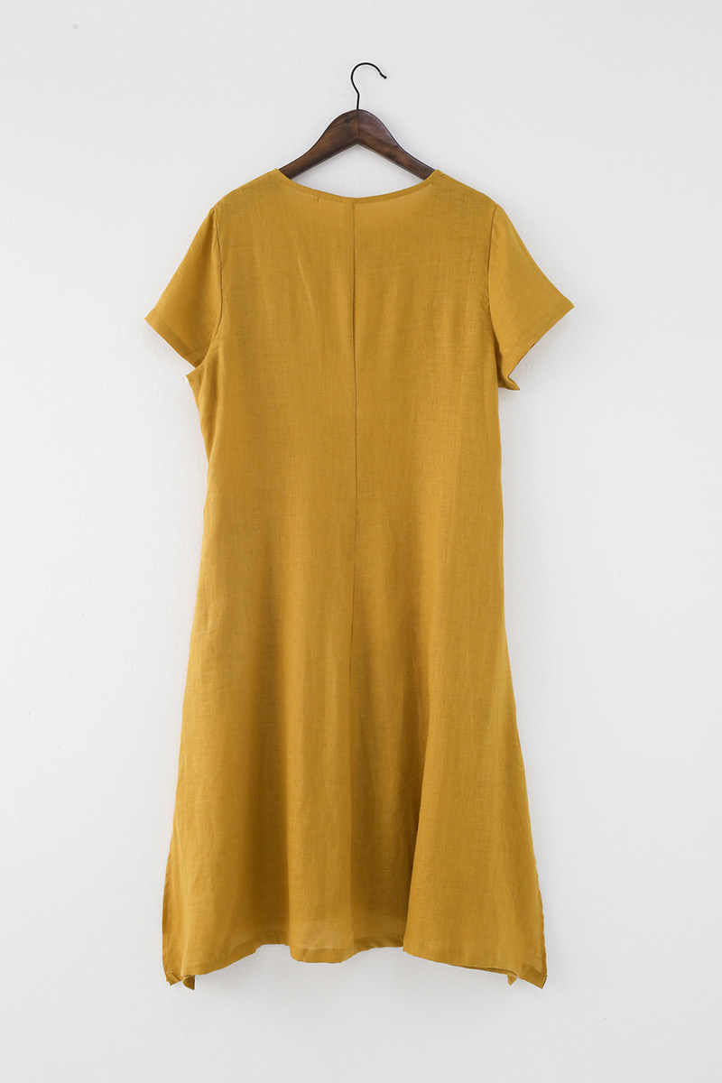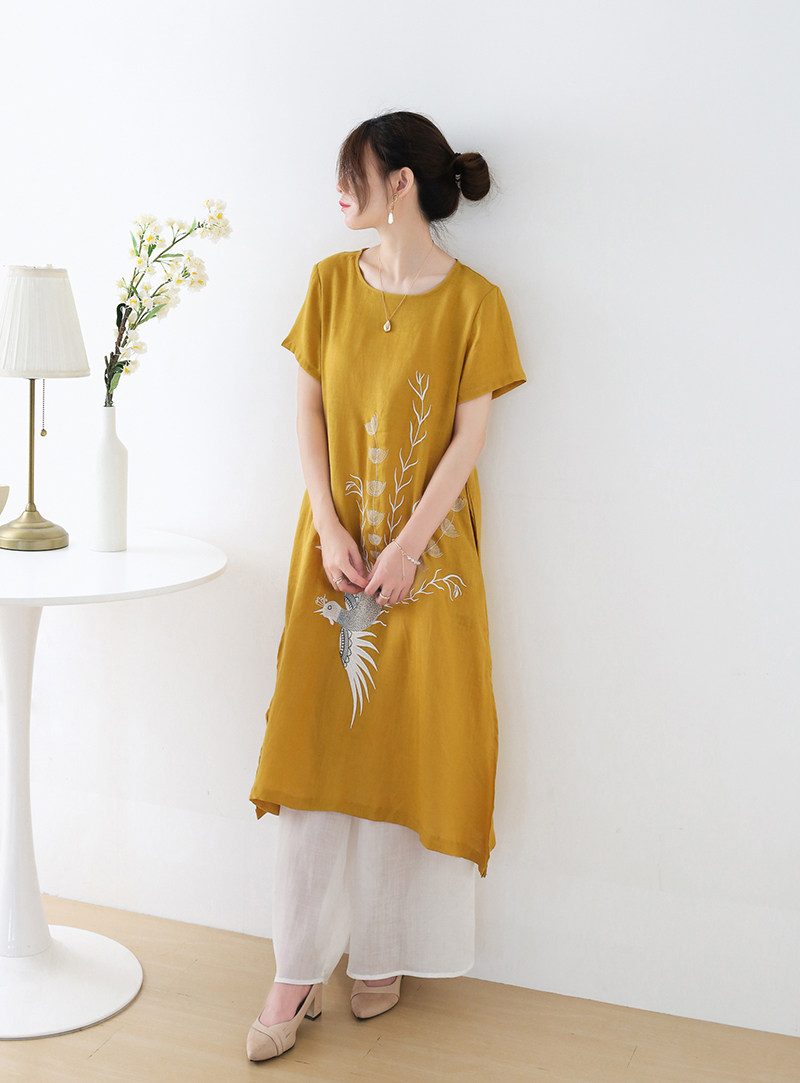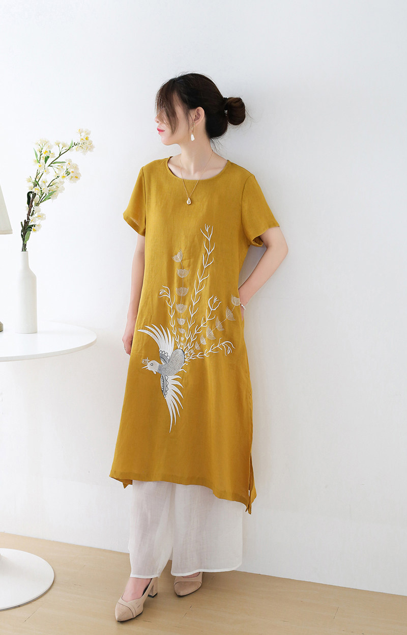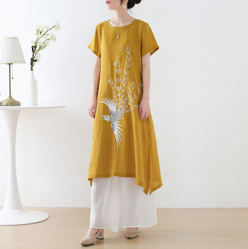 Летнее длинное платье с коротким рукавом, юбка, средней длины, с вышивкой, из хлопка и льна, А-силуэт