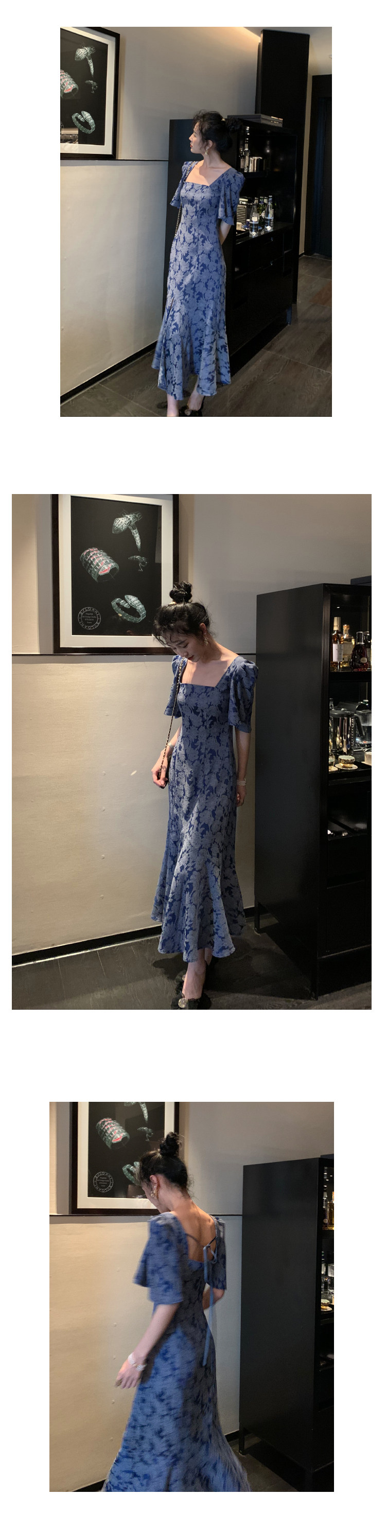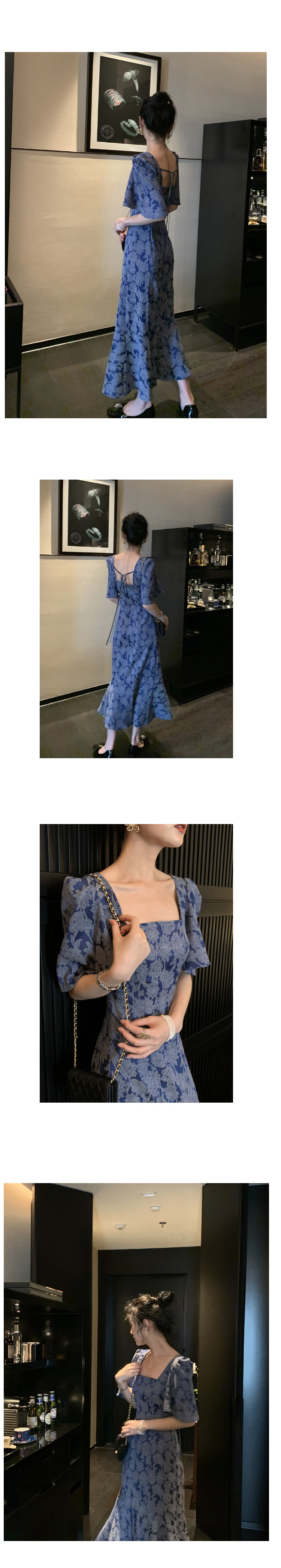 Ретро платье, приталенный корсет, длинная длинная юбка, квадратный вырез, французский стиль, в цветочек, облегающий крой, рукава фонарики, А-силуэт