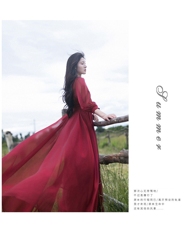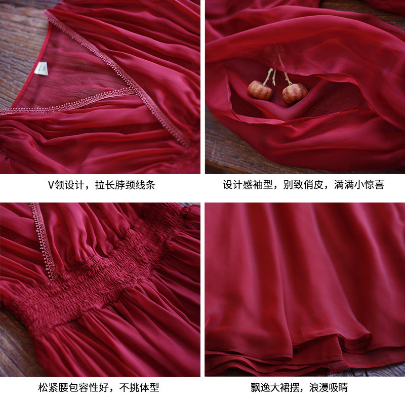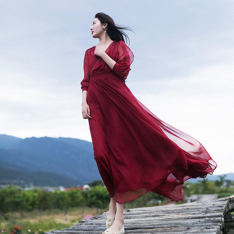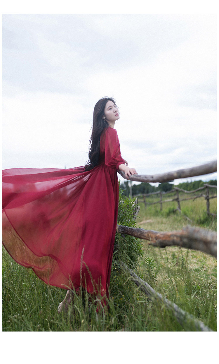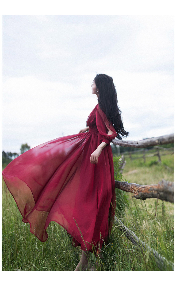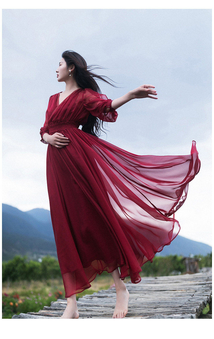 Ретро шифоновое летнее красное платье, приталенная длинная юбка, корсет, из хлопка и льна, V-образный вырез