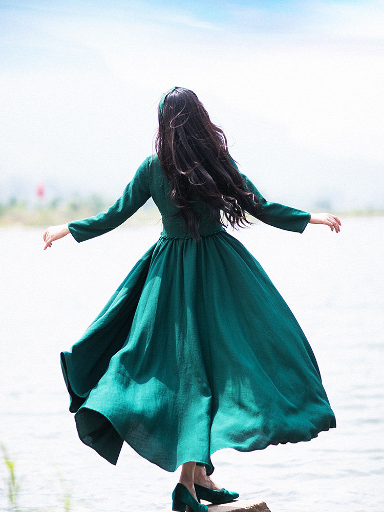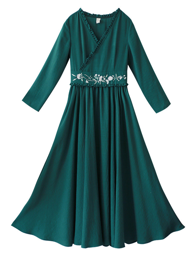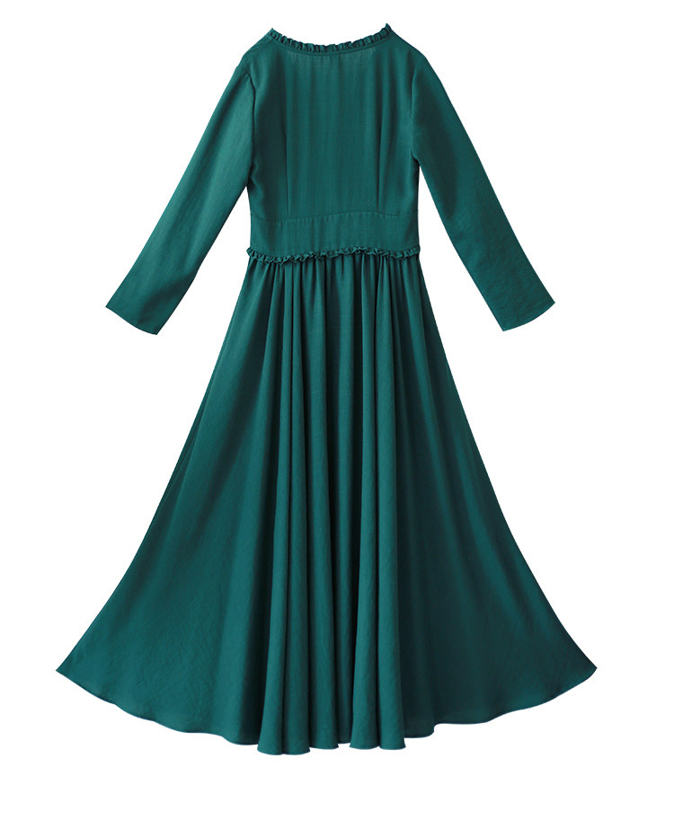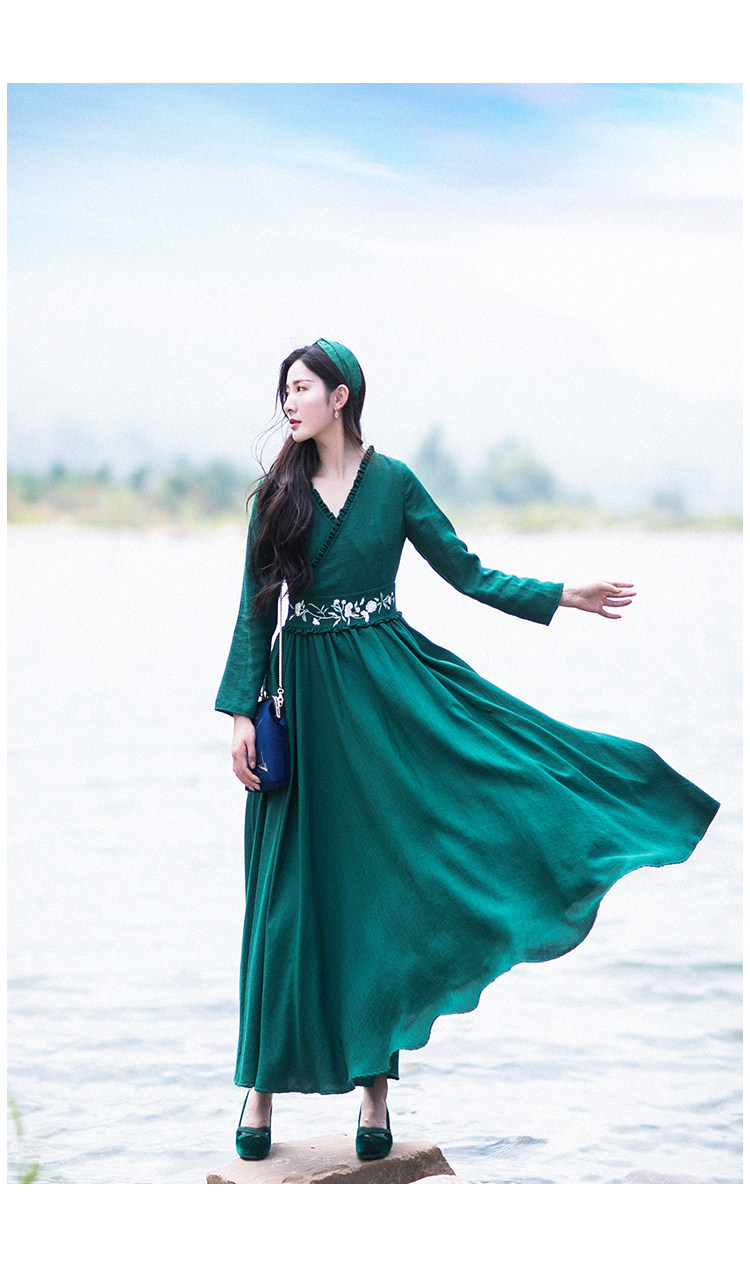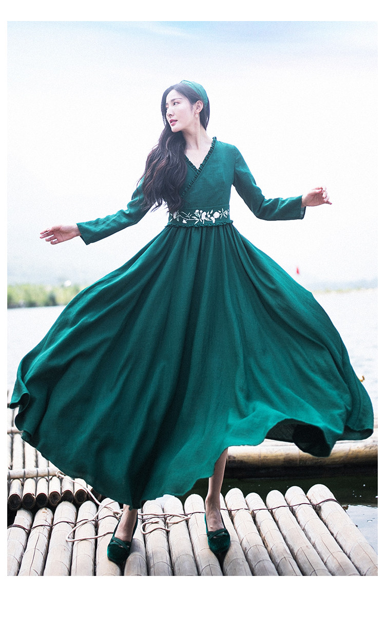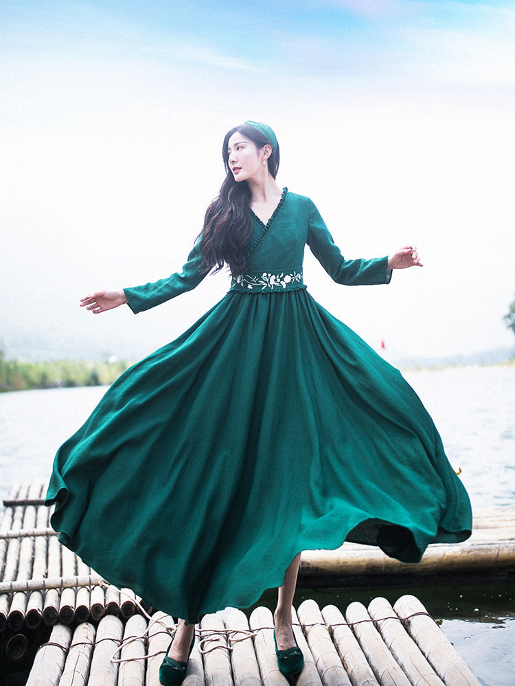 Зеленое платье, осенний лонгслив, длинная юбка, (в наличии на складе), из хлопка и льна, коллекция 2021, V-образный вырез