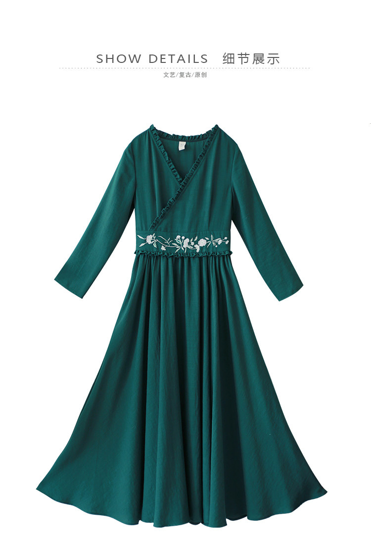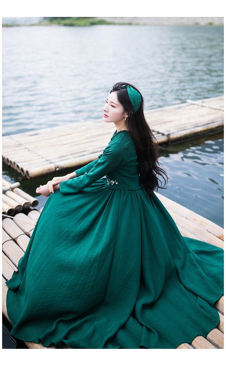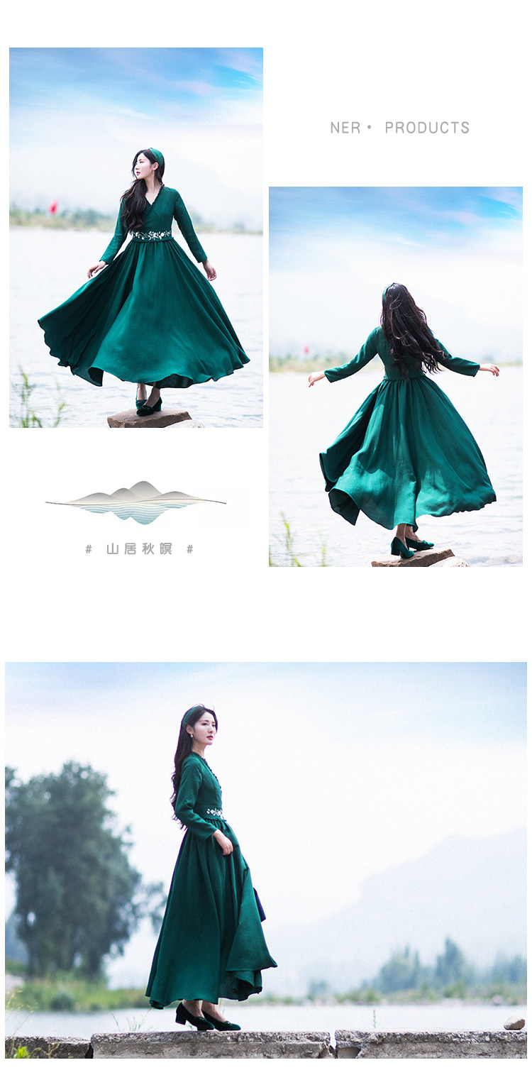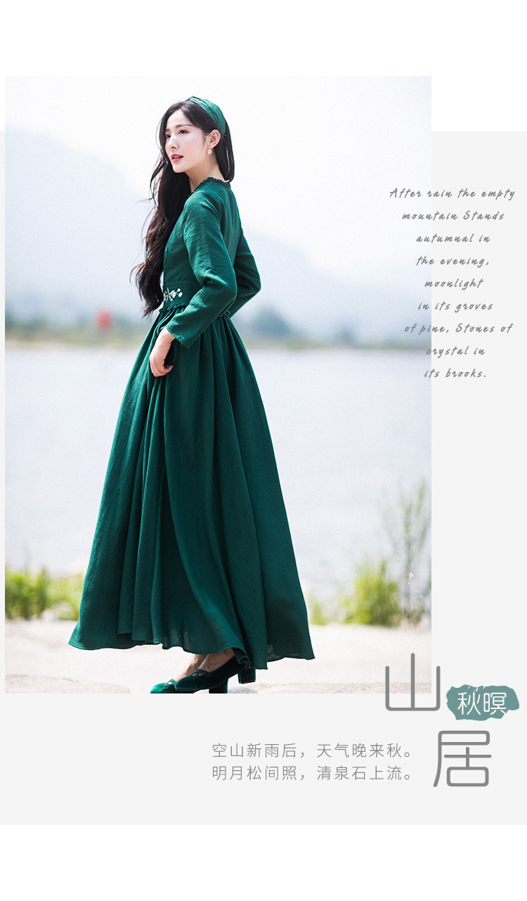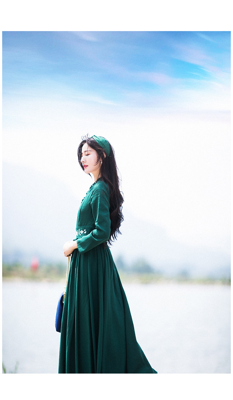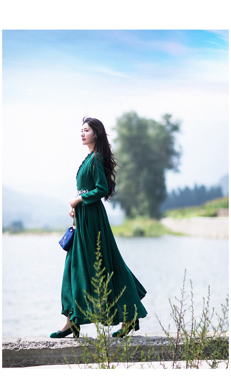 Зеленое платье, осенний лонгслив, длинная юбка, (в наличии на складе), из хлопка и льна, коллекция 2021, V-образный вырез