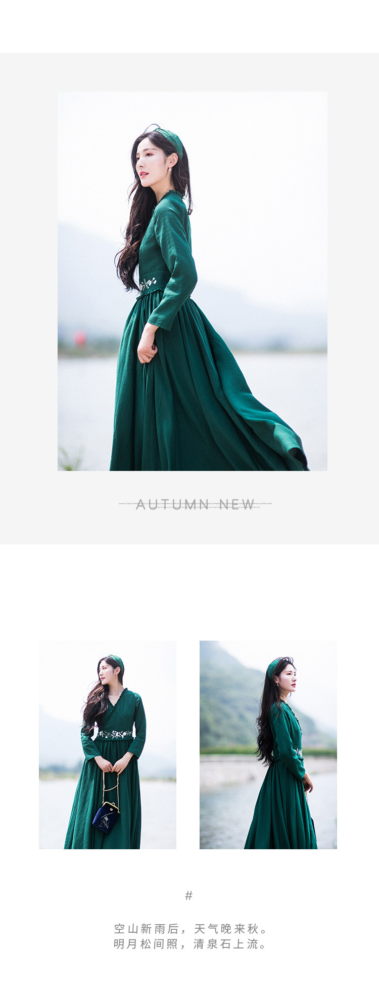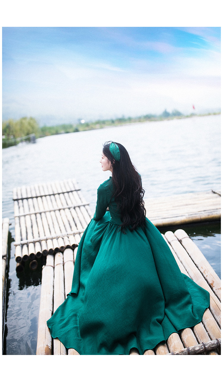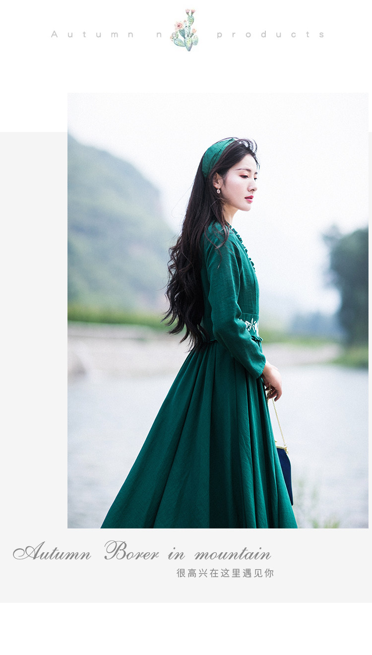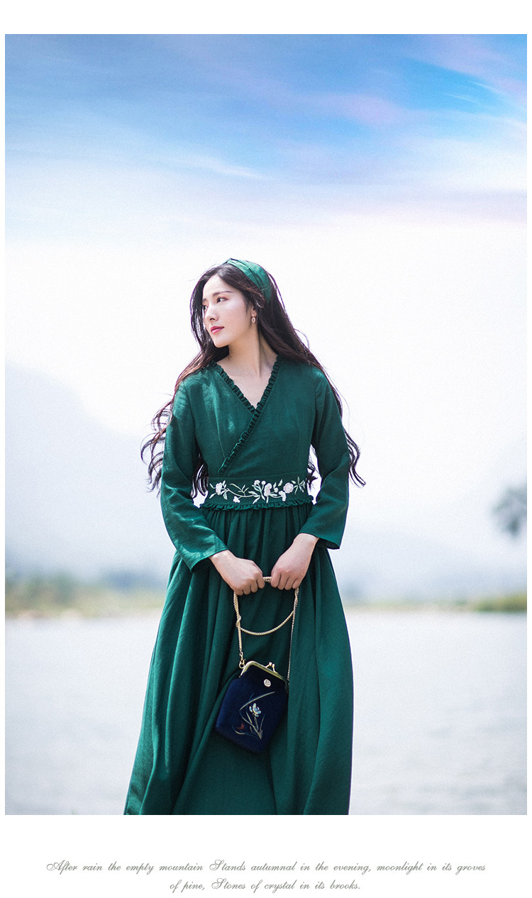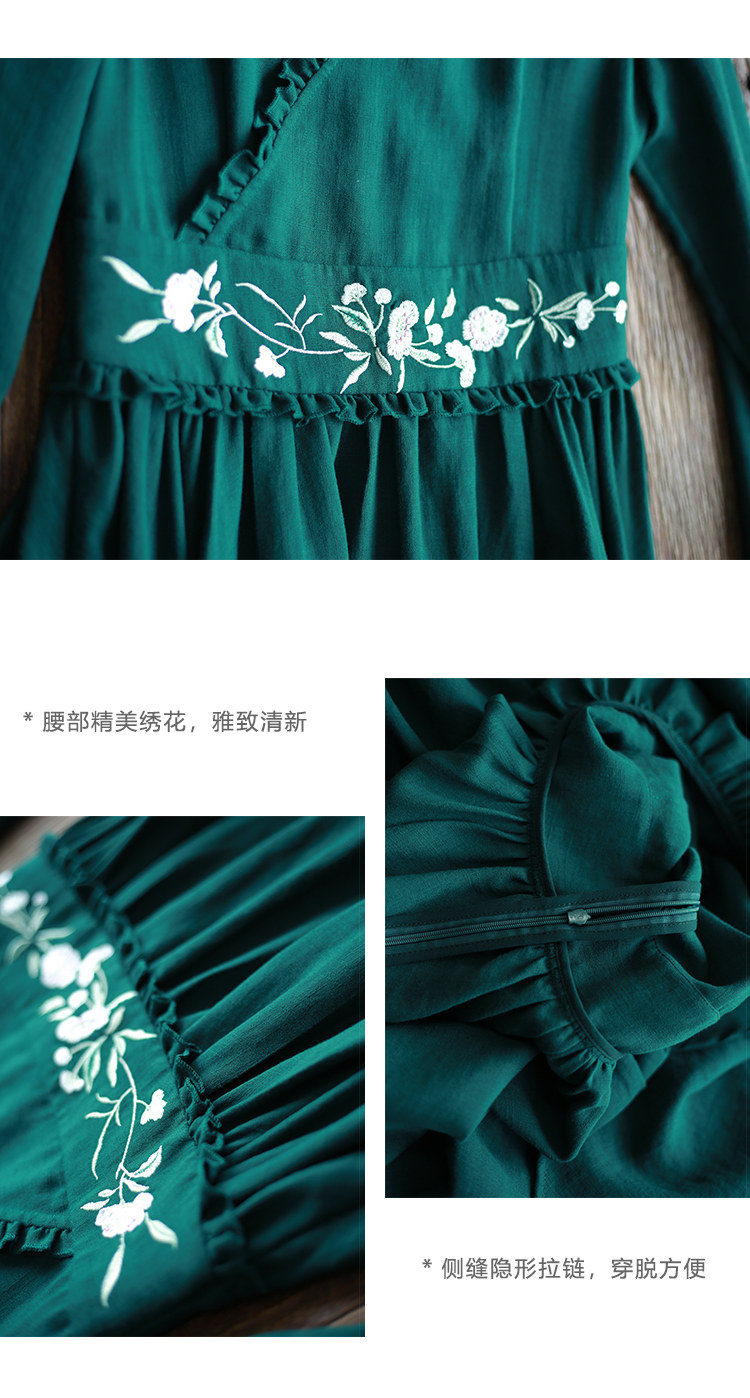 Зеленое платье, осенний лонгслив, длинная юбка, (в наличии на складе), из хлопка и льна, коллекция 2021, V-образный вырез
