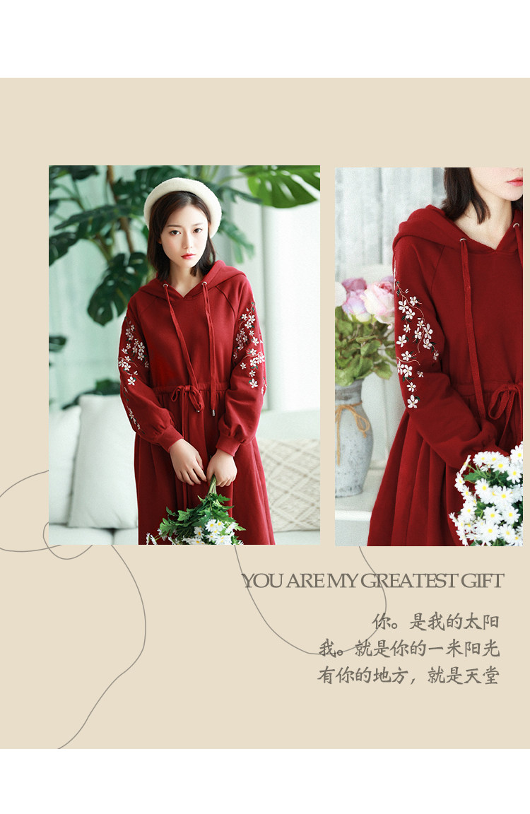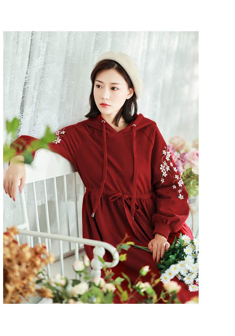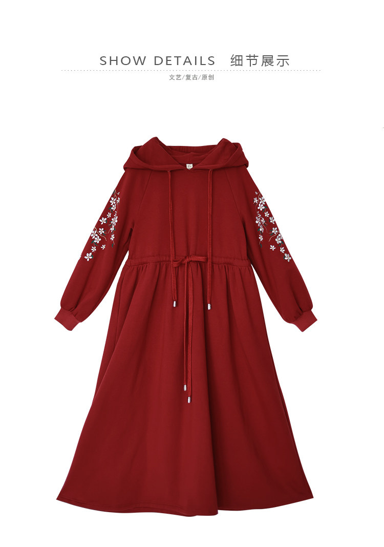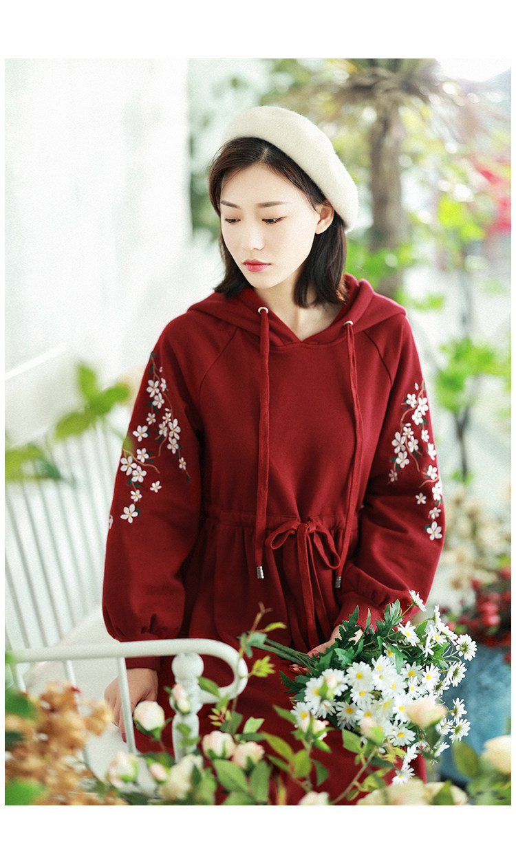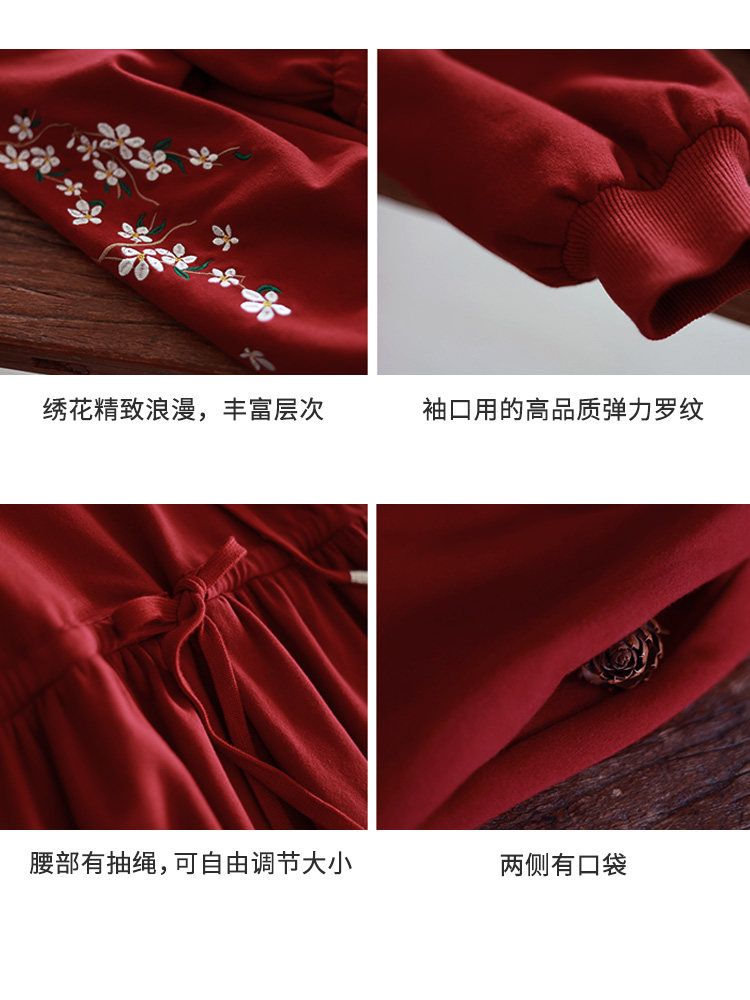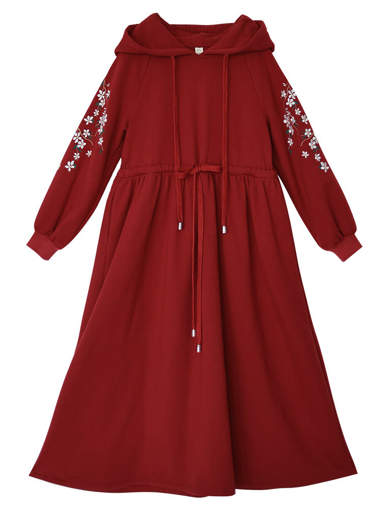 Осенняя красная толстовка, длинная юбка, утепленное платье, из хлопка и льна, 2021 года, оверсайз, в цветочек