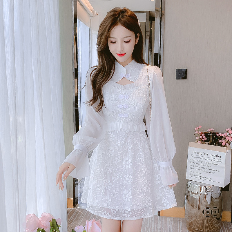 Ципао, кружевное весеннее приталенное платье, приталенная длинная юбка, рукава фонарики, средней длины