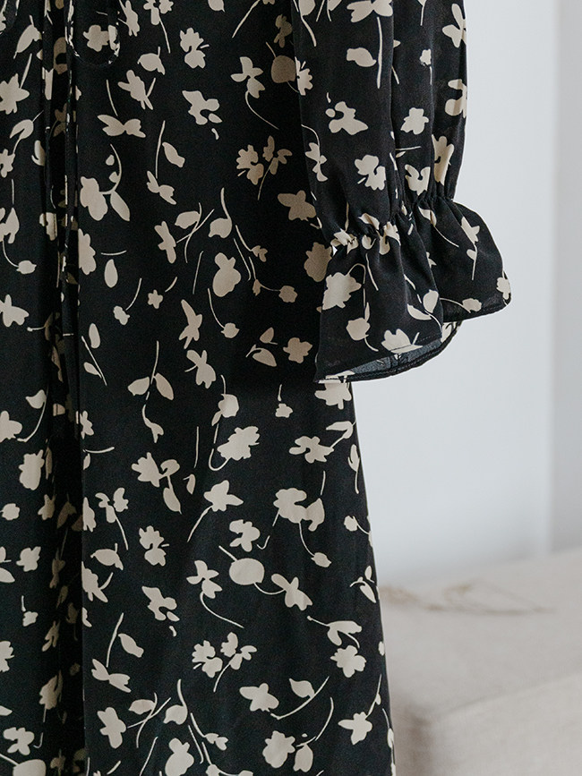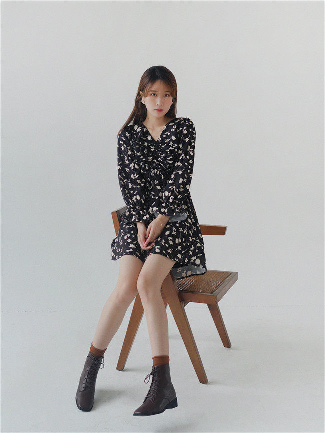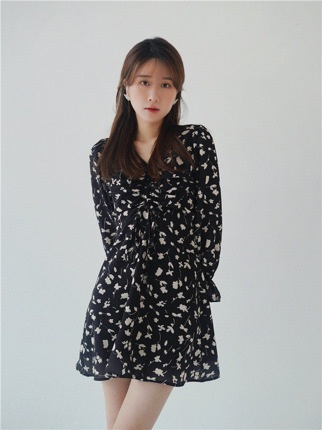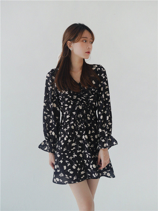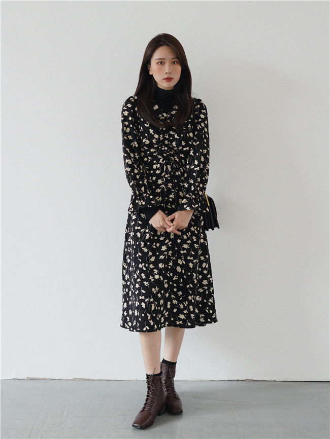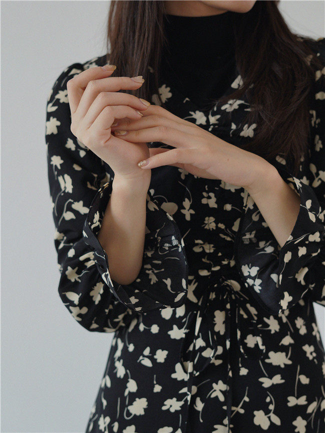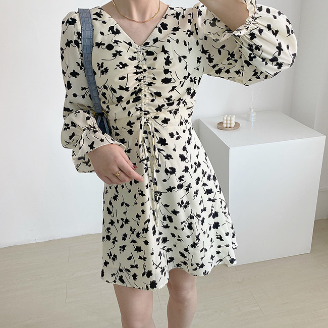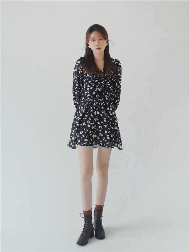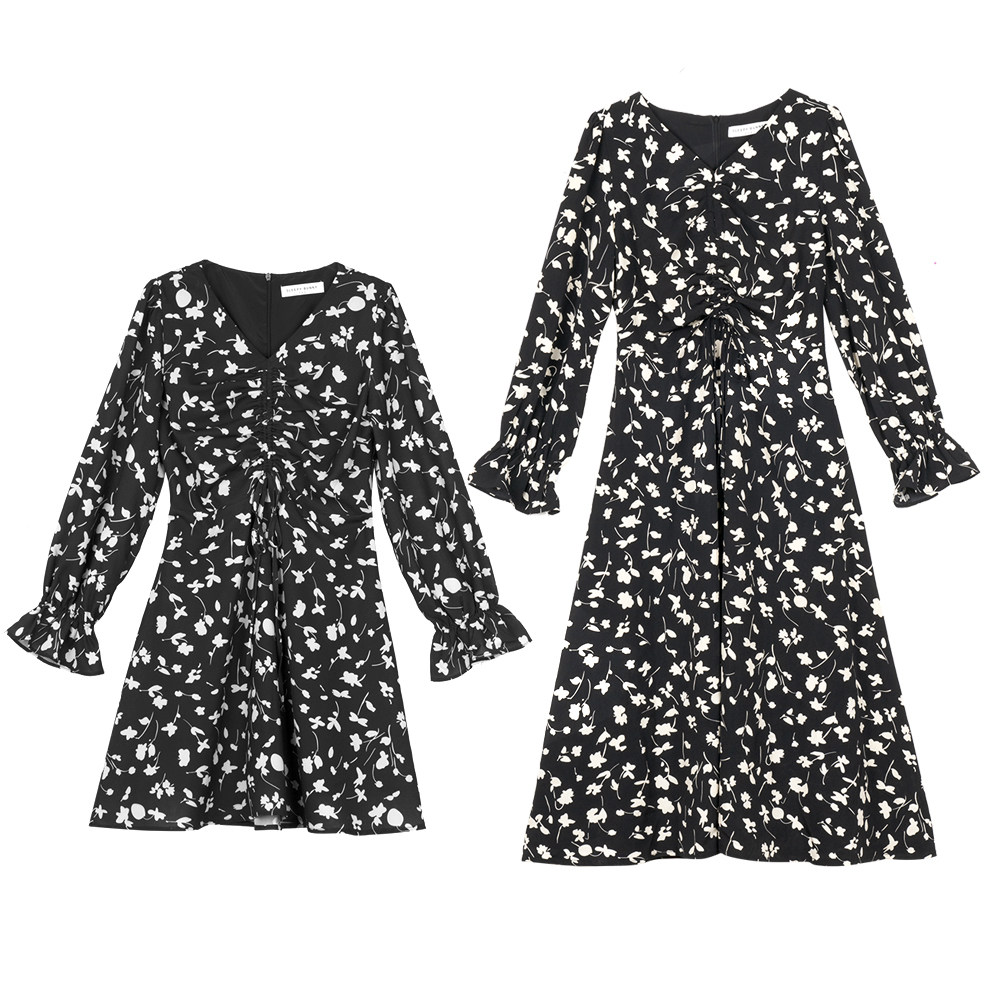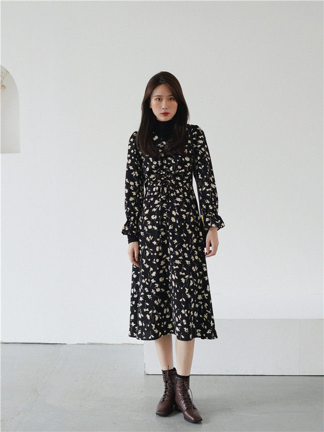 Осеннее длинное платье, в цветочек, 2020, на шнурках, V-образный вырез, средней длины