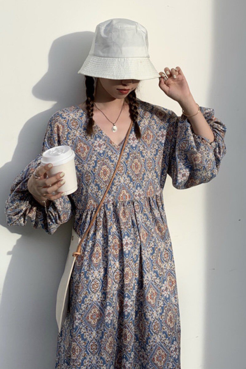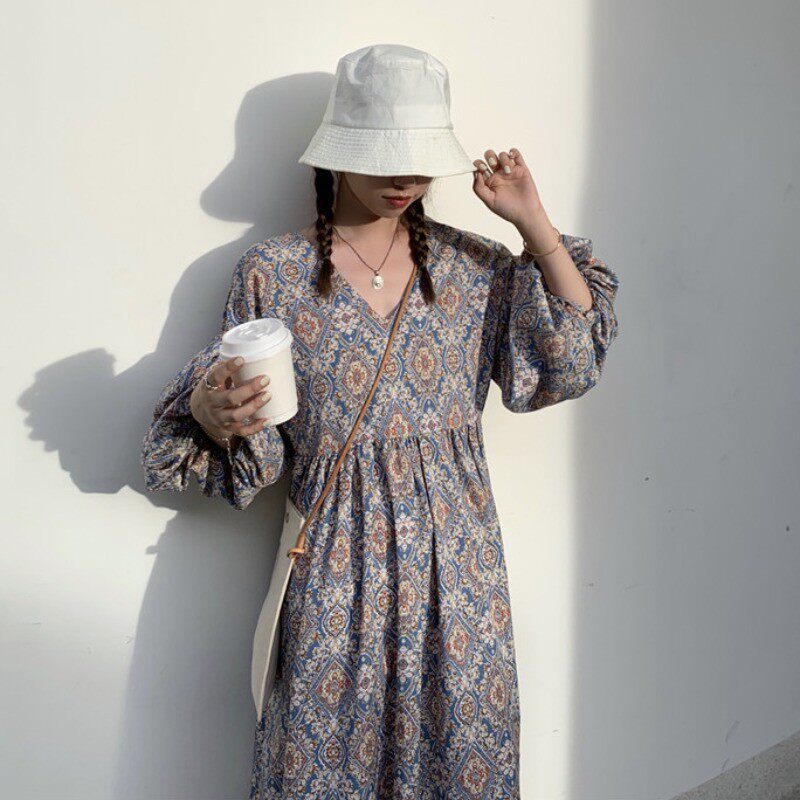 Осеннее платье, длинная ретро длинная юбка, в цветочек, 2020 года, французский стиль, V-образный вырез, яркий броский стиль, свободный крой, А-силуэт