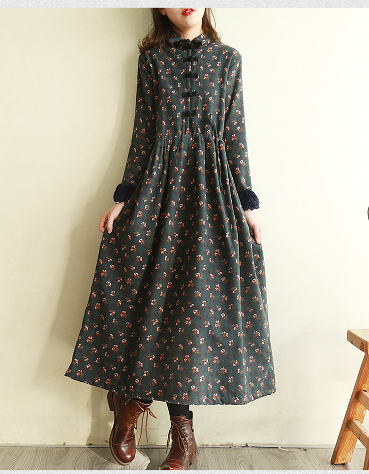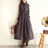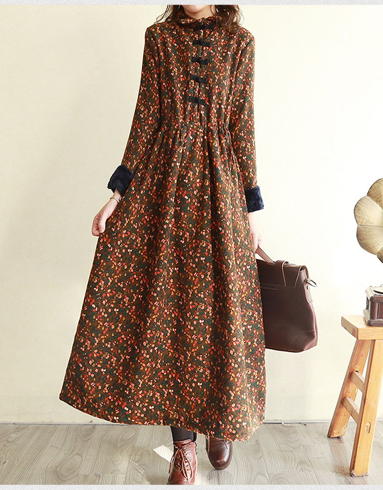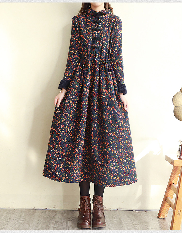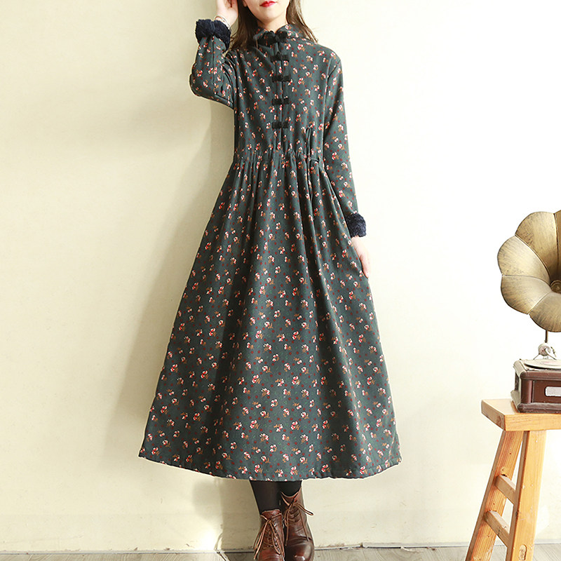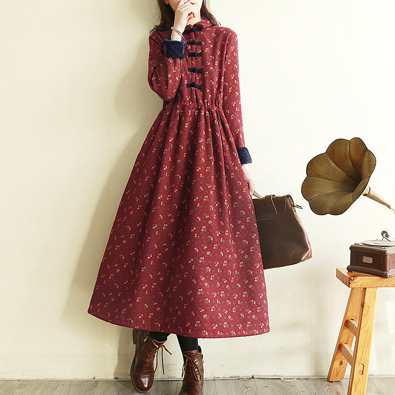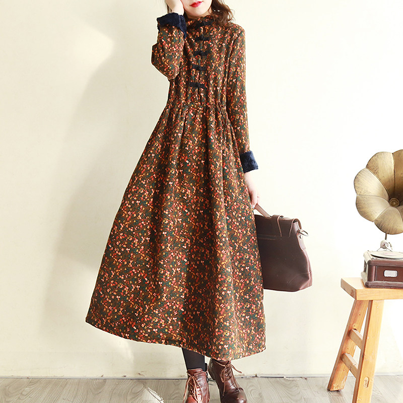 Ретро утепленное зимнее платье, длинная этническая юбка, цветочный принт, этнический стиль, из хлопка и льна, увеличенная толщина, свободный крой