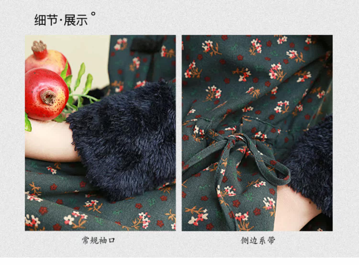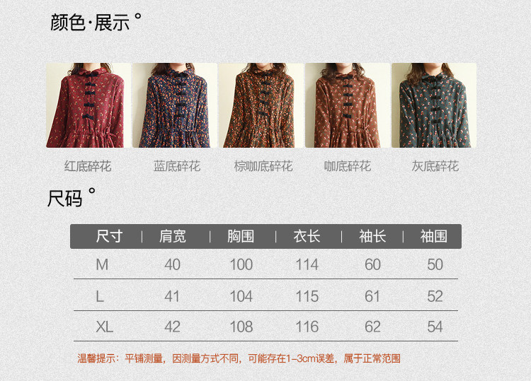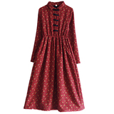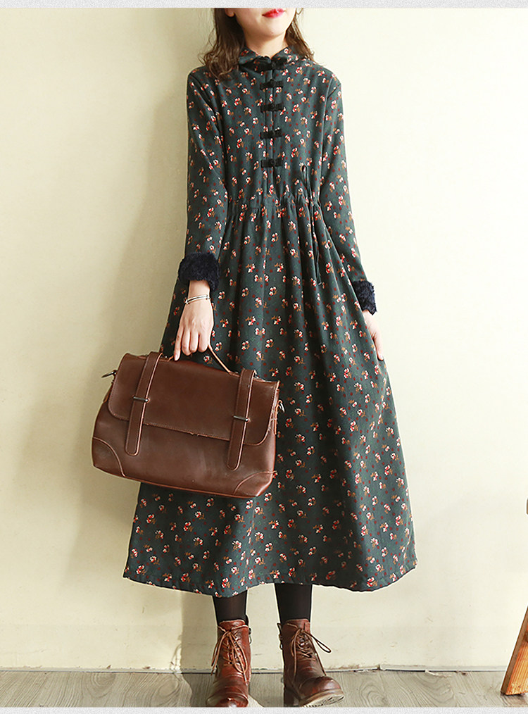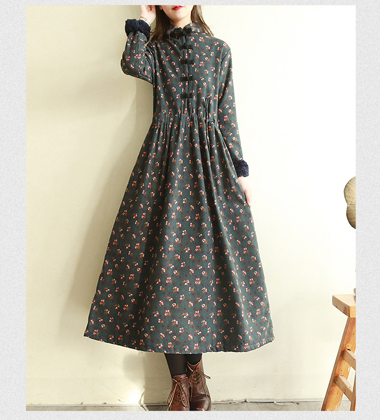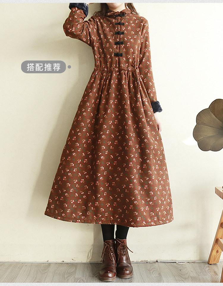 Ретро утепленное зимнее платье, длинная этническая юбка, цветочный принт, этнический стиль, из хлопка и льна, увеличенная толщина, свободный крой