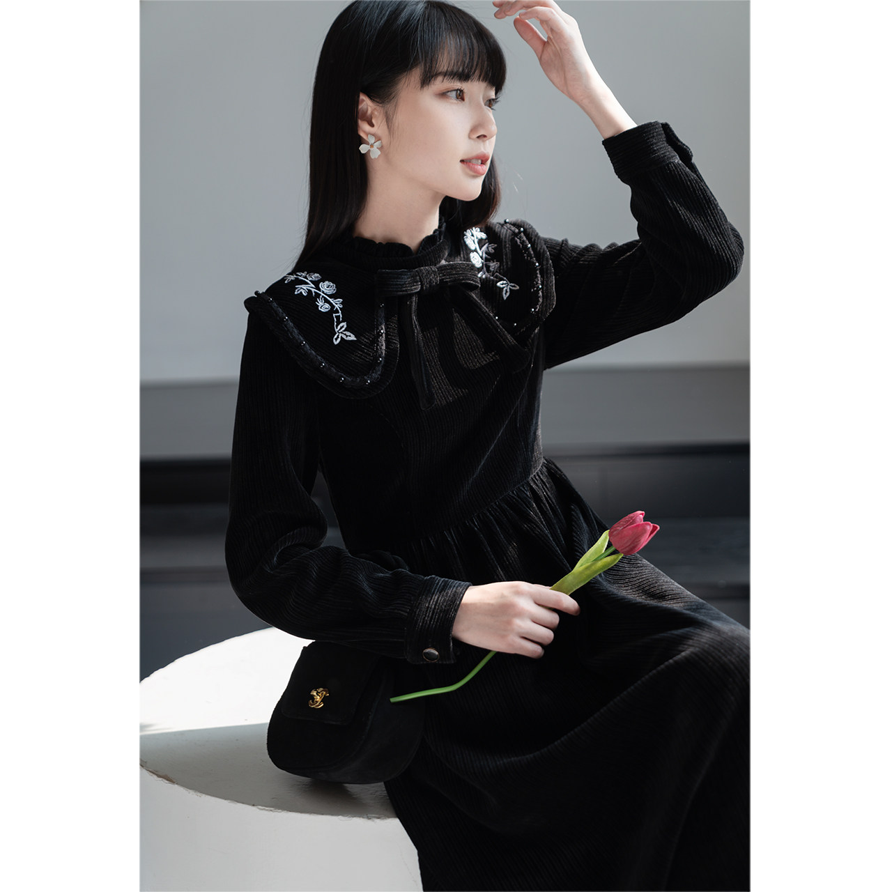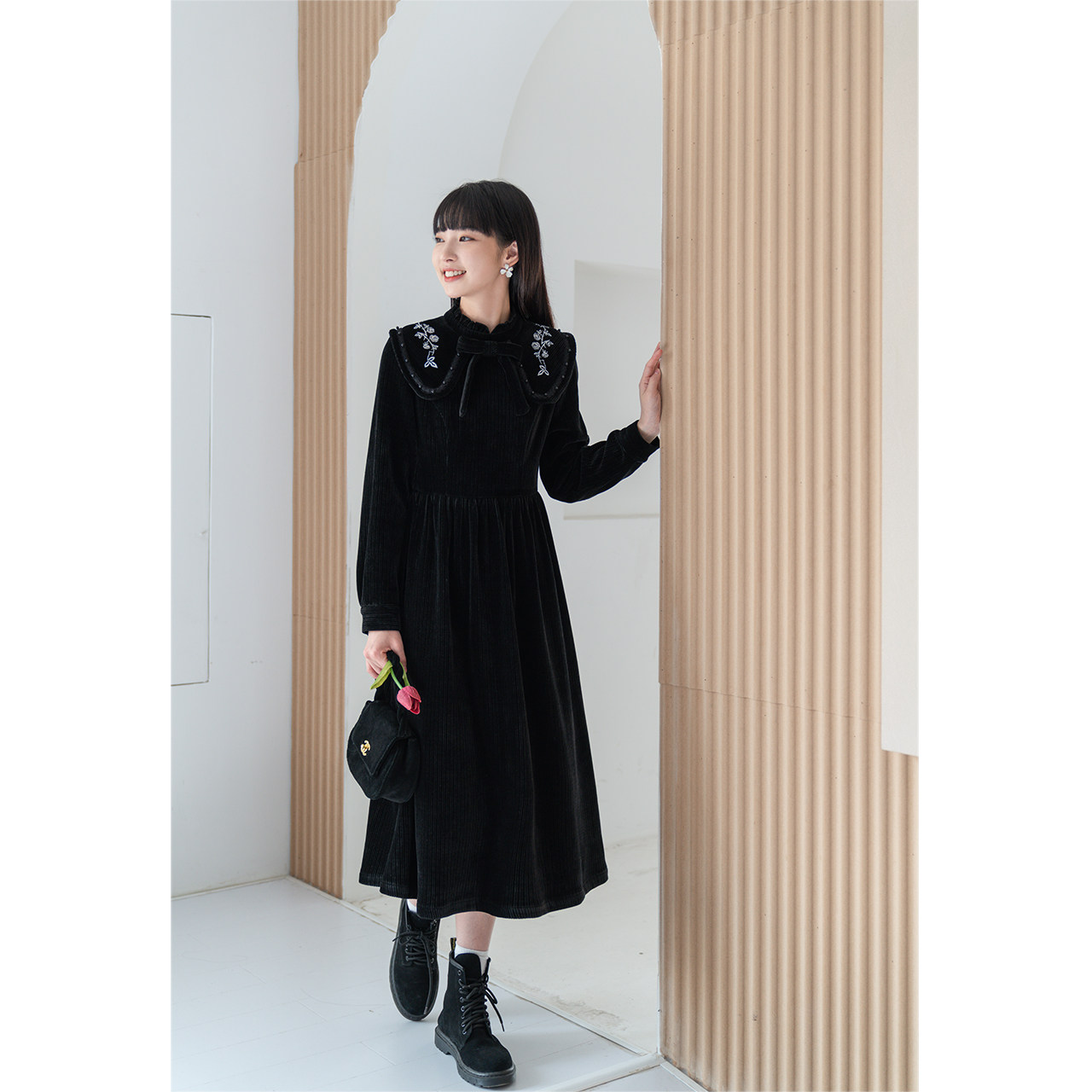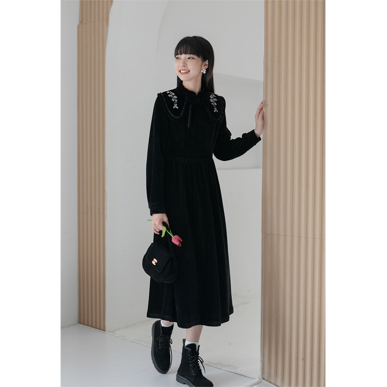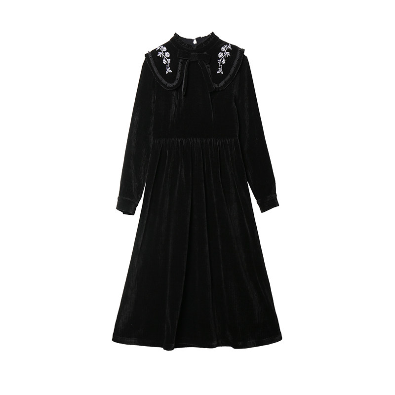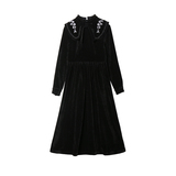 Черное вельветовое демисезонное дизайнерское ретро зимнее платье, коллекция 2023, тренд сезона, яркий броский стиль, французский стиль