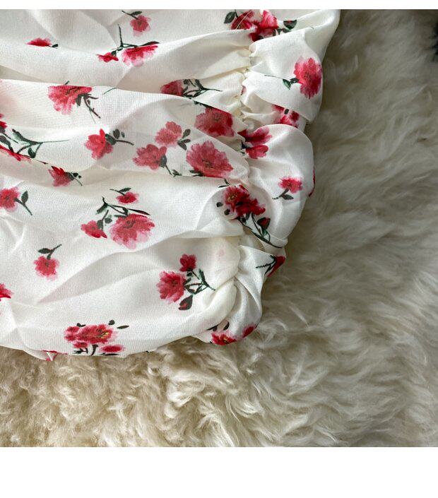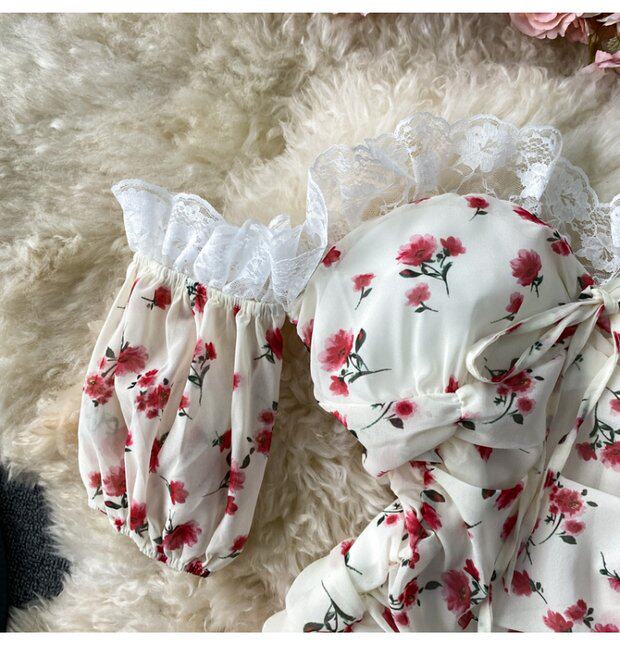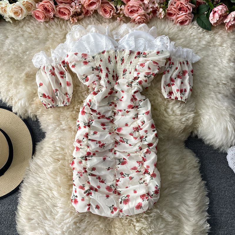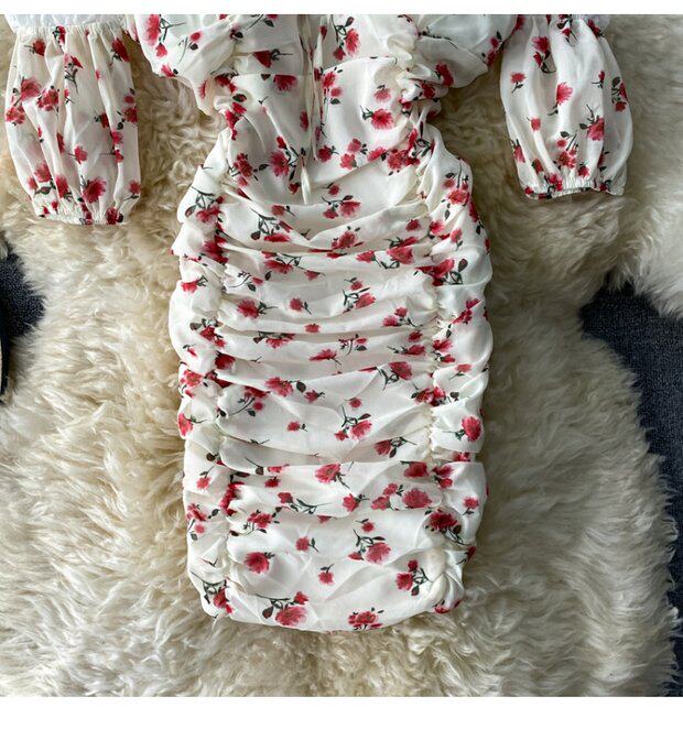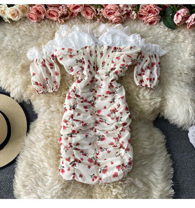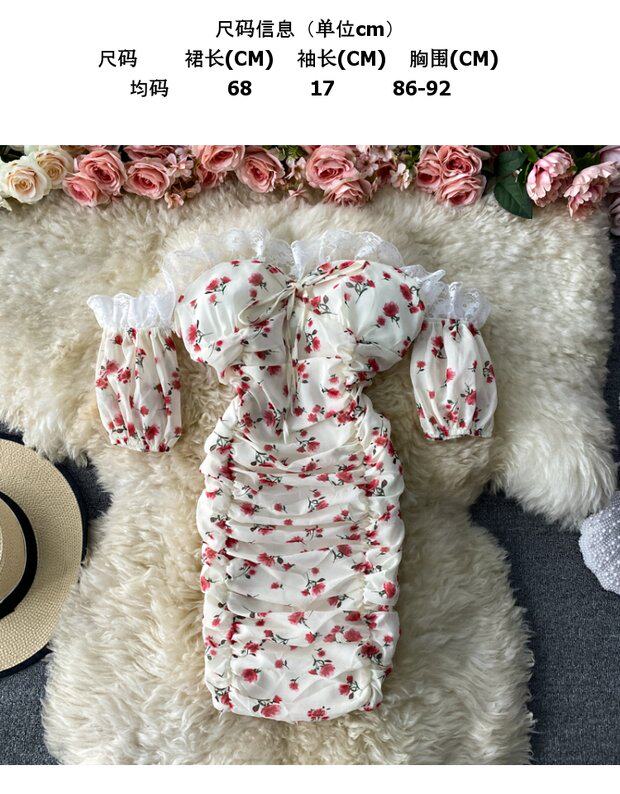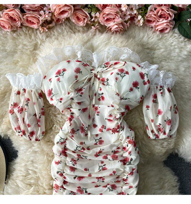 Платье, сексуальная юбка, мини-юбка, французский стиль, открытые плечи, с акцентом на бедрах, облегающий крой, цветочный принт