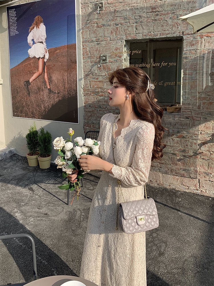 Демисезонное кружевное платье, длинная юбка, французский стиль, яркий броский стиль, по фигуре