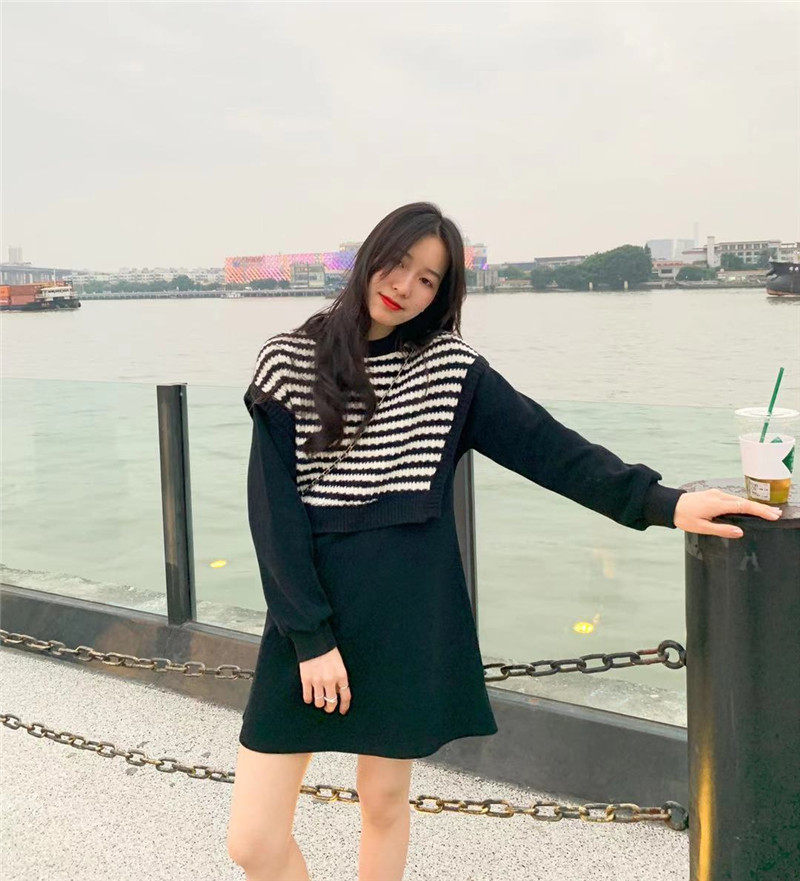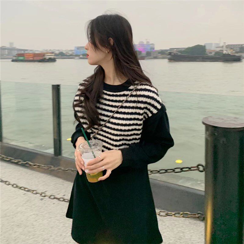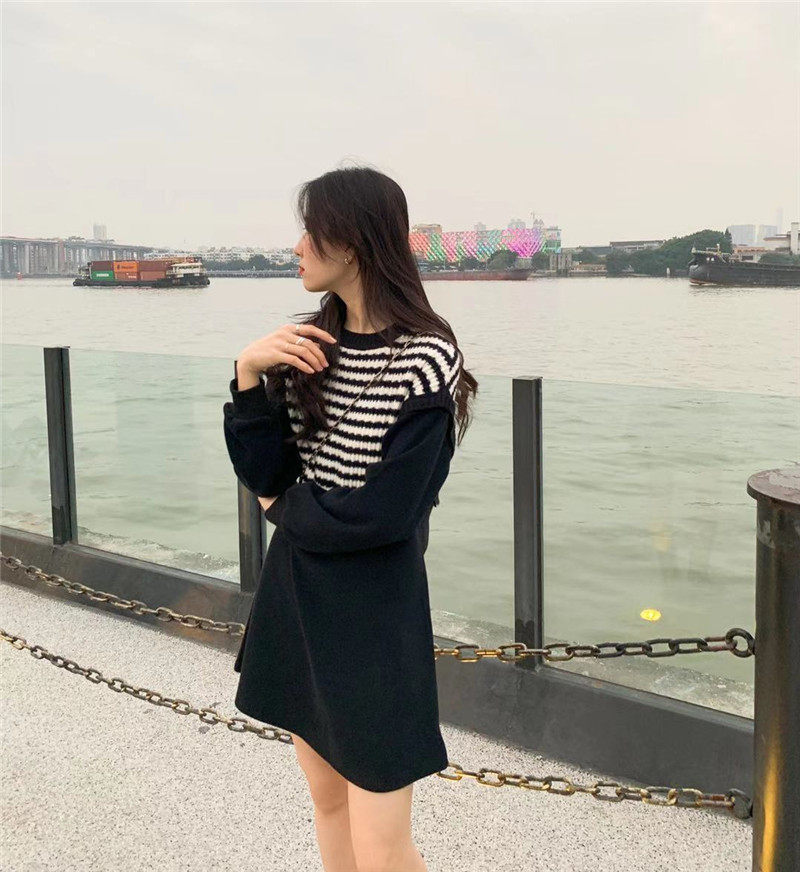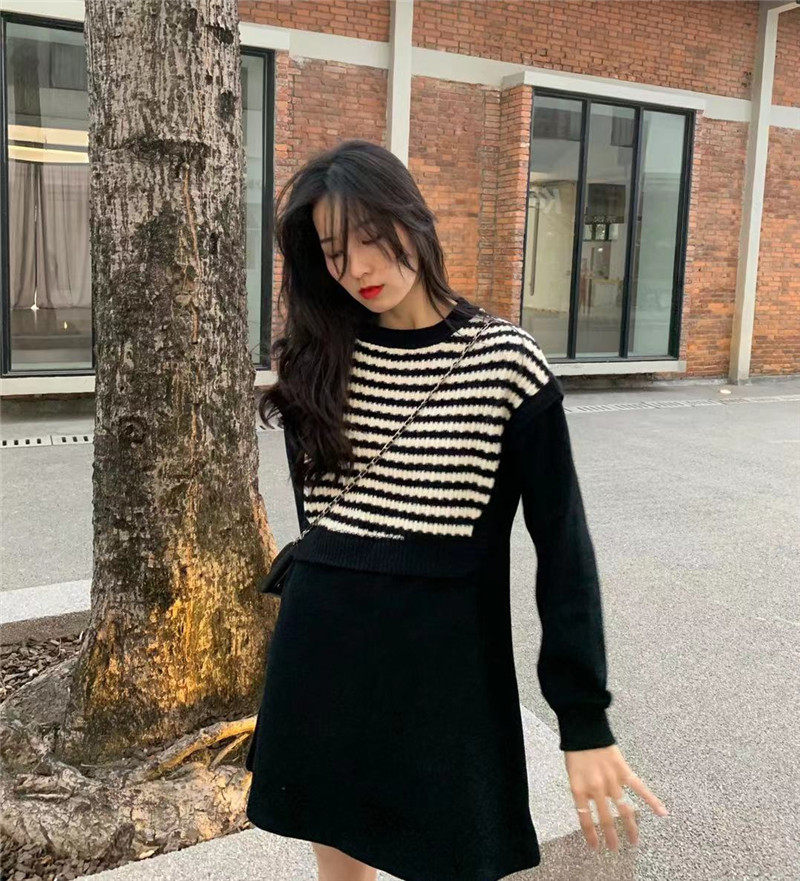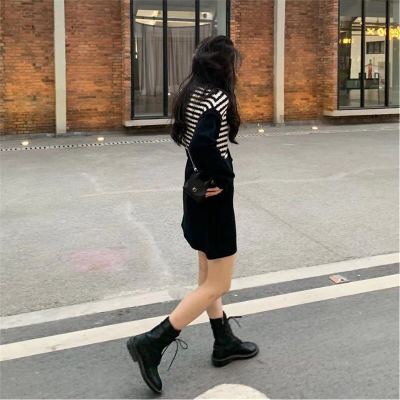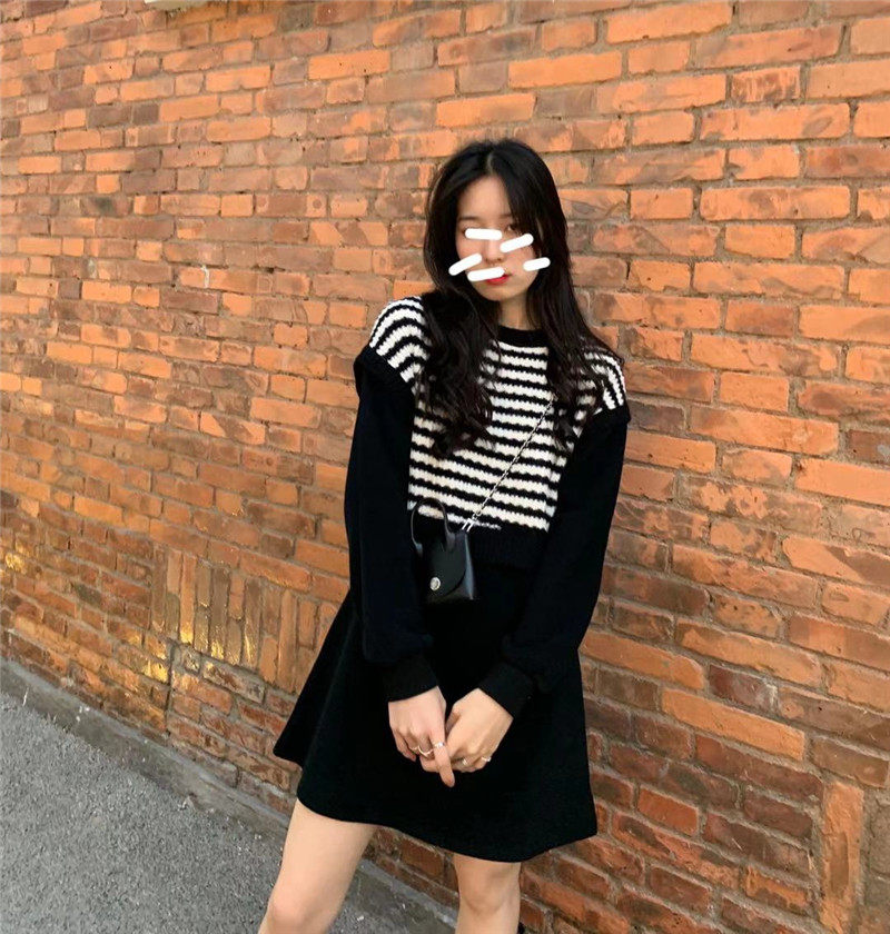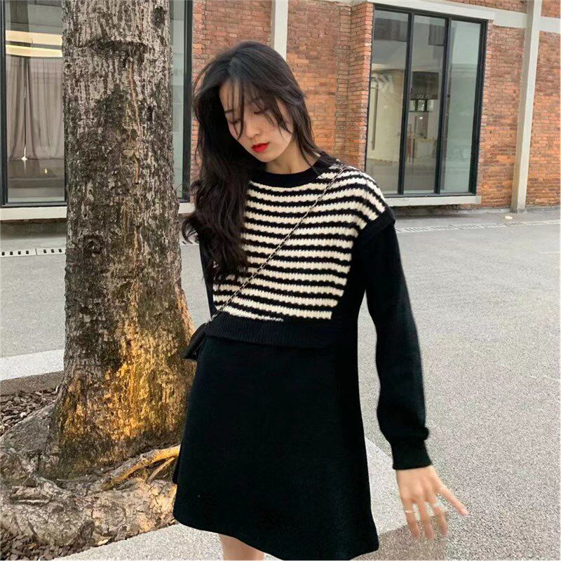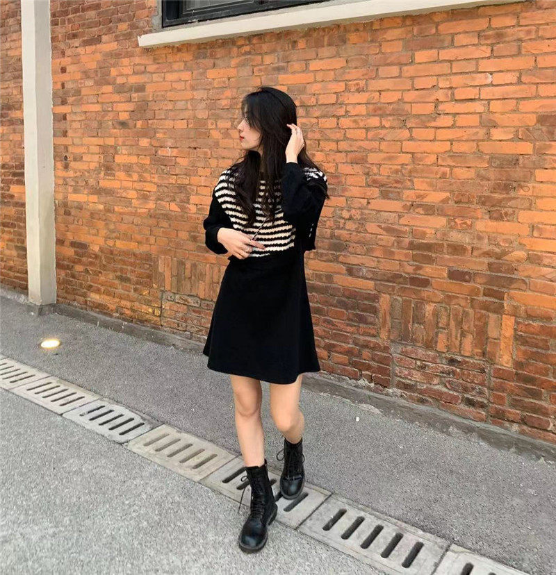 Осенний модный черный лонгслив, трикотажный комплект, платье, юбка, яркий броский стиль, подходит для подростков