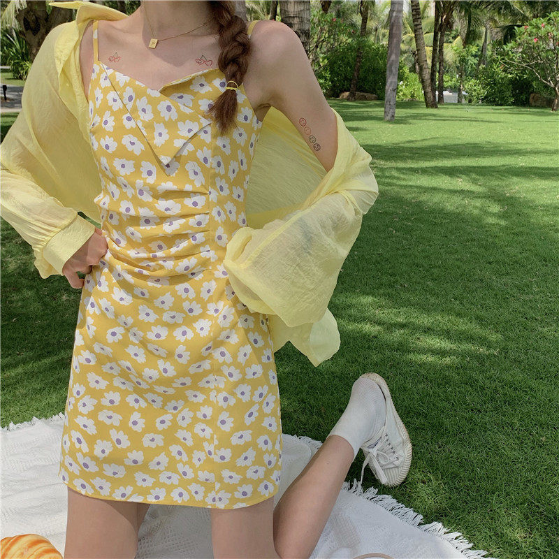 Желтое платье, шифоновое платье-комбинация, мини-юбка, 2021 года, цветочный принт