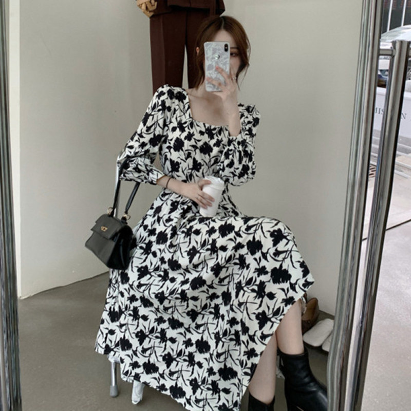 Осеннее платье, приталенный ретро корсет, французский стиль, в корейском стиле, квадратный вырез