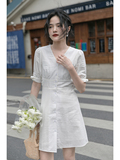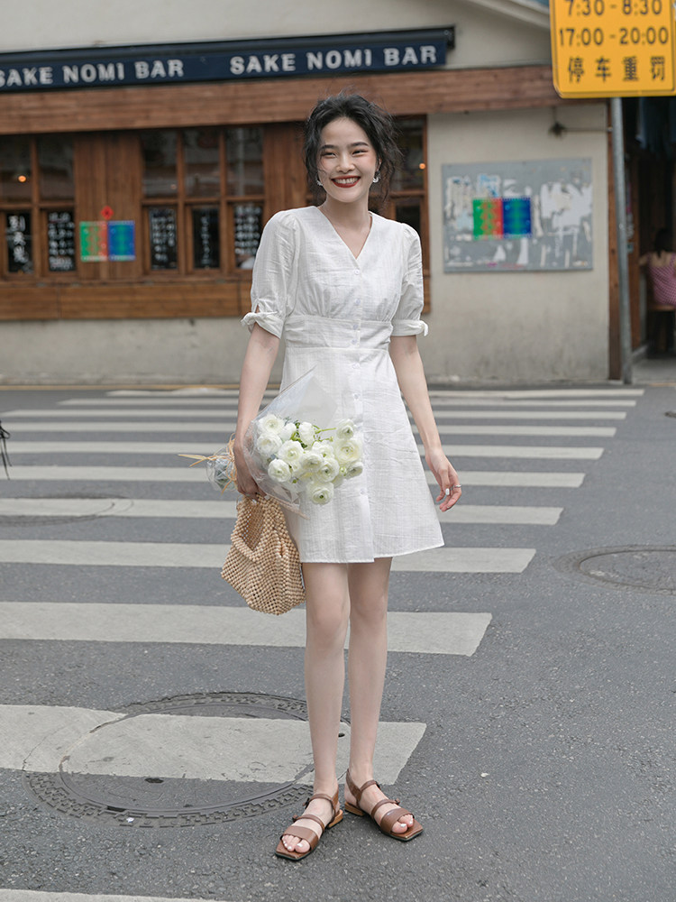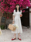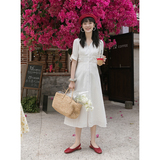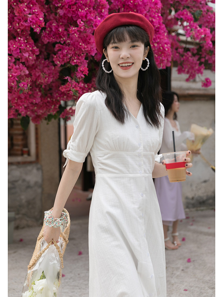Белое летнее платье, ретро юбка, французский стиль, V-образный вырез, А-силуэт, подходит для подростков