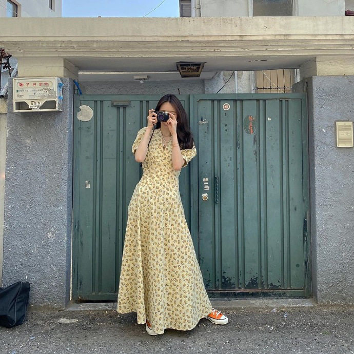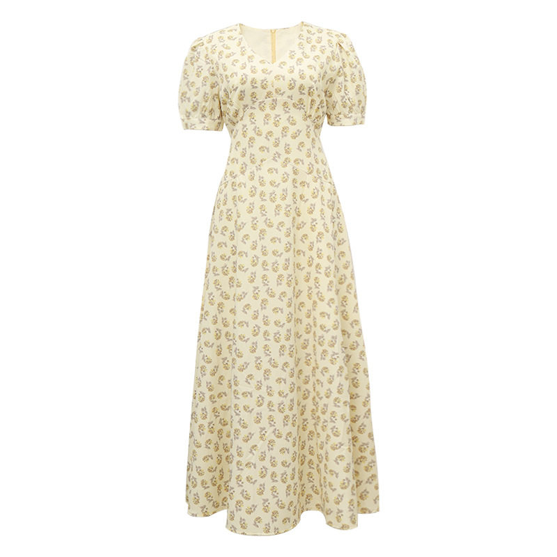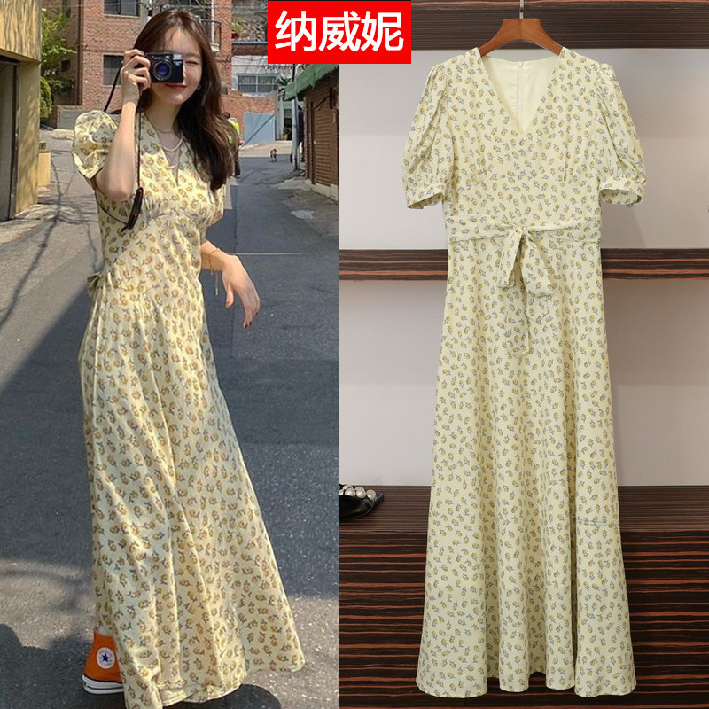 Желтое летнее платье, длинная юбка, рукава фонарики, V-образный вырез