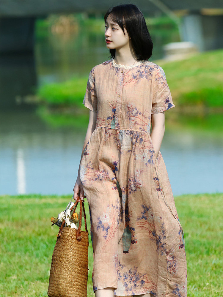 Оригинальное элитное летнее платье, длинная длинная юбка, средней длины, цветочный принт, из хлопка и льна