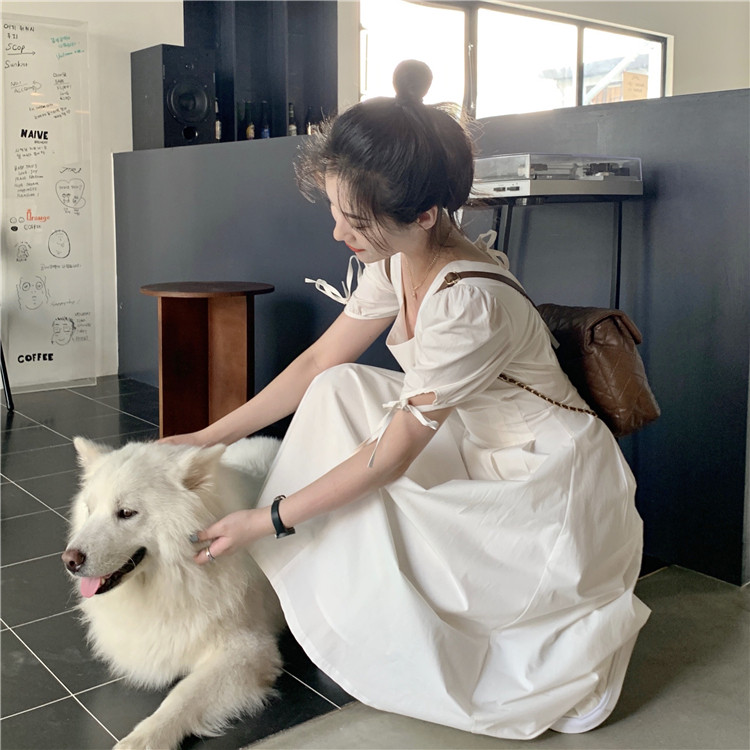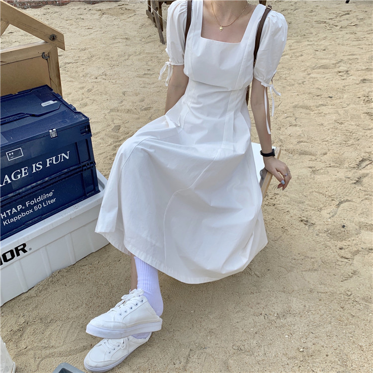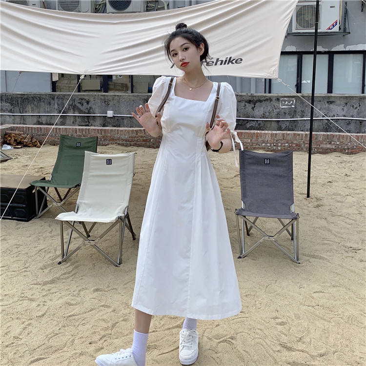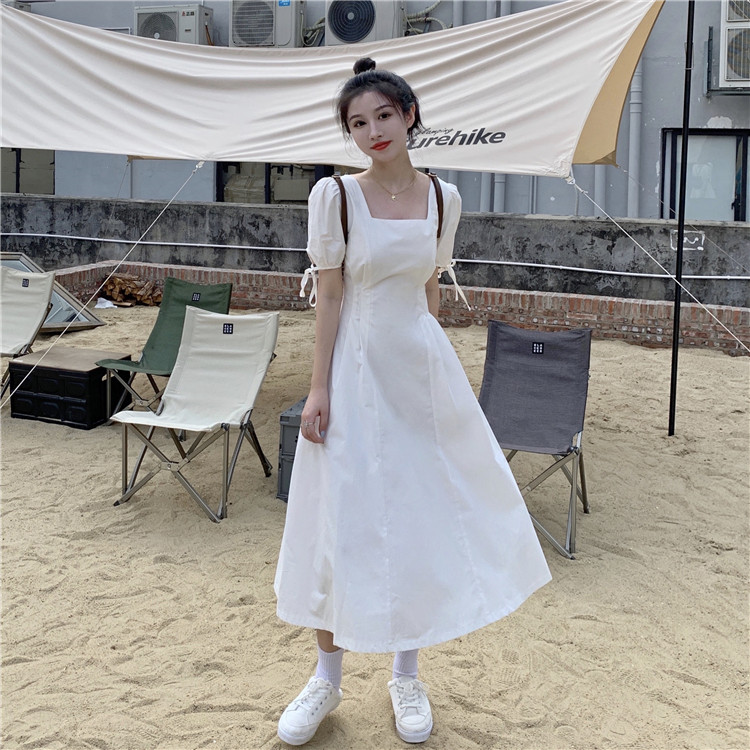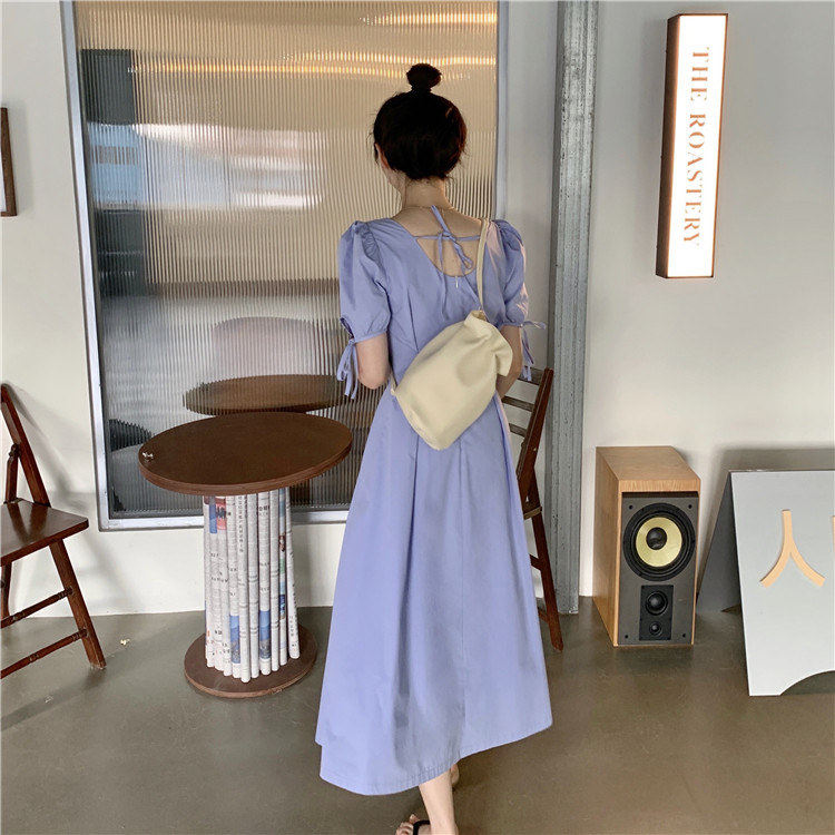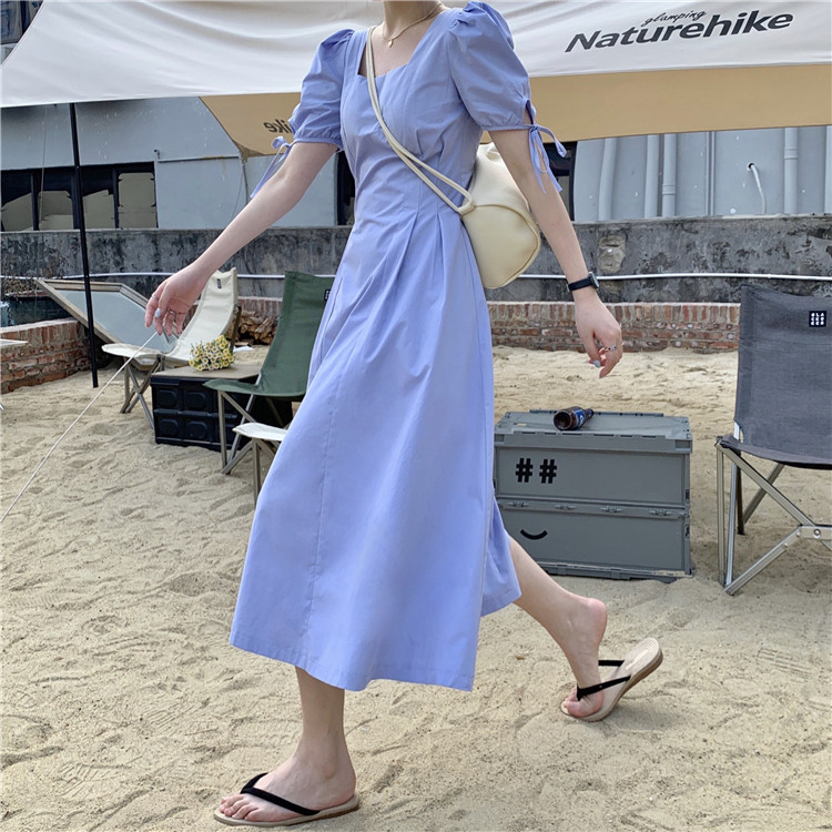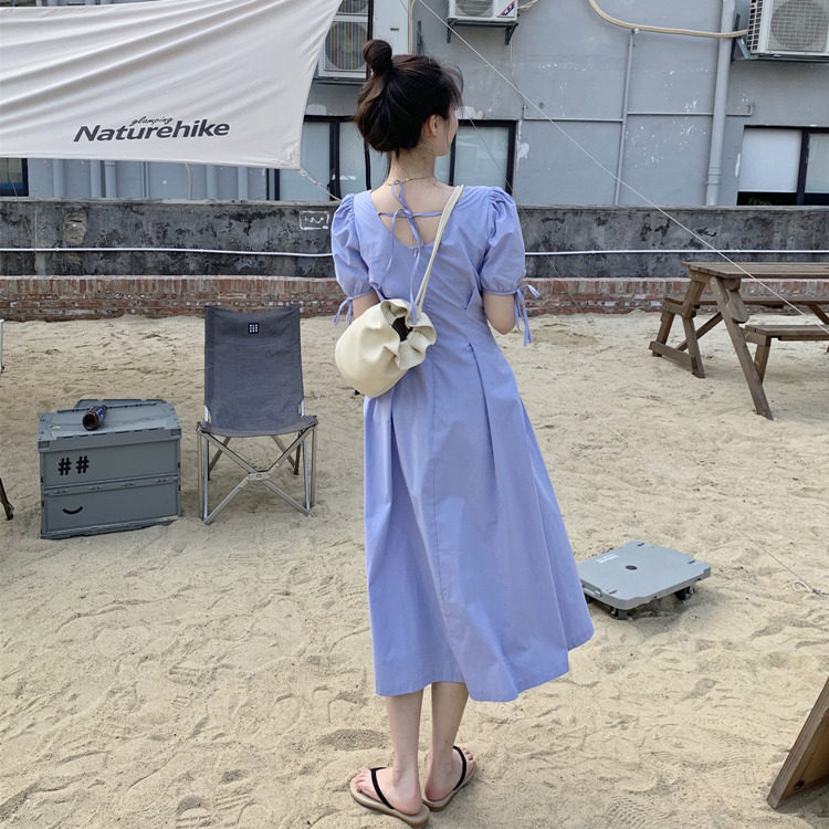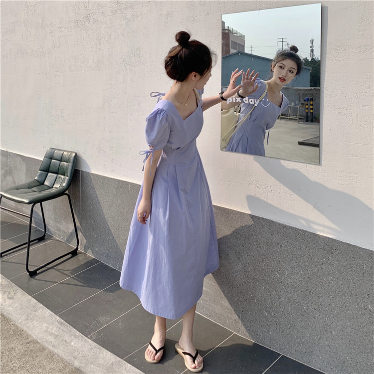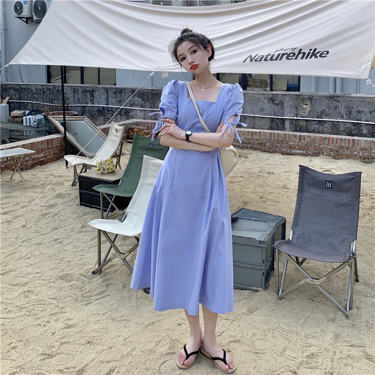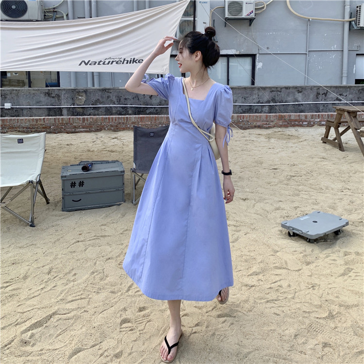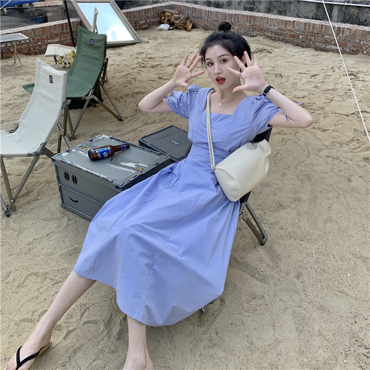 Сиреневая длинная юбка, дизайнерское летнее платье, средней длины, французский стиль, квадратный вырез, тренд сезона