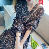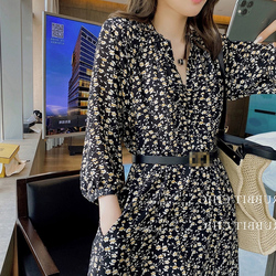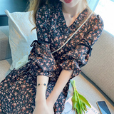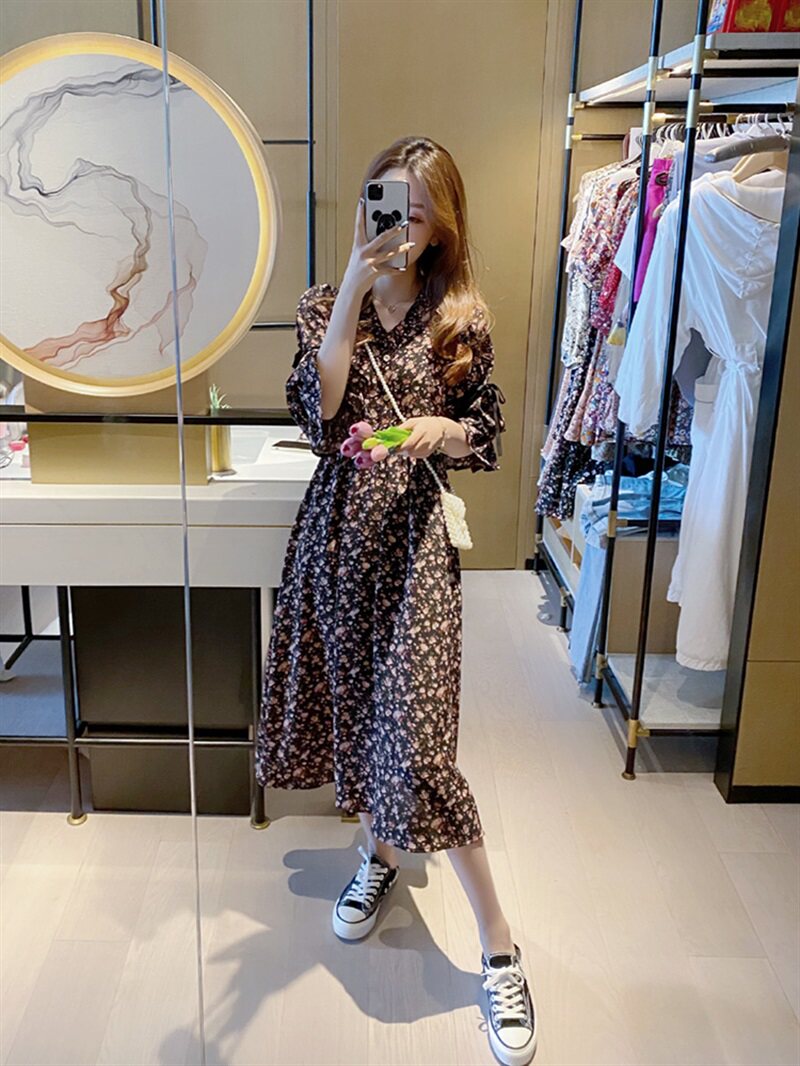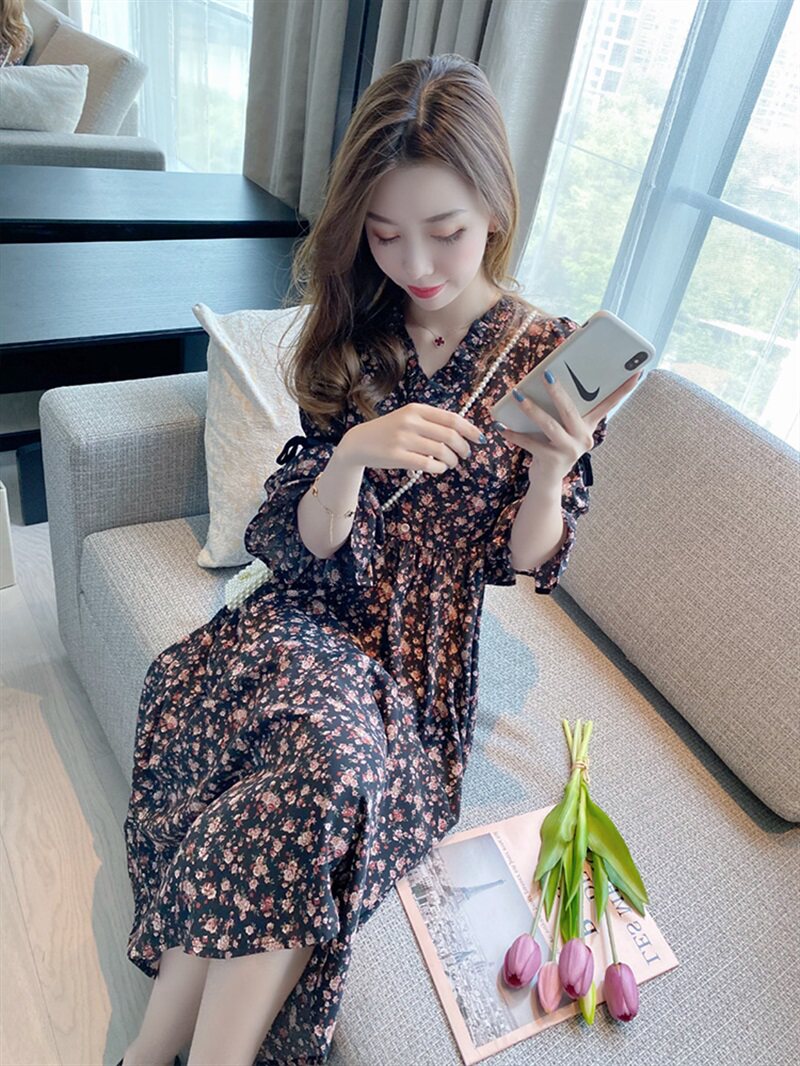 Осенняя базовая длинная юбка, шифоновый лонгслив, черное платье, коллекция 2023, французский стиль, подходит для подростков, в цветочек