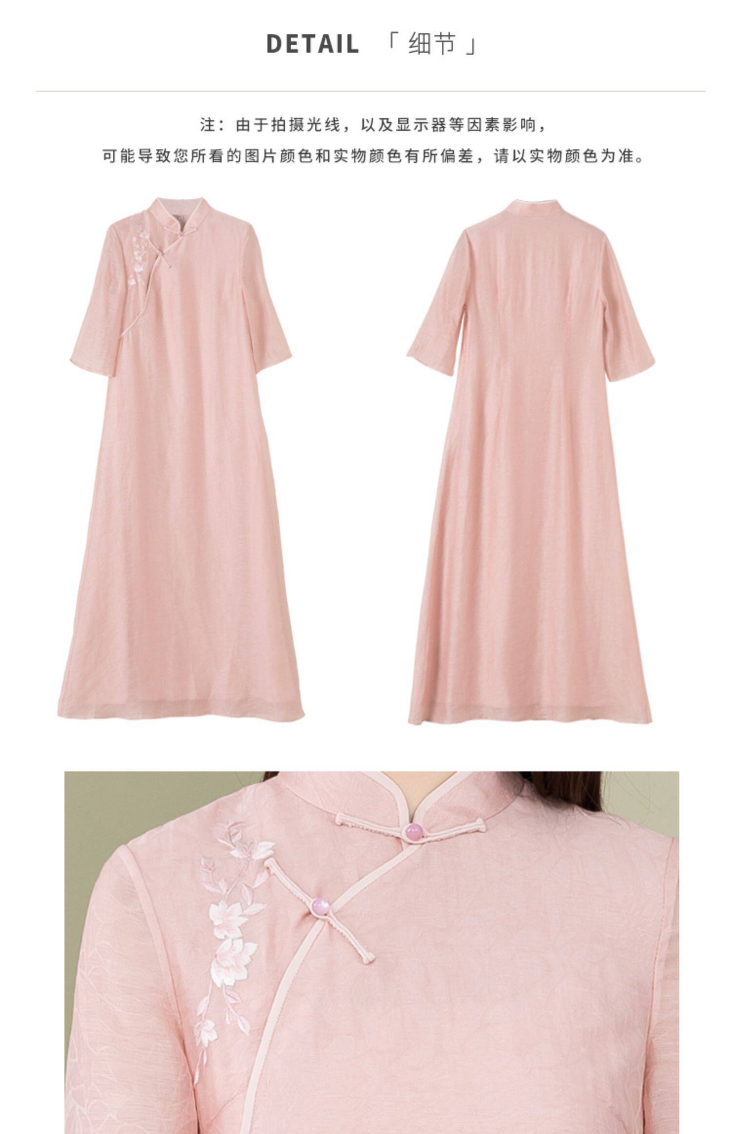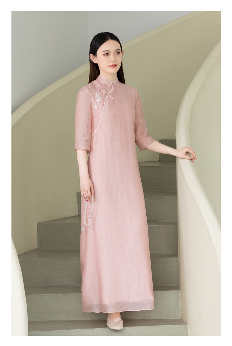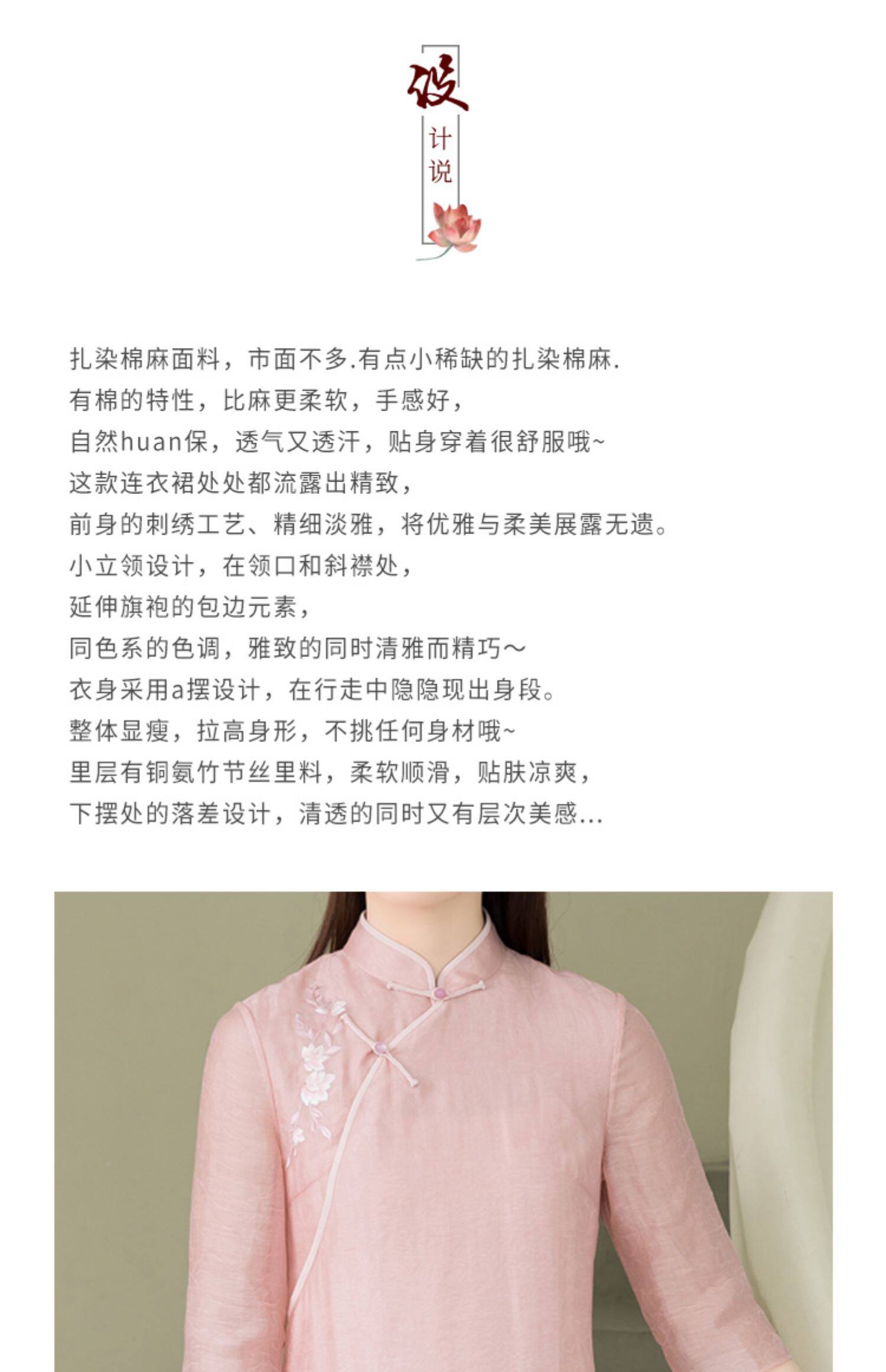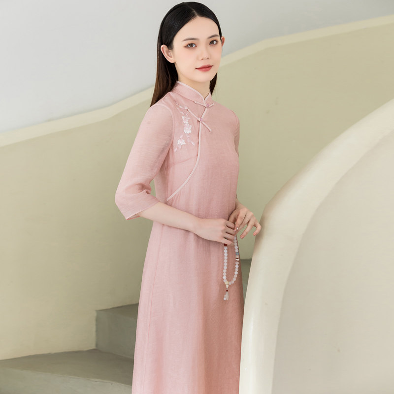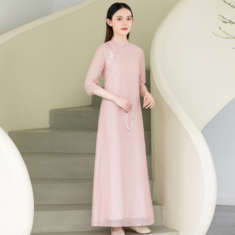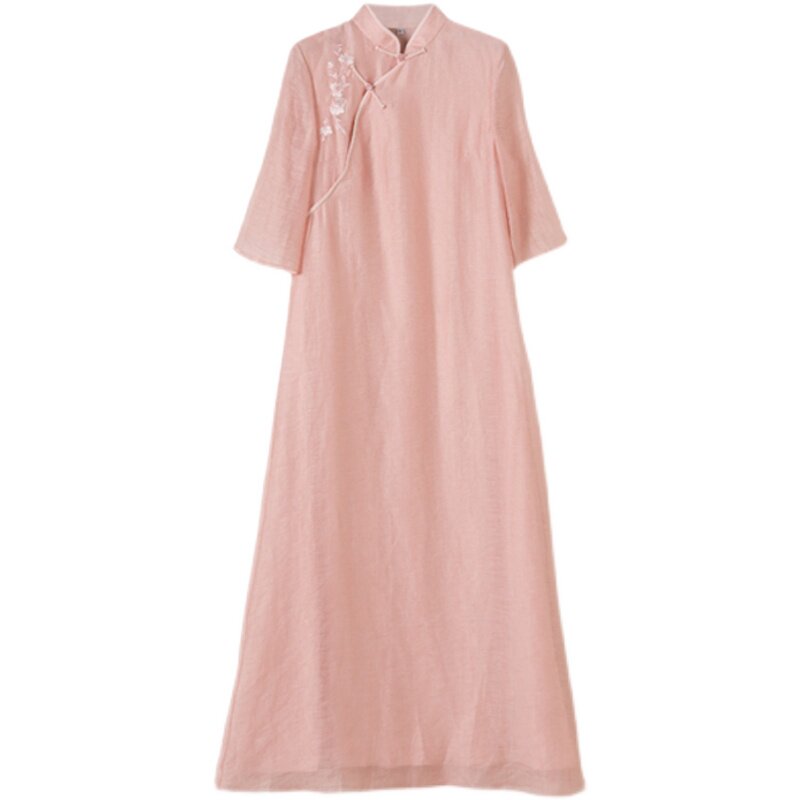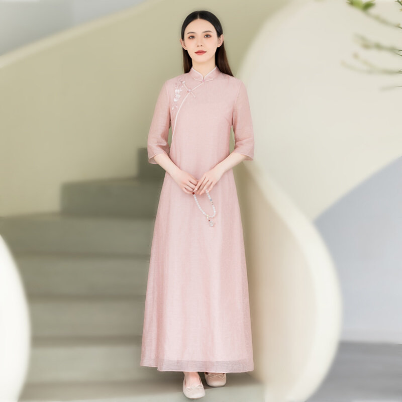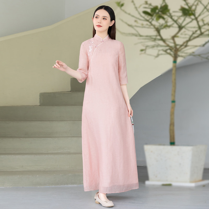 Летнее ципао, платье, ретро юбка, китайский стиль, из хлопка и льна, с вышивкой