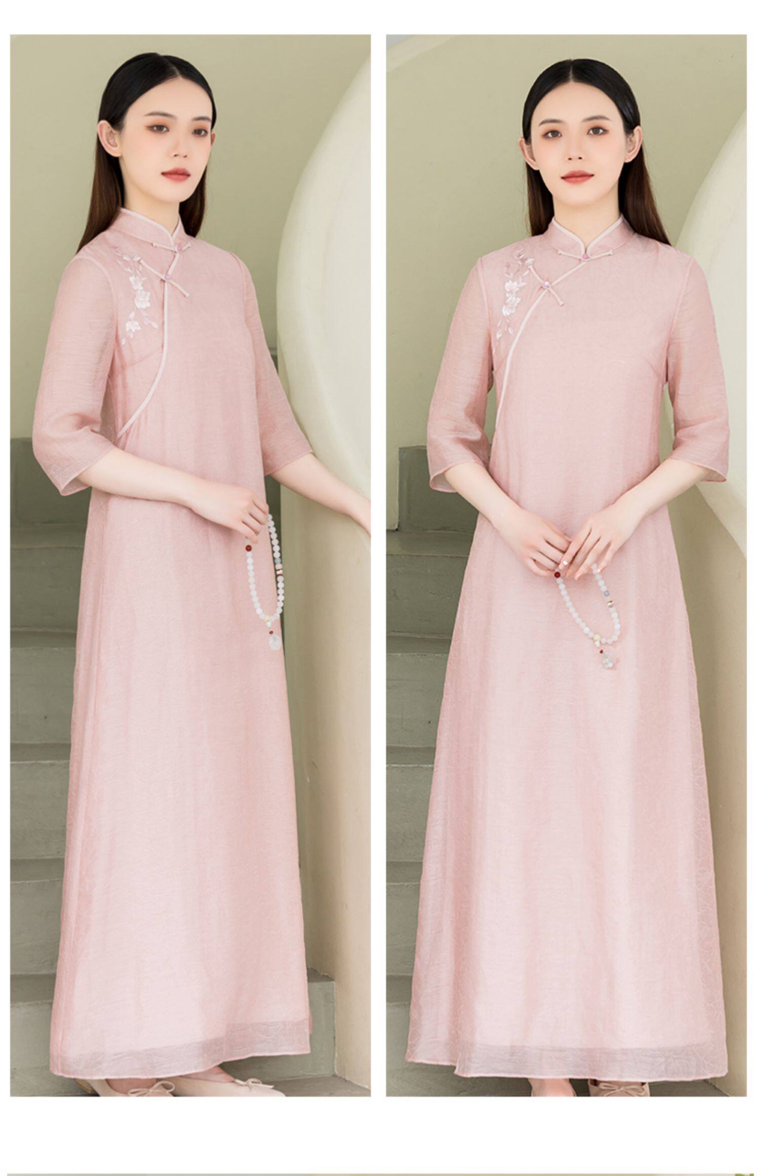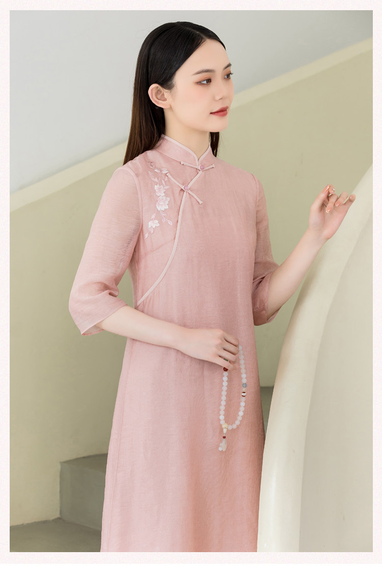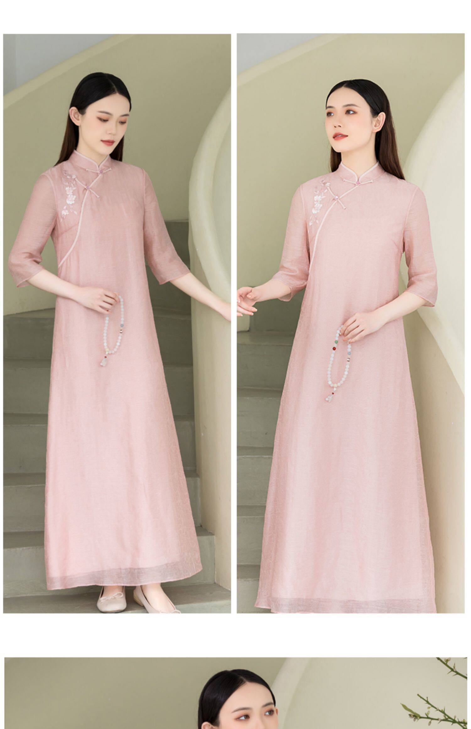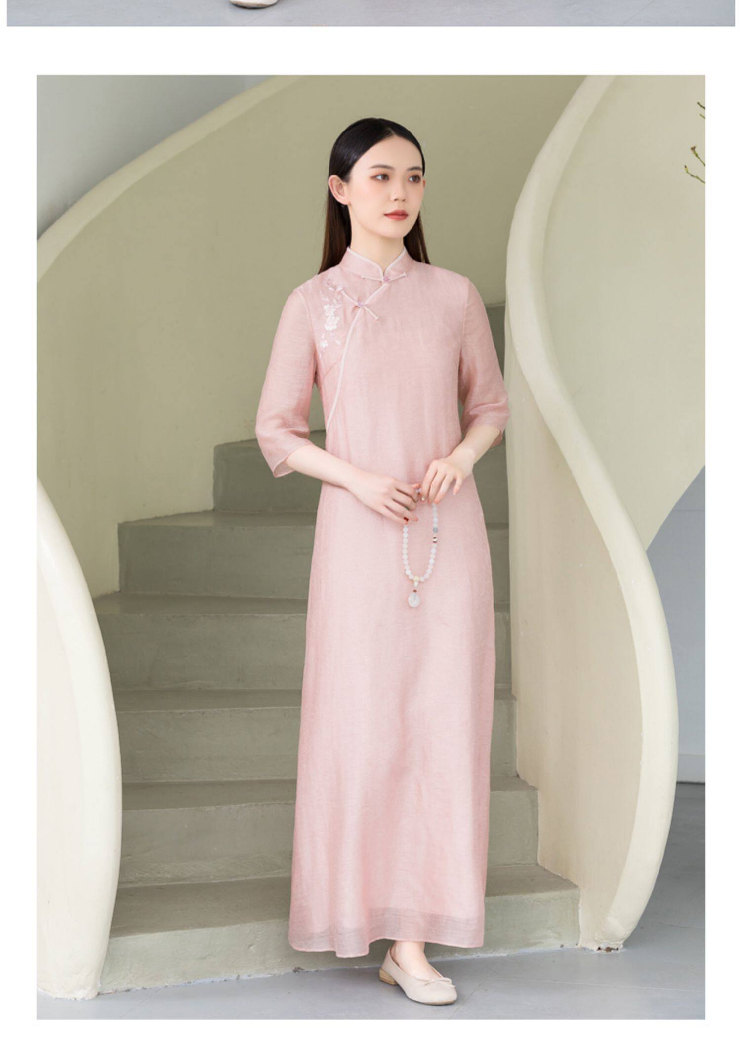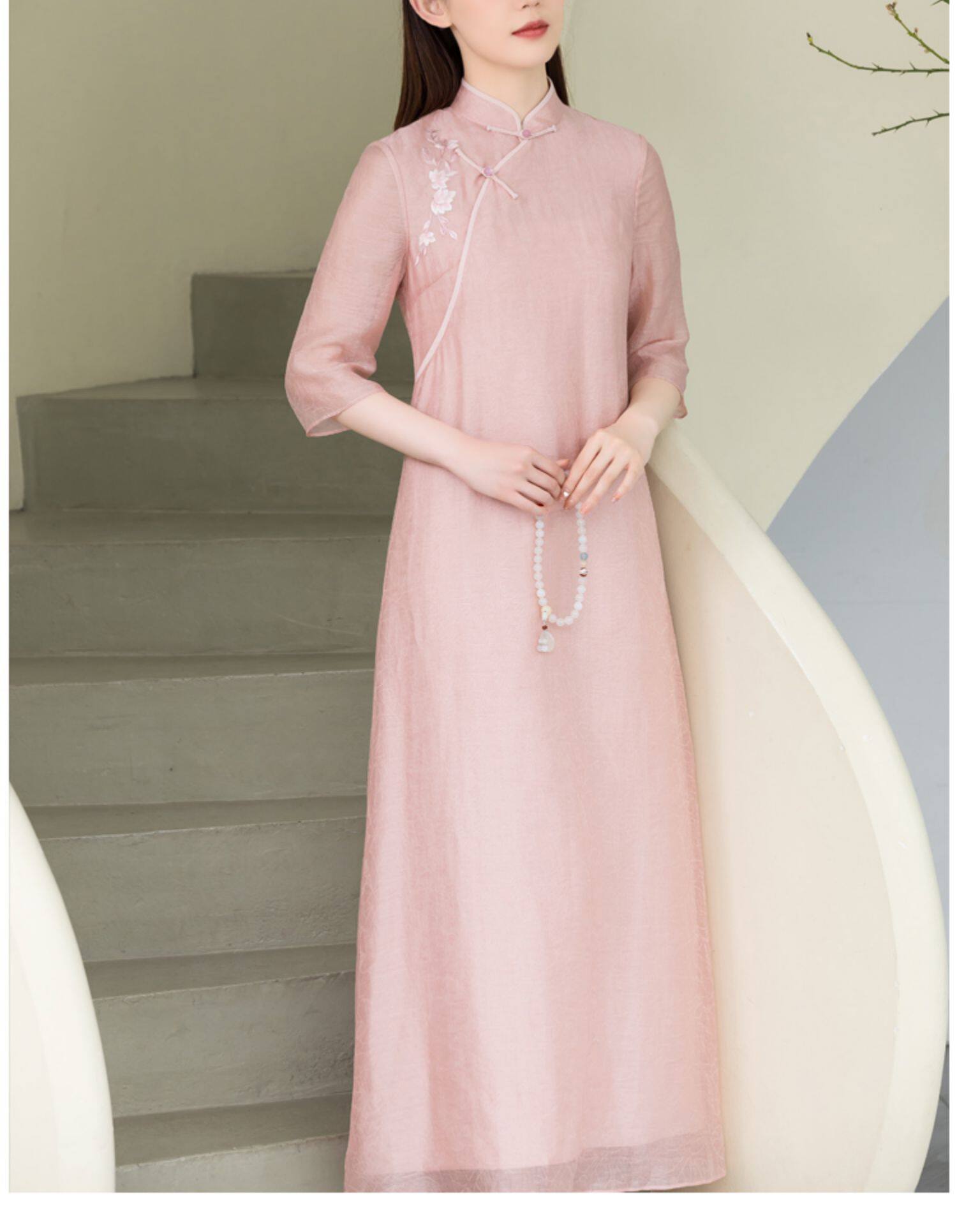 Летнее ципао, платье, ретро юбка, китайский стиль, из хлопка и льна, с вышивкой