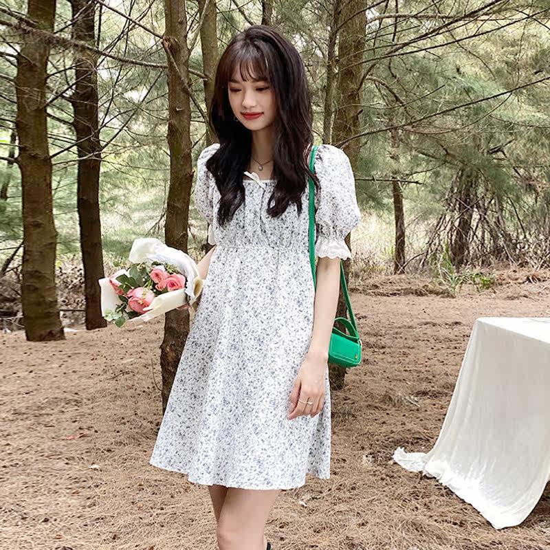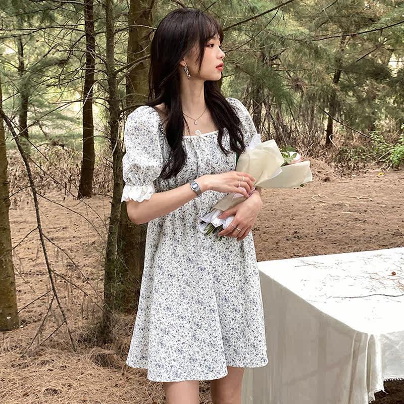 Юбка, платье, в цветочек, подходит для подростков, французский стиль, А-силуэт, квадратный вырез