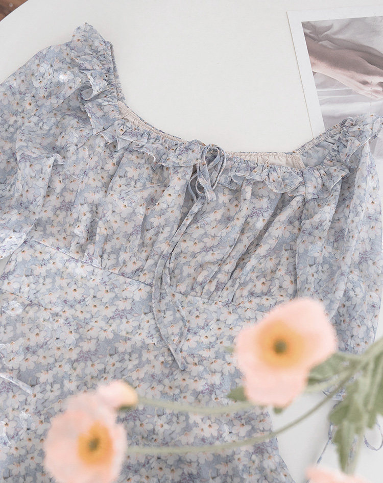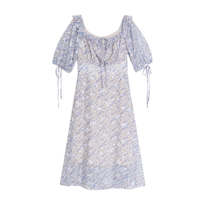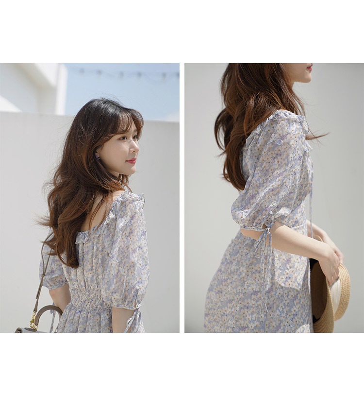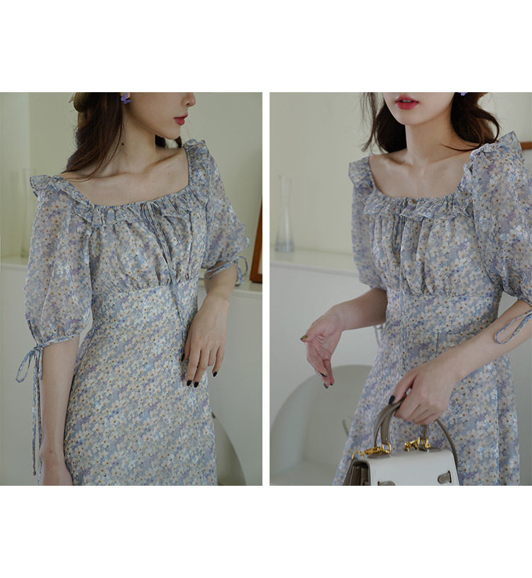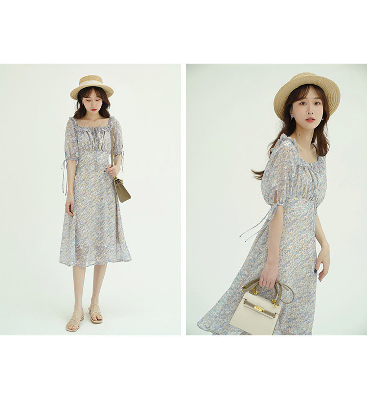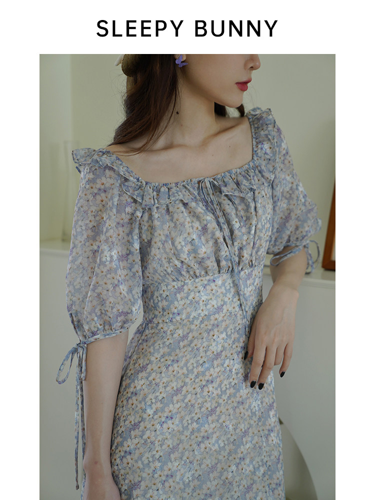Шифоновое платье, юбка, квадратный вырез, высокая талия