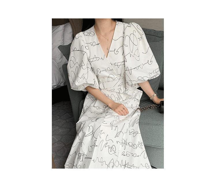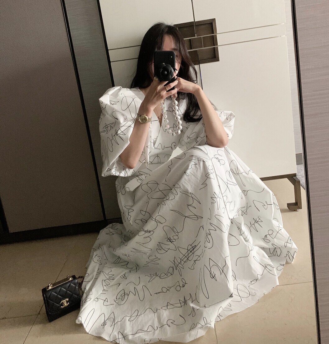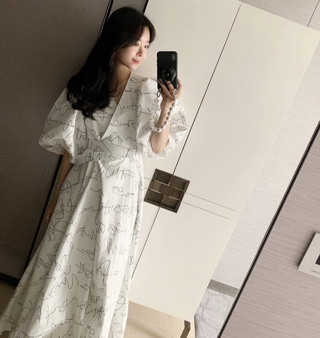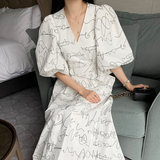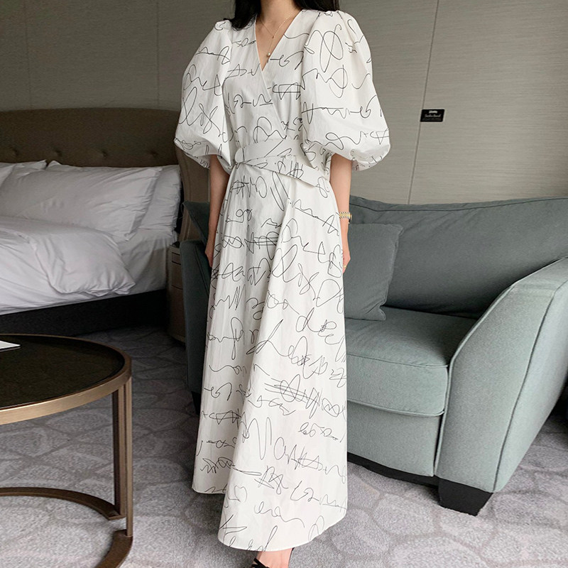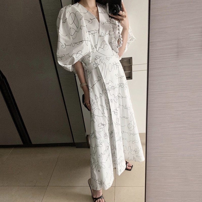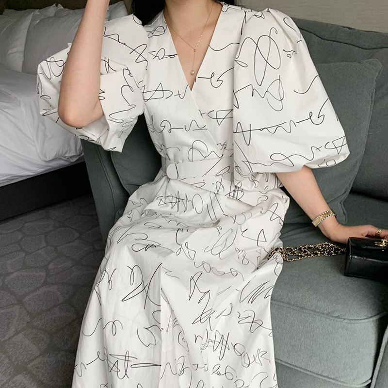 Элегантный длинный фонарь, платье, в корейском стиле, французский стиль, V-образный вырез, высокая талия, средней длины, граффити