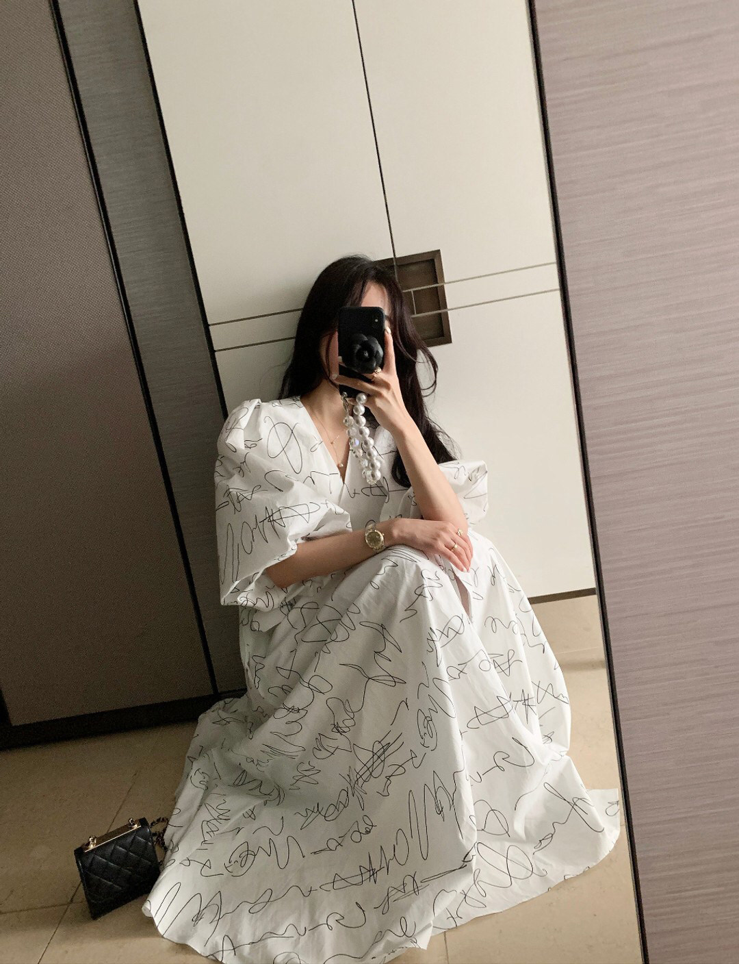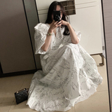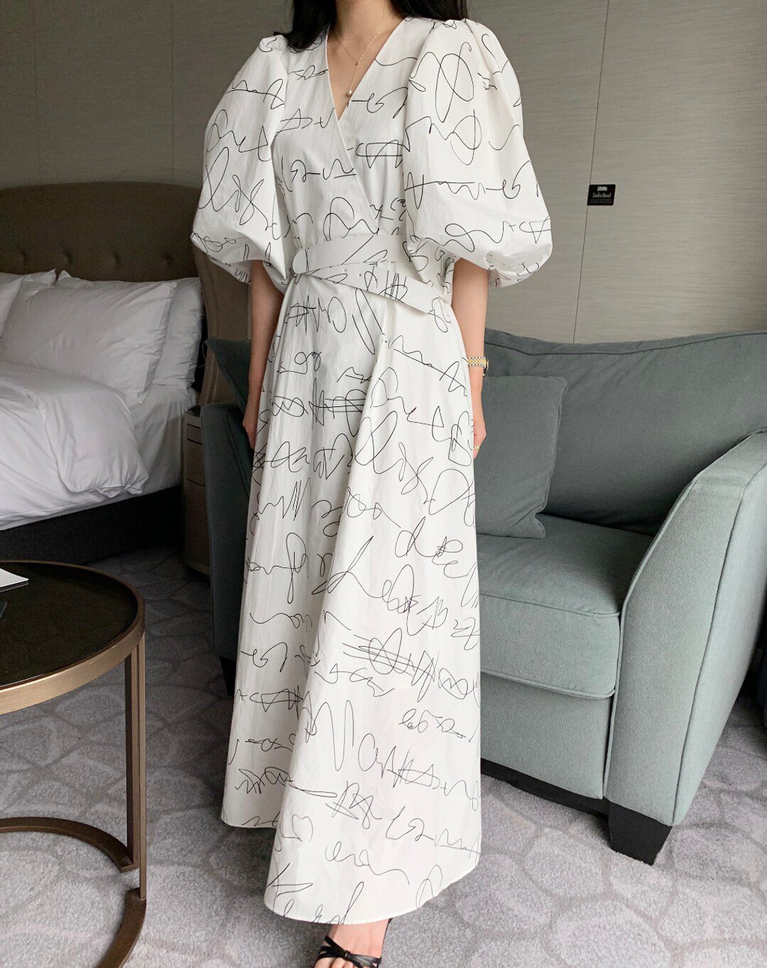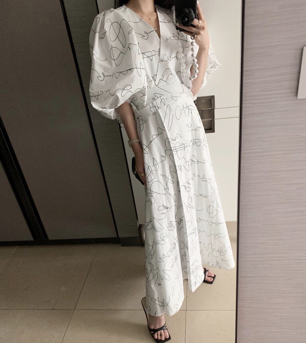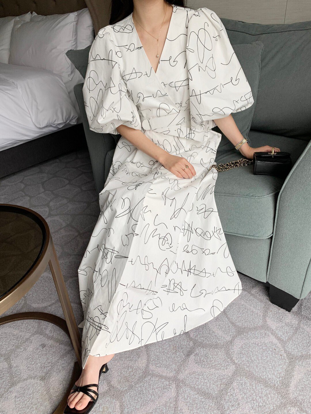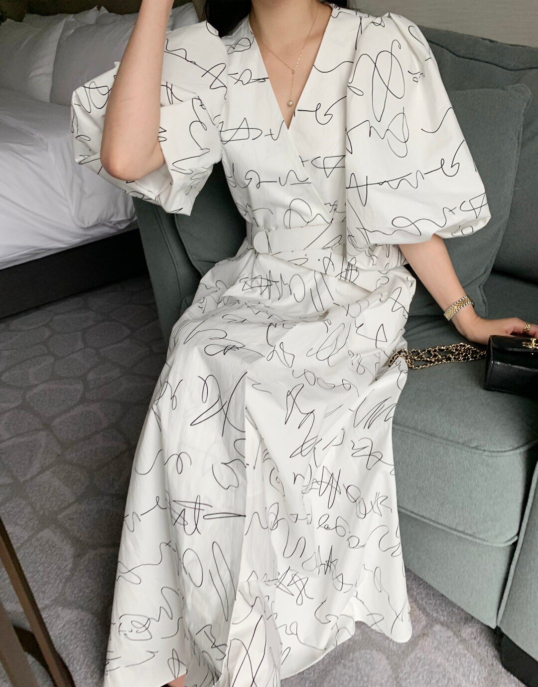 Элегантный длинный фонарь, платье, в корейском стиле, французский стиль, V-образный вырез, высокая талия, средней длины, граффити