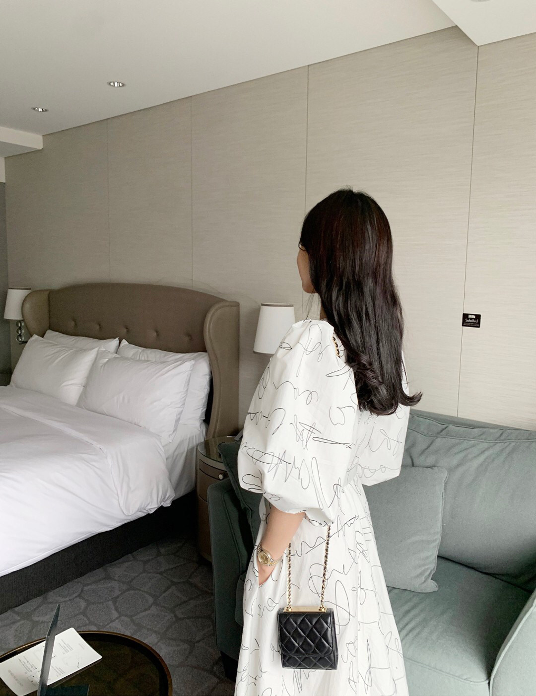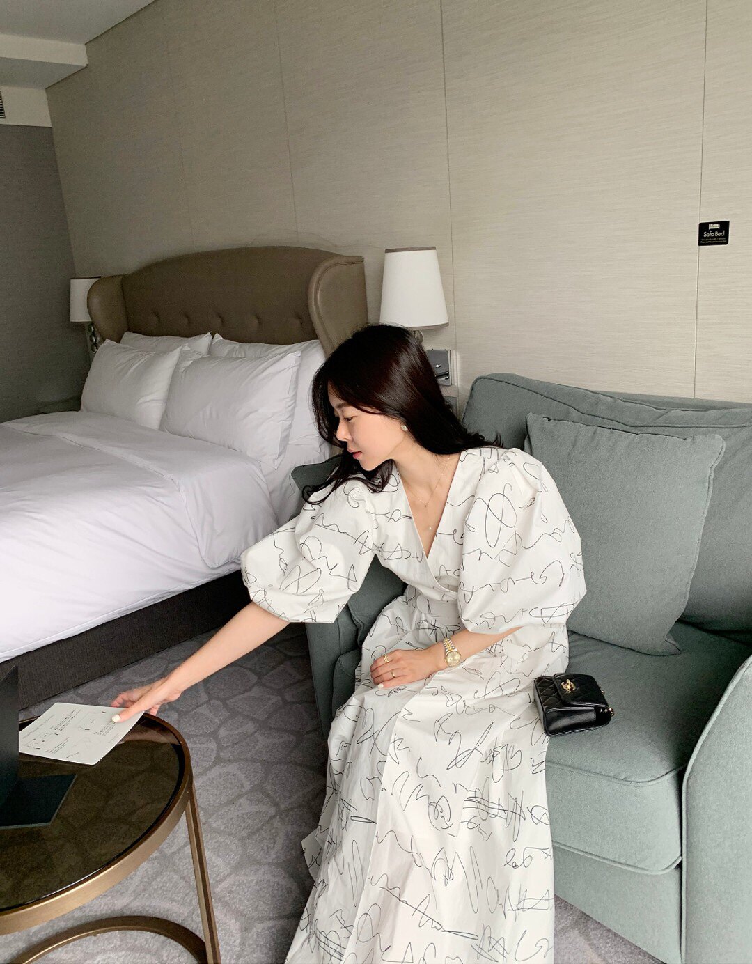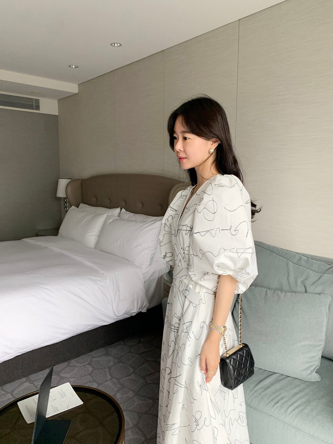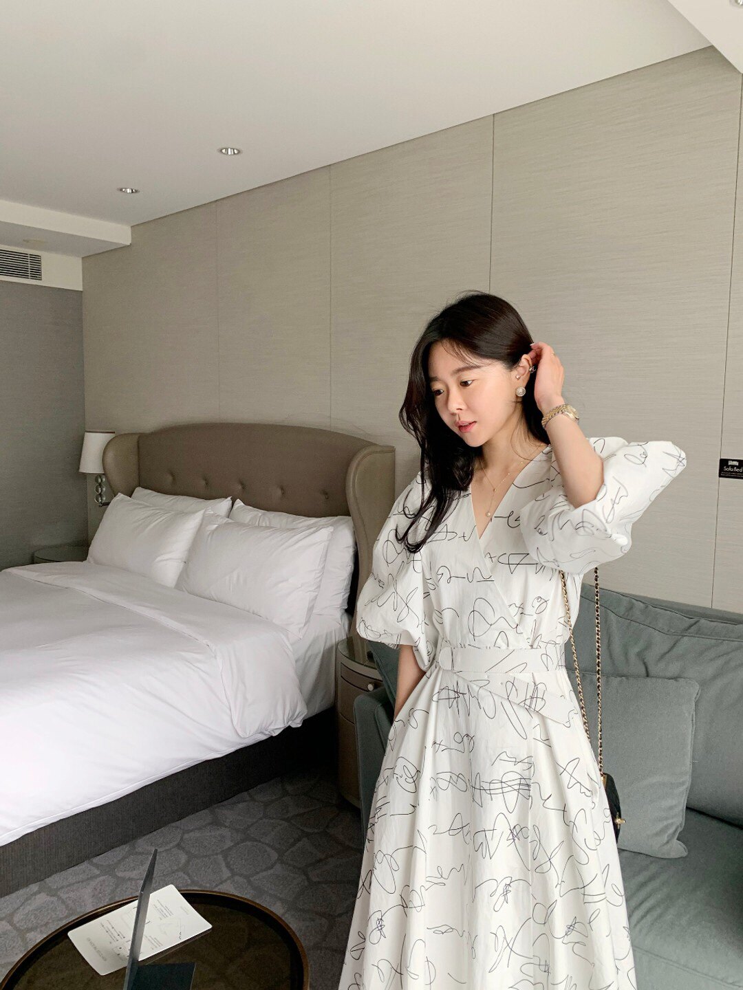 Элегантный длинный фонарь, платье, в корейском стиле, французский стиль, V-образный вырез, высокая талия, средней длины, граффити