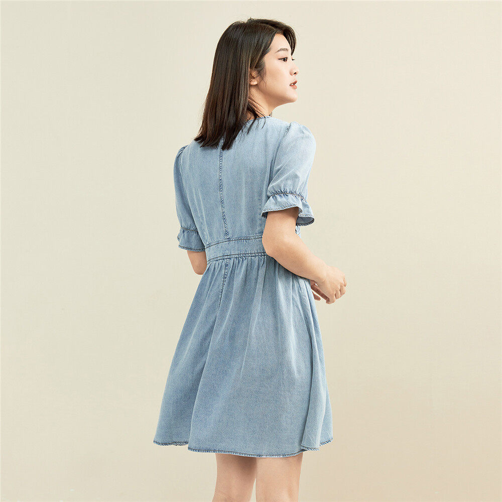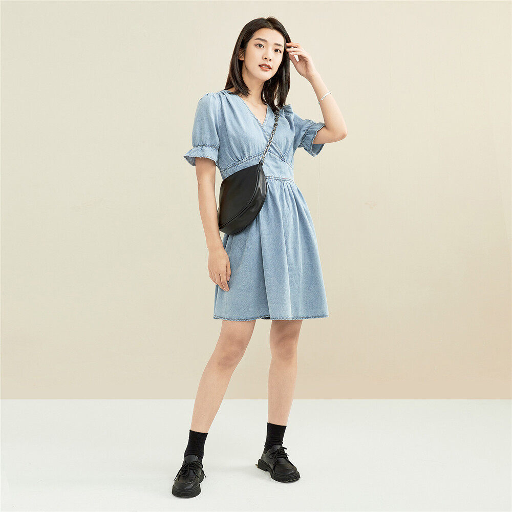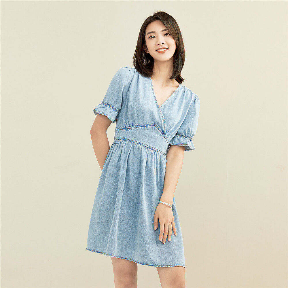佐丹奴 Ретро летняя одежда, джинсовая юбка, платье, высокая талия, V-образный вырез