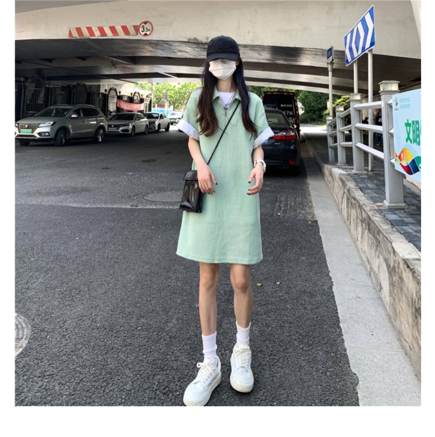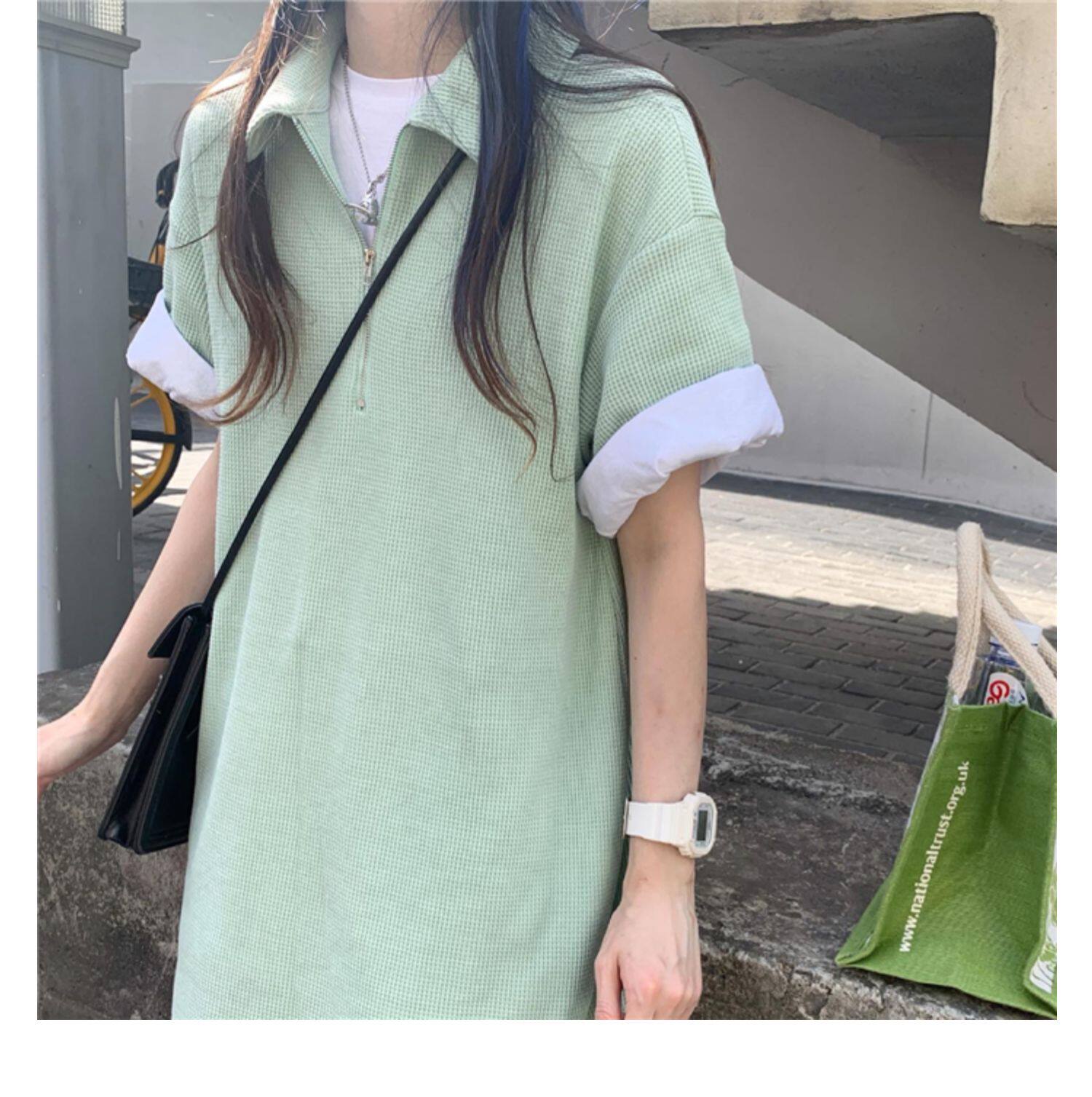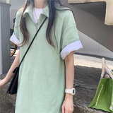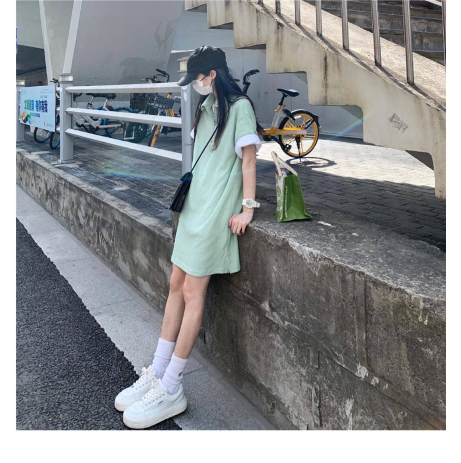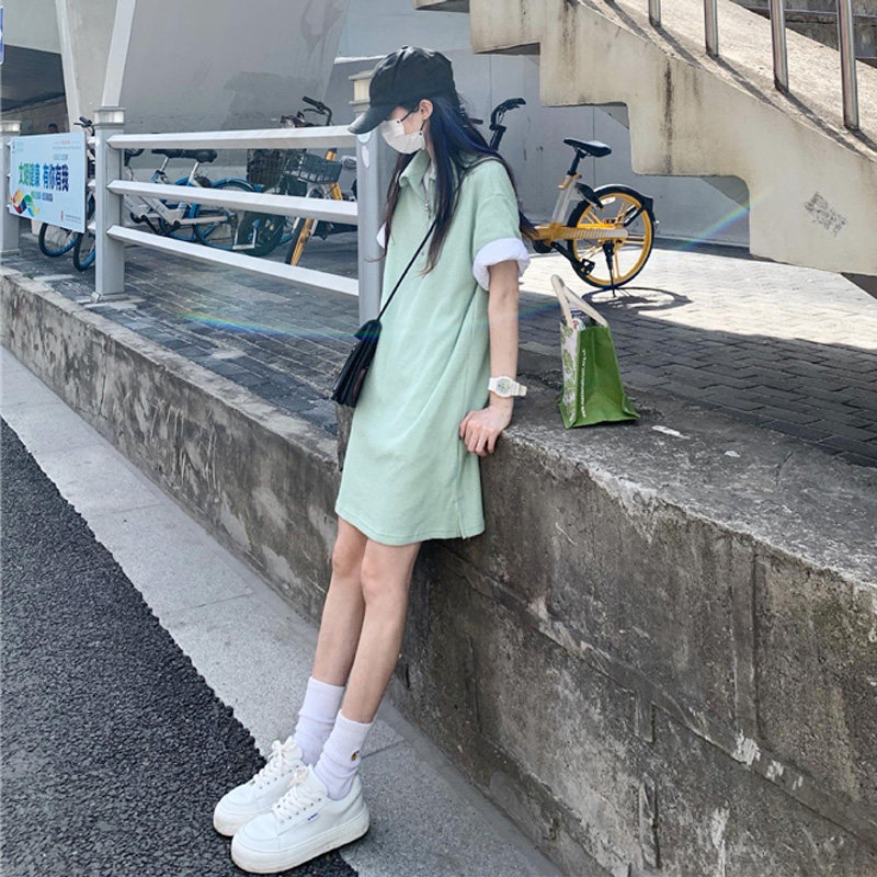 Японское мятное сексуальное платье, юбка, свободный прямой крой, воротник поло