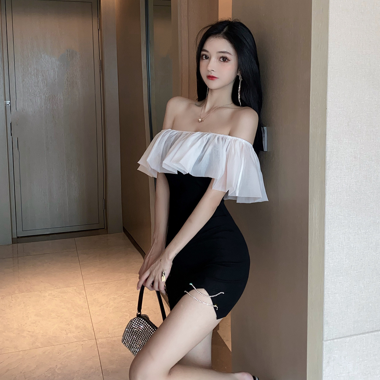 Летняя юбка, приталенный сексуальный корсет, платье, открытые плечи, французский стиль, с акцентом на бедрах