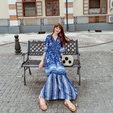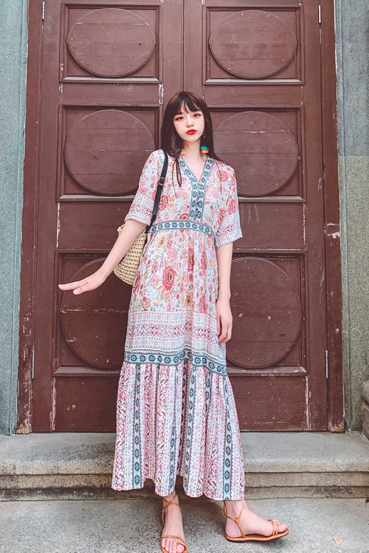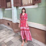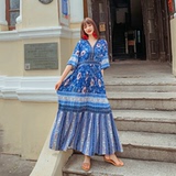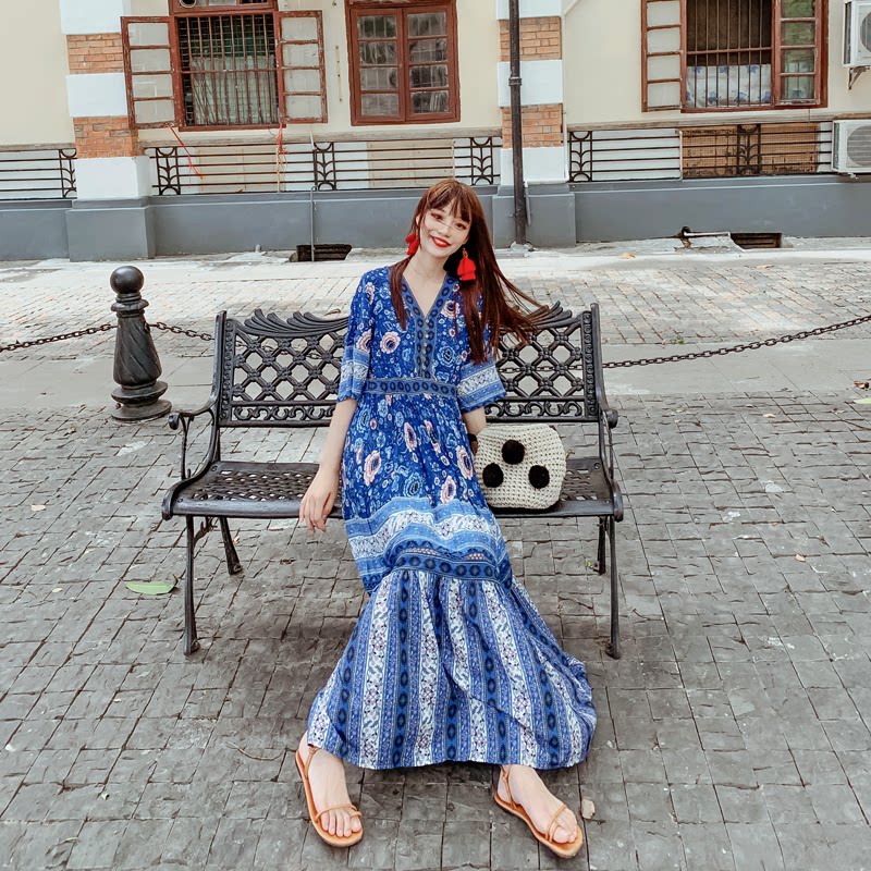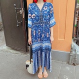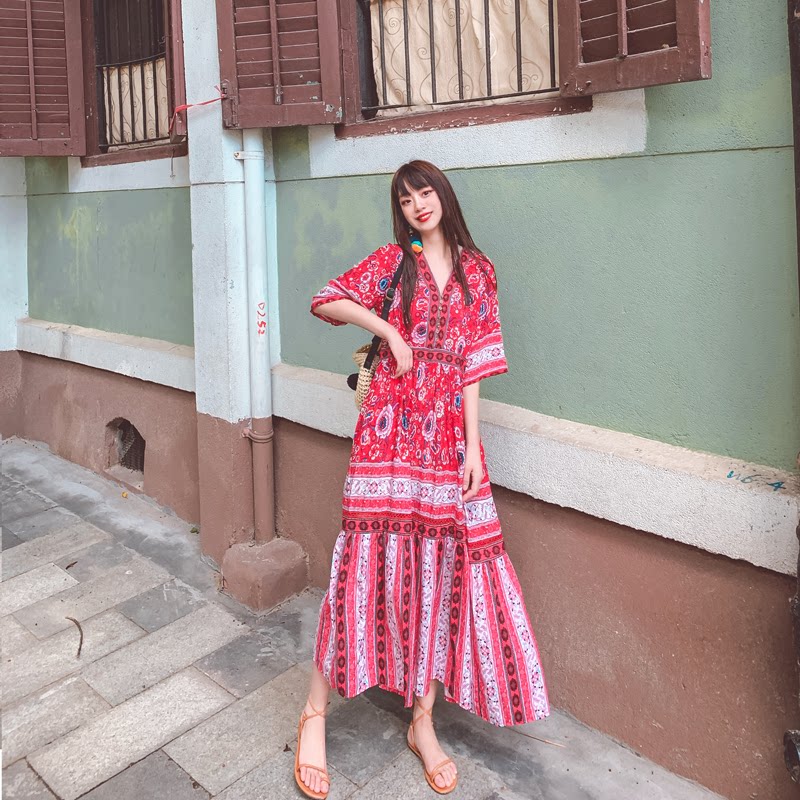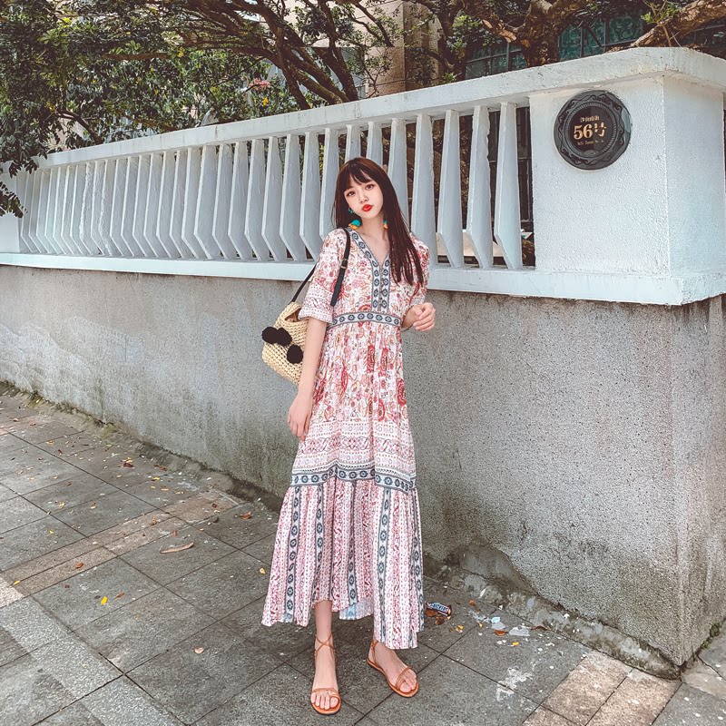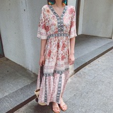 Пляжное ретро этническое платье большого размера, длинная юбка, стиль бохо, V-образный вырез, по фигуре, этнический стиль, цветочный принт, оверсайз, короткий рукав, с рукавом