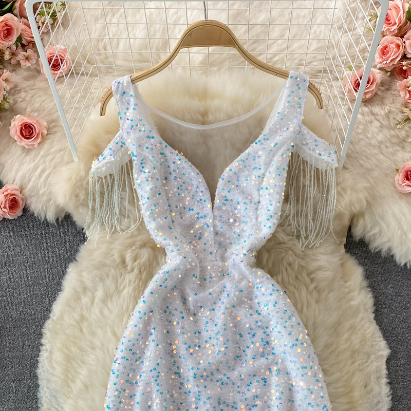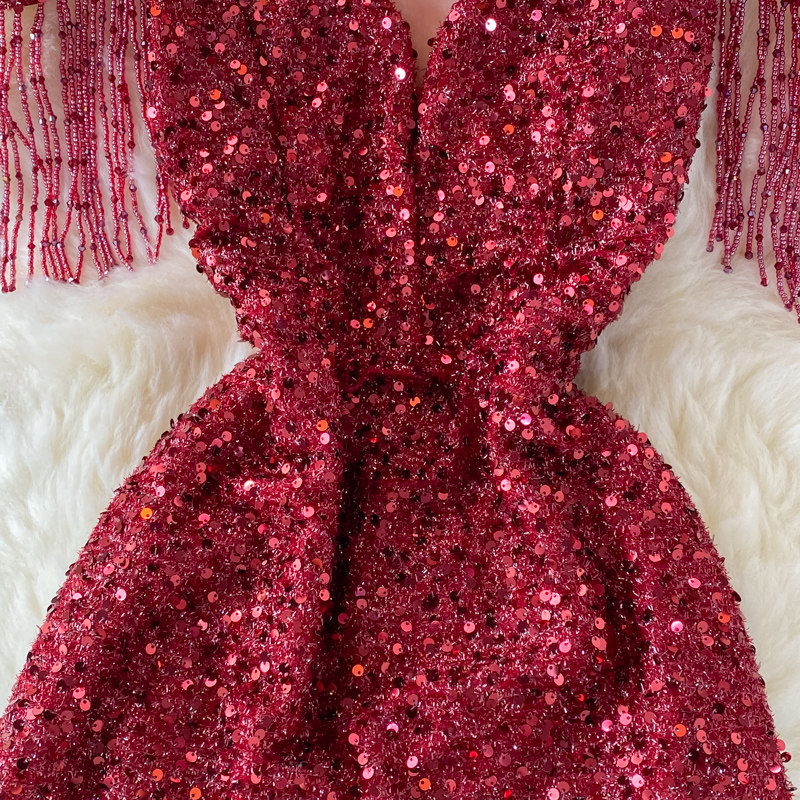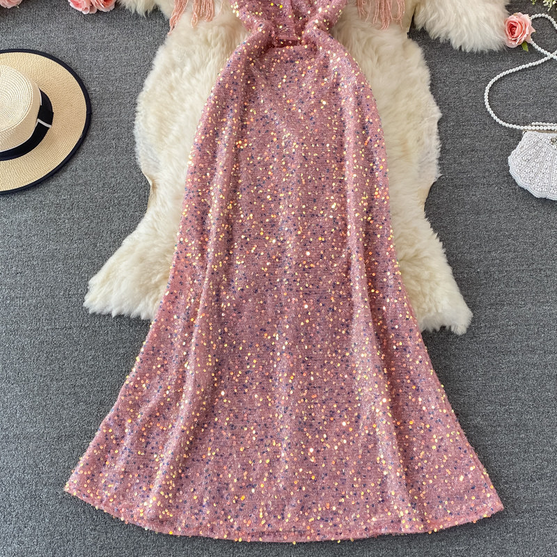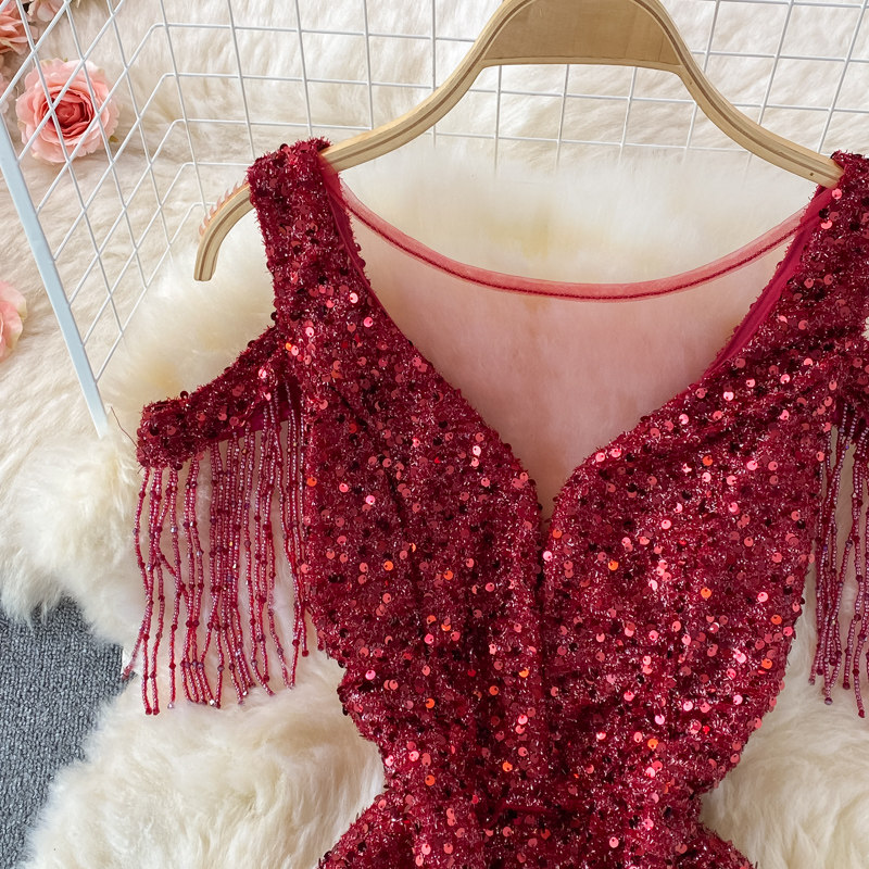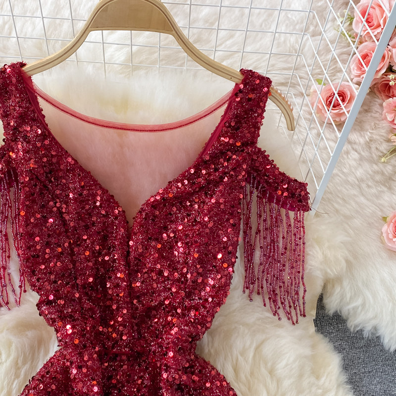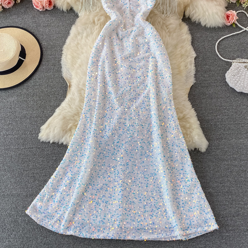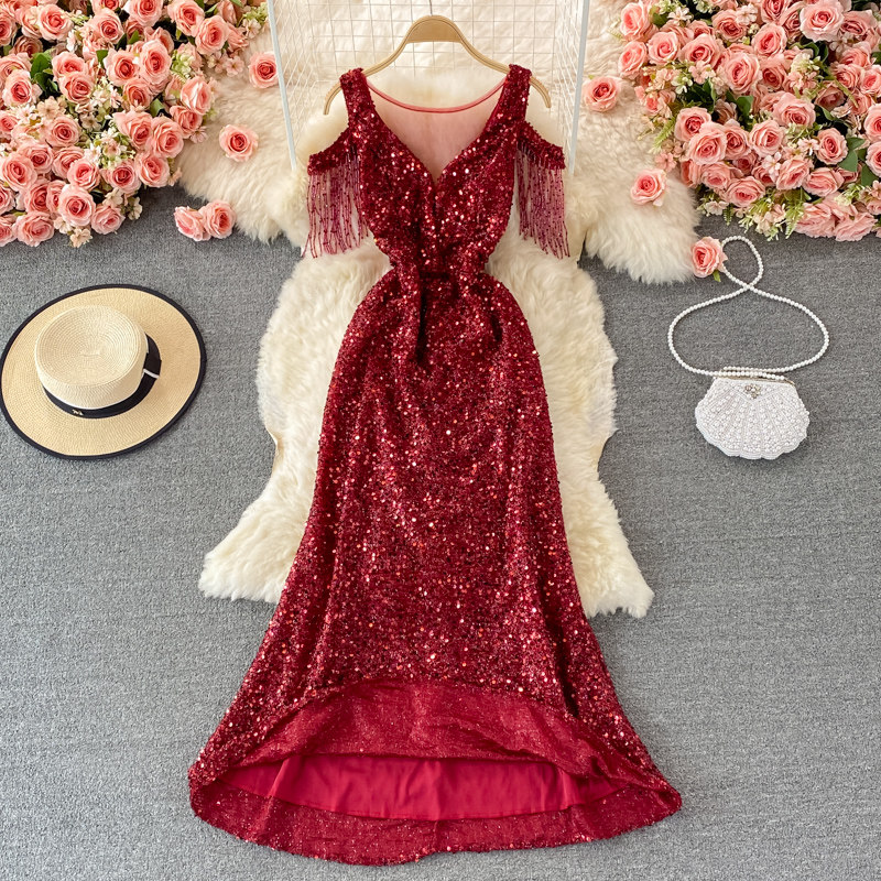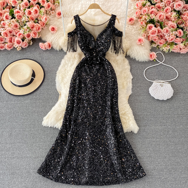 Элитное вечернее платье, длинная юбка, V-образный вырез, крой «рыбий хвост», с акцентом на бедрах