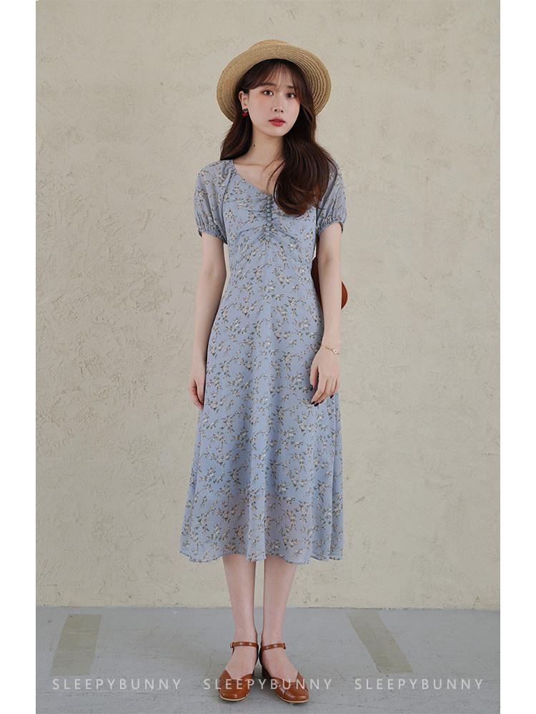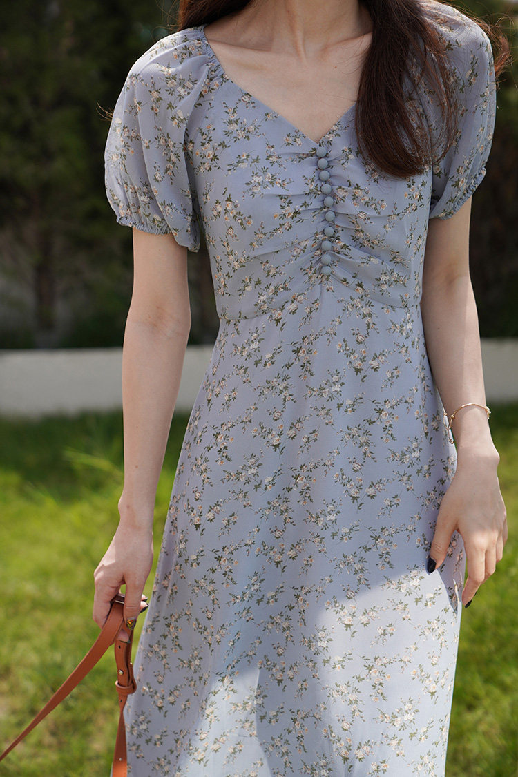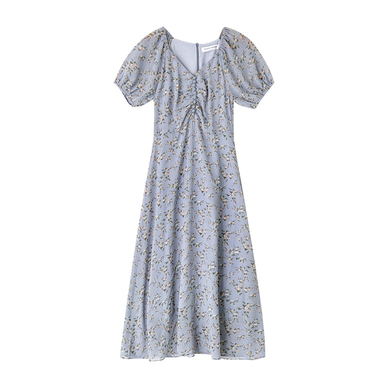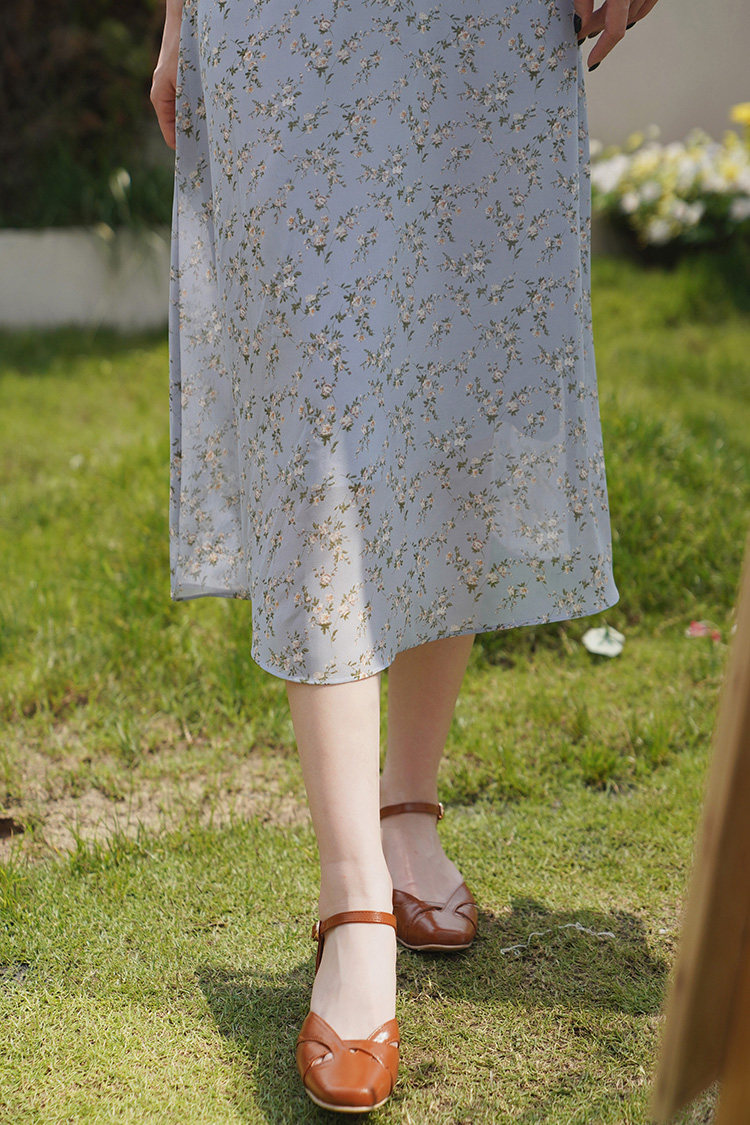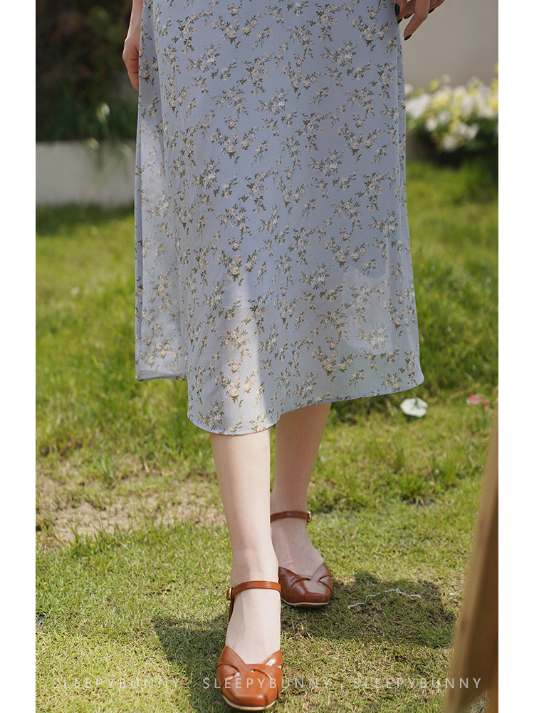Шифоновое платье, синяя длинная юбка, французский стиль, рукава фонарики, цветочный принт