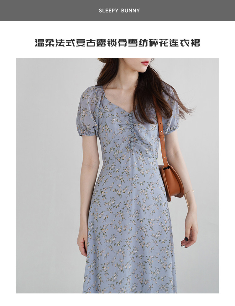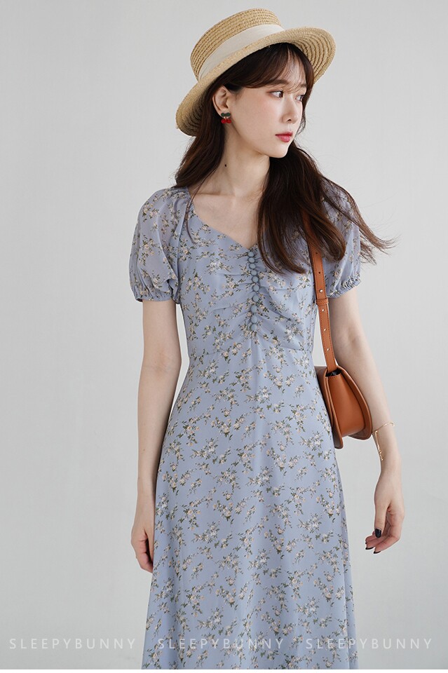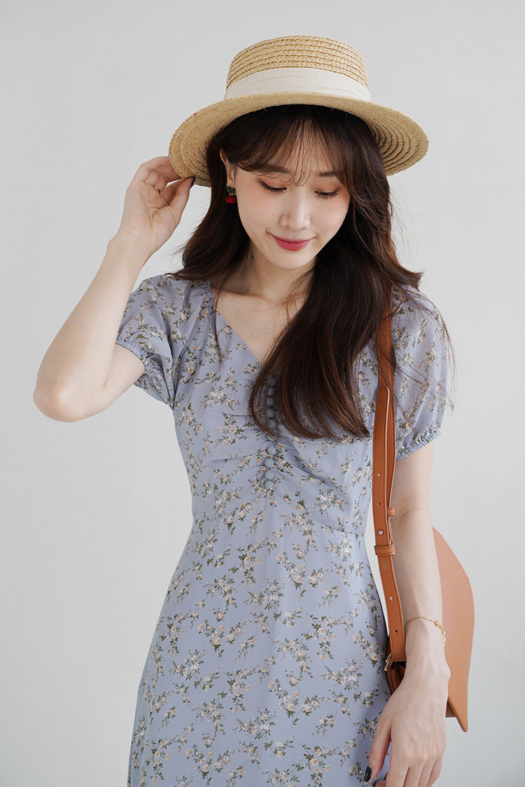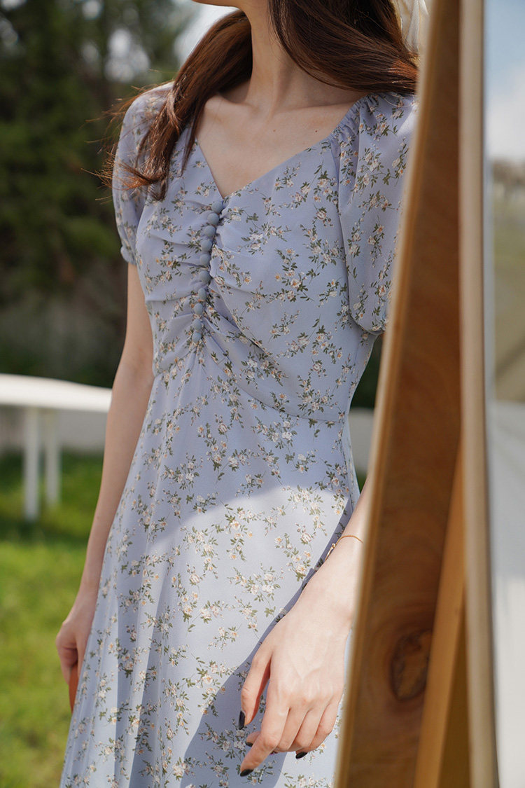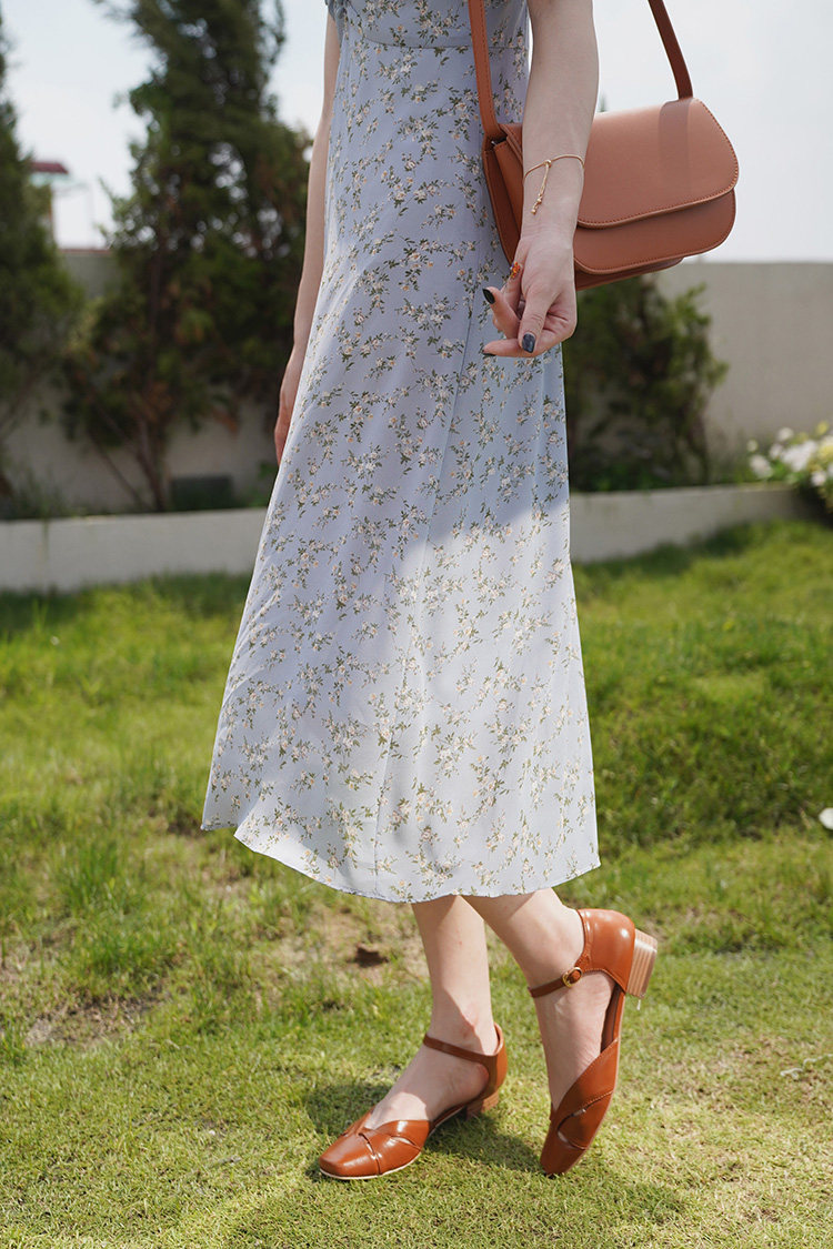 Шифоновое платье, синяя длинная юбка, французский стиль, рукава фонарики, цветочный принт