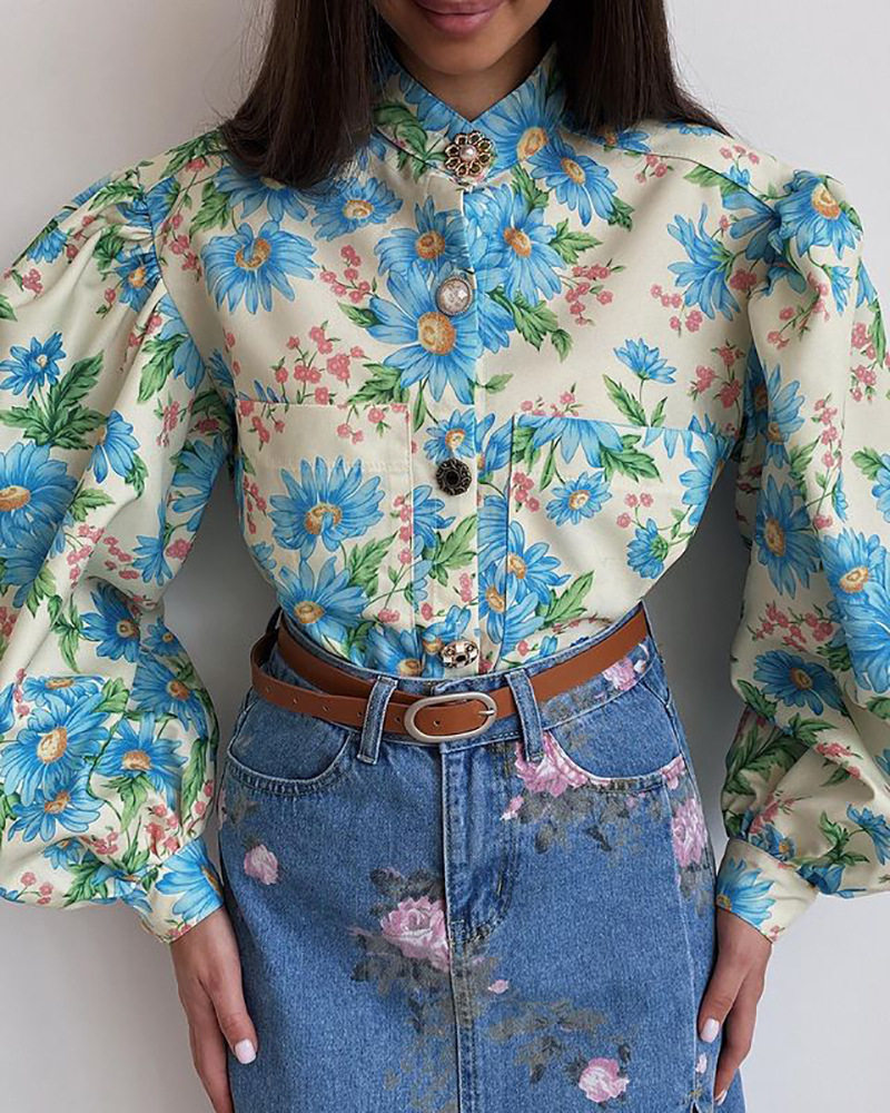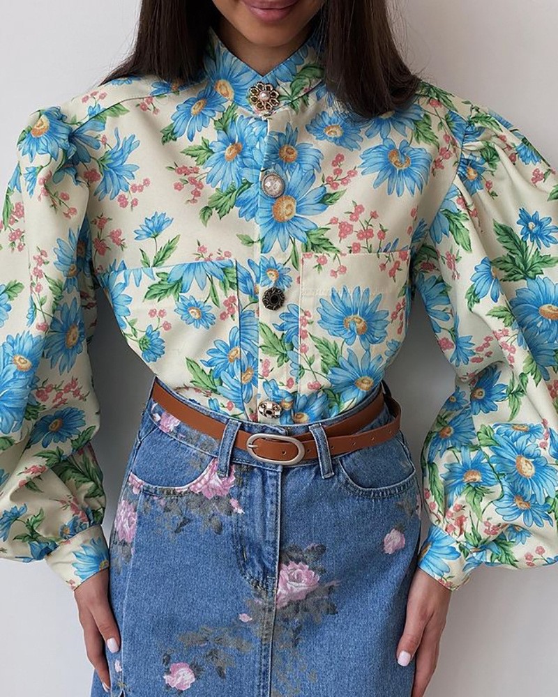 Пузырьковый рукав кардиганский топ европейский и американский синий цветок Ling Bubble Ryeve Girl Girl
