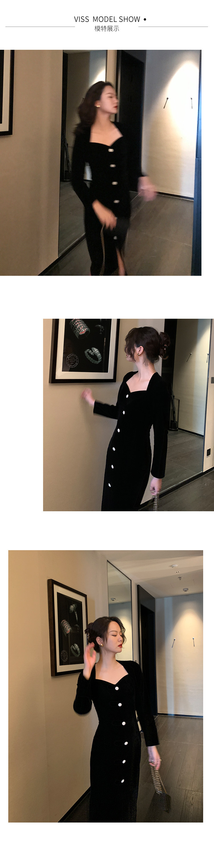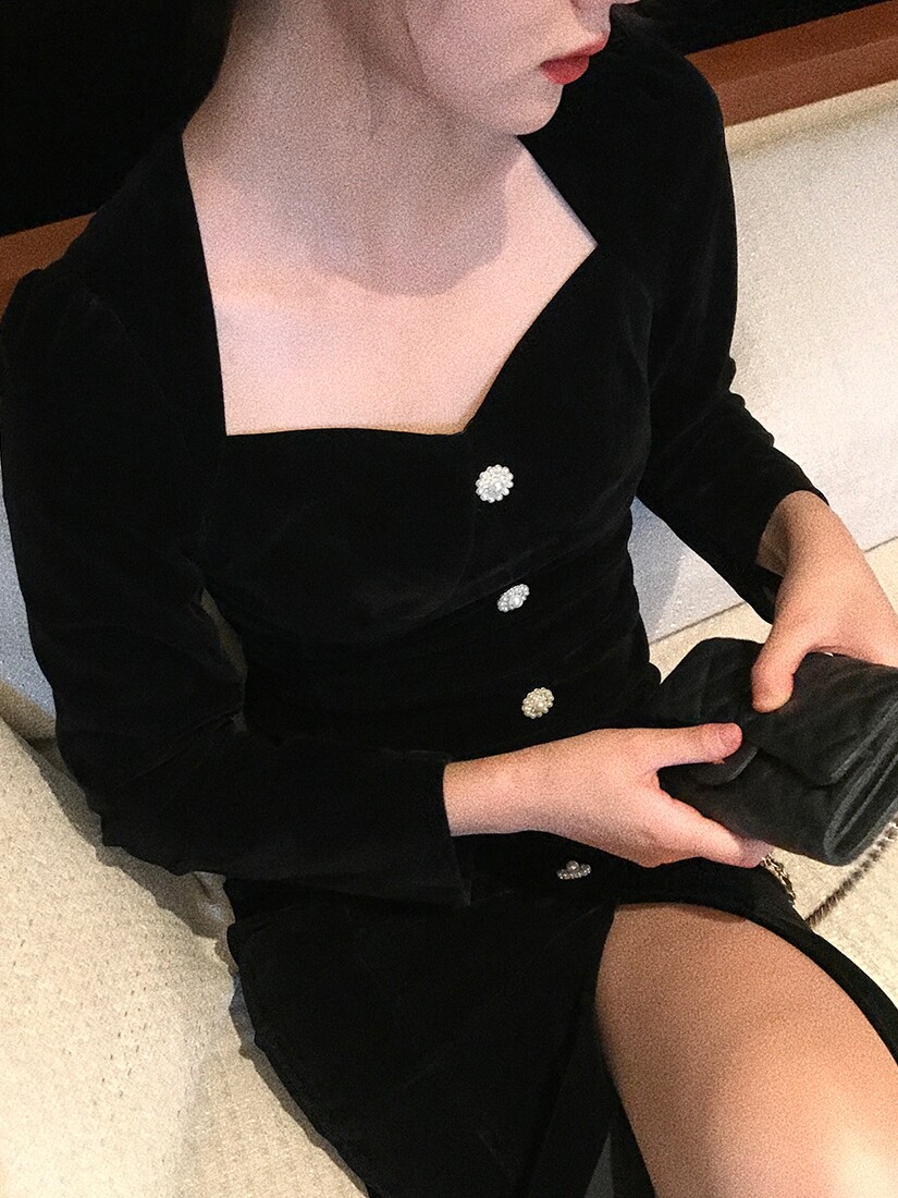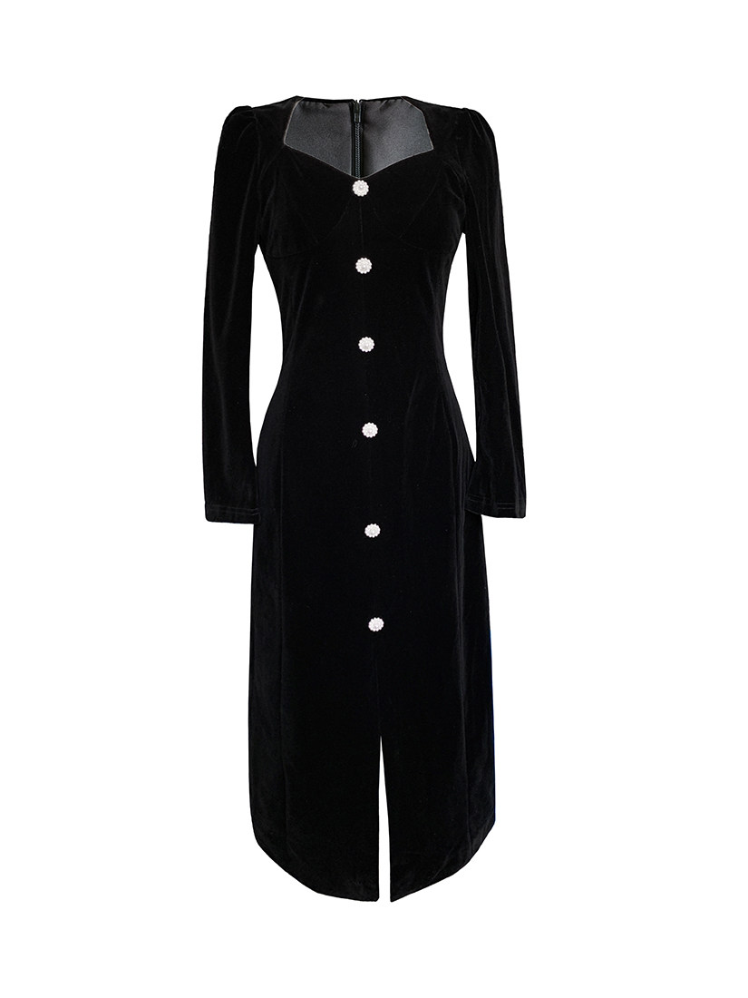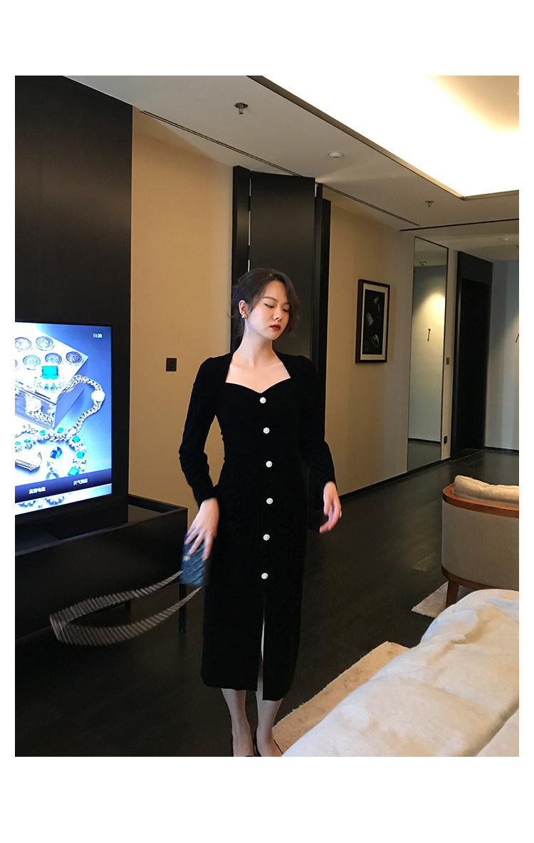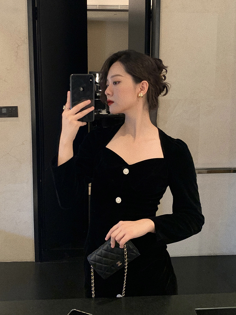 Ретро черное зимнее платье, приталенный корсет, лонгслив, французский стиль, А-силуэт