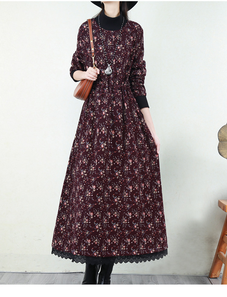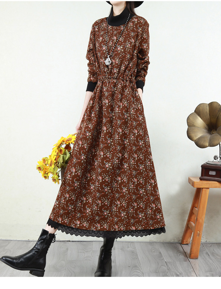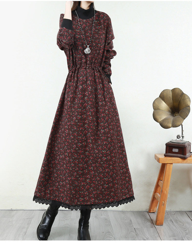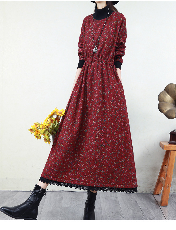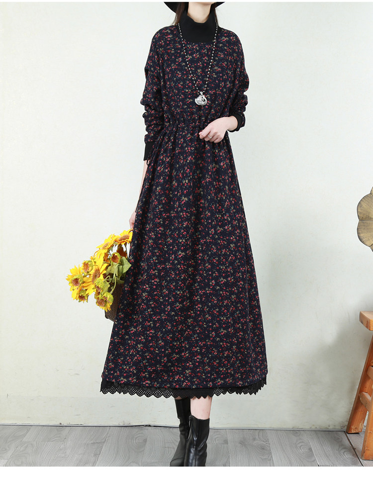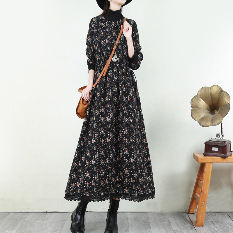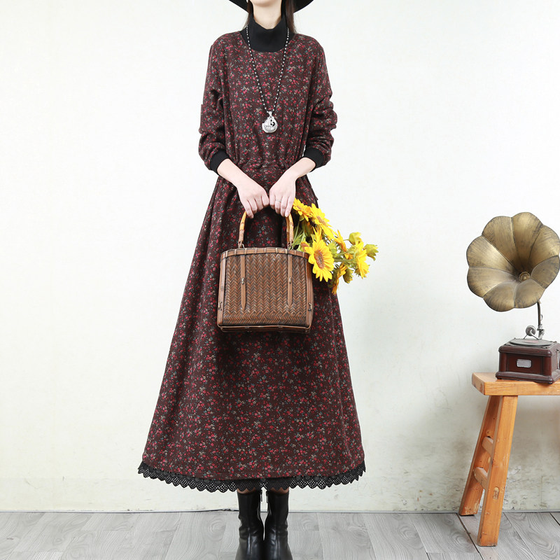 Ретро флисовое длинное зимнее платье, кружевная длинная юбка, цветочный принт, свободный крой
