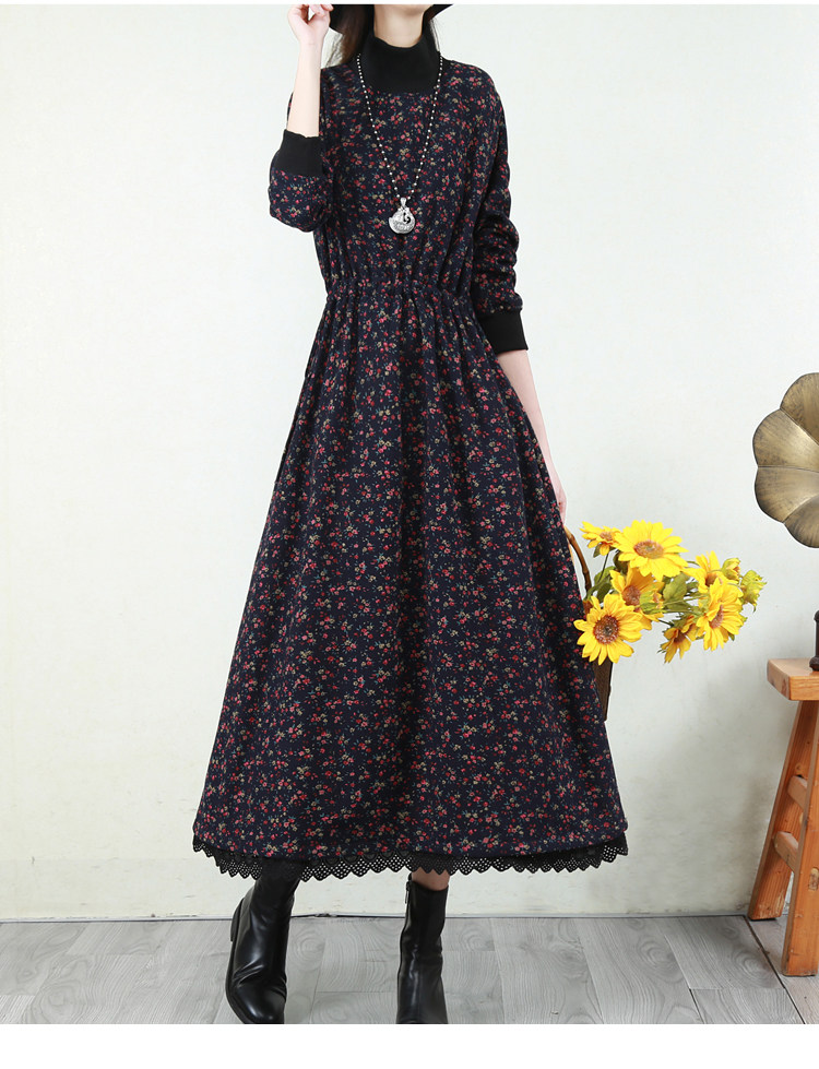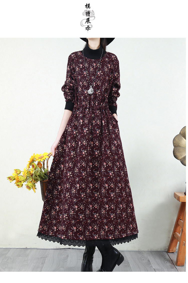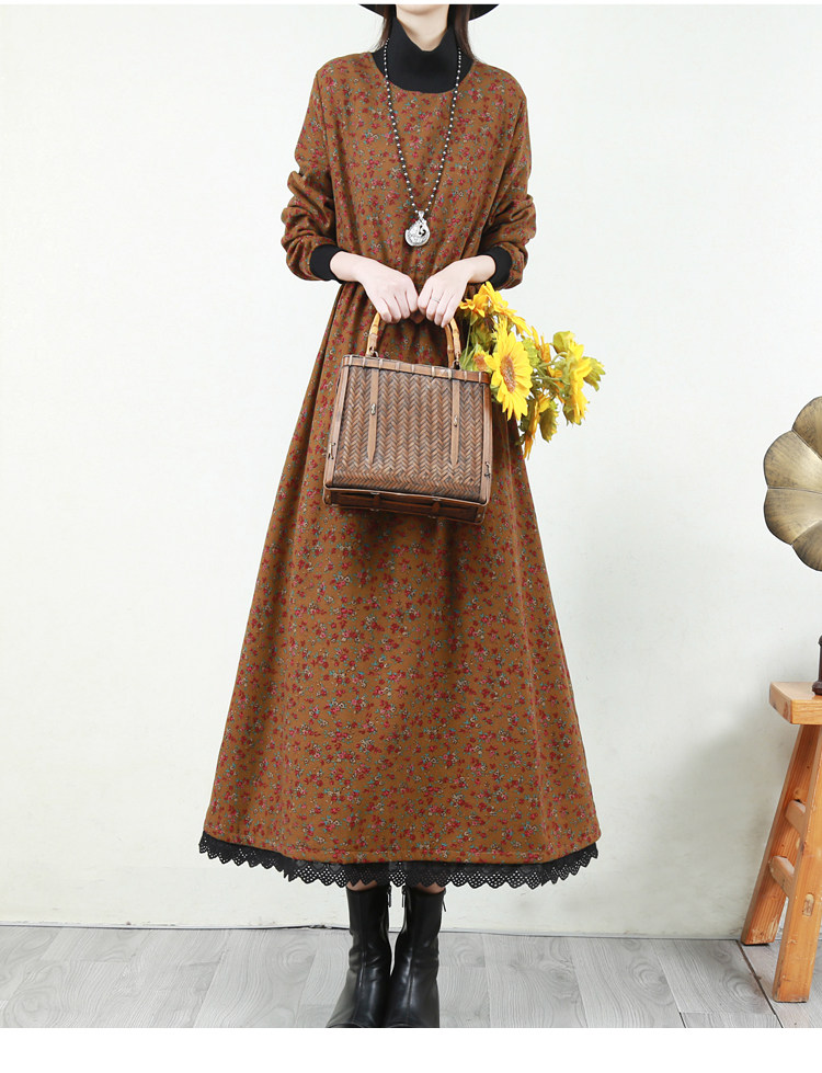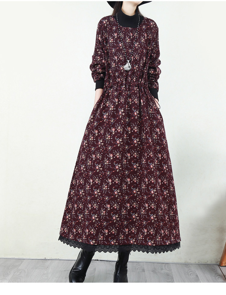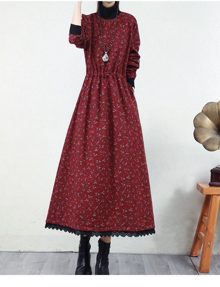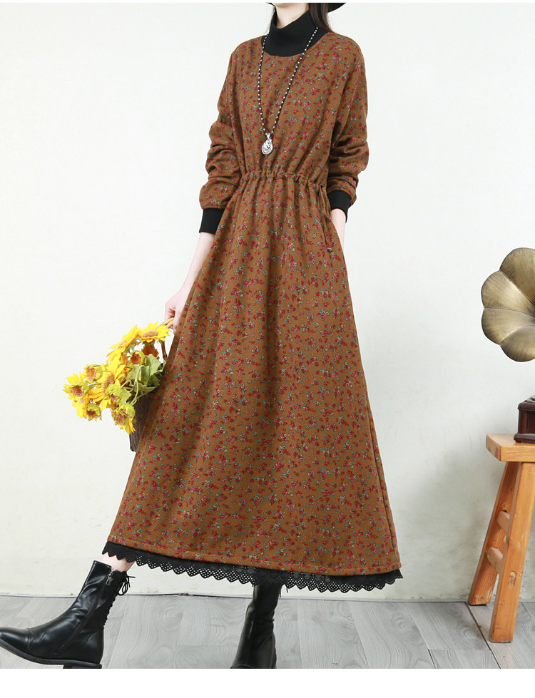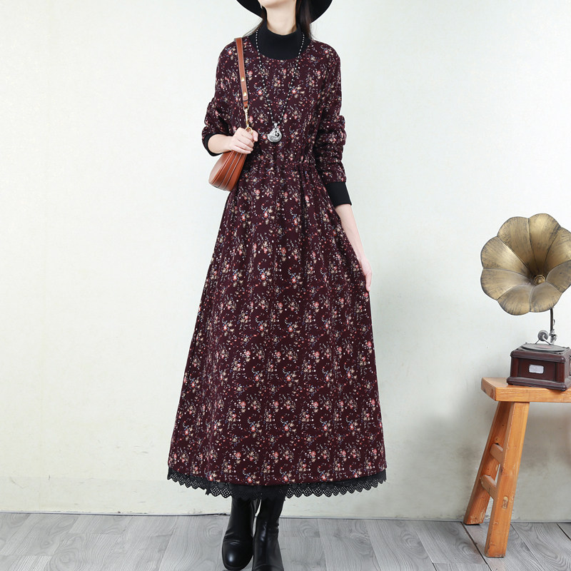 Ретро флисовое длинное зимнее платье, кружевная длинная юбка, цветочный принт, свободный крой