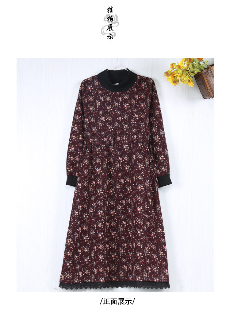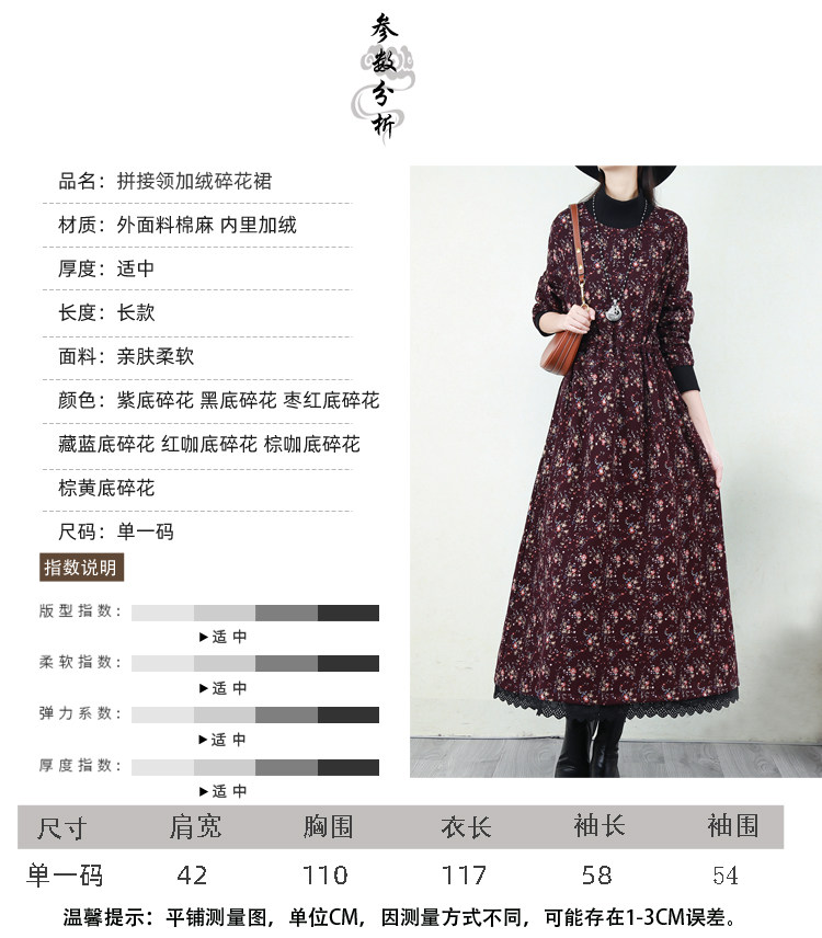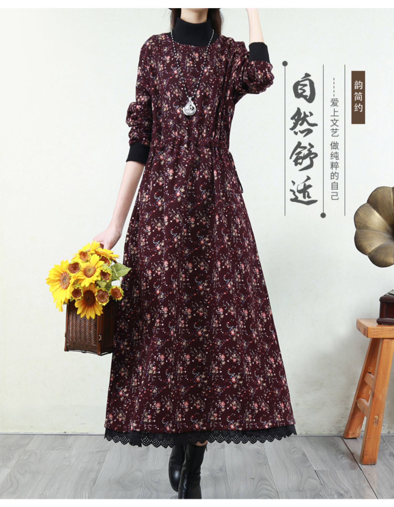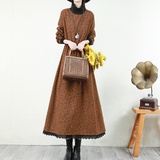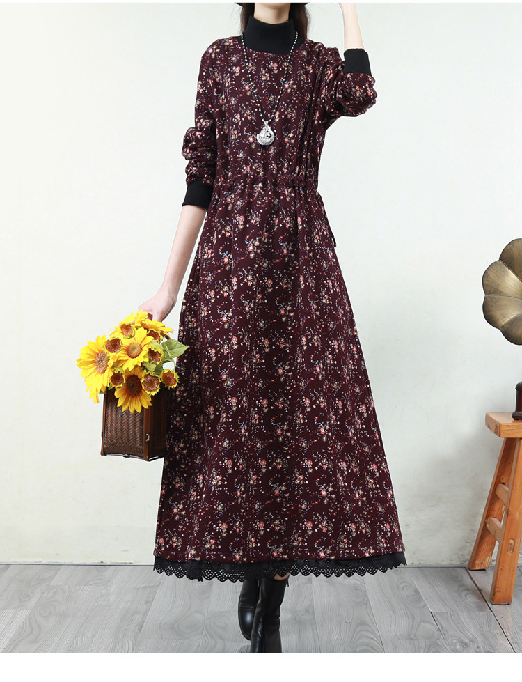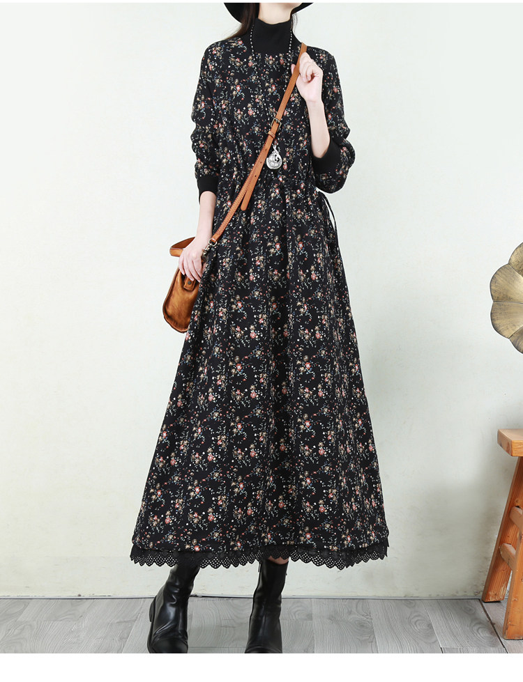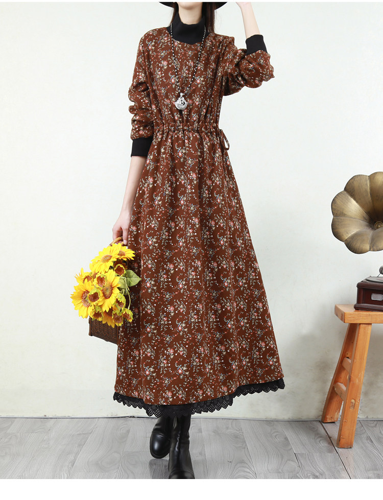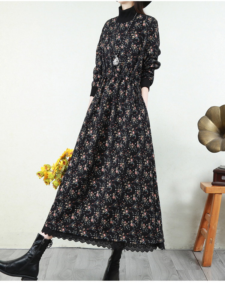 Ретро флисовое длинное зимнее платье, кружевная длинная юбка, цветочный принт, свободный крой