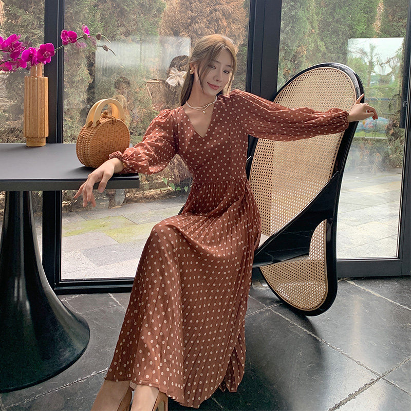 Длинное платье, лонгслив, шифоновая юбка в складку, V-образный вырез, французский стиль