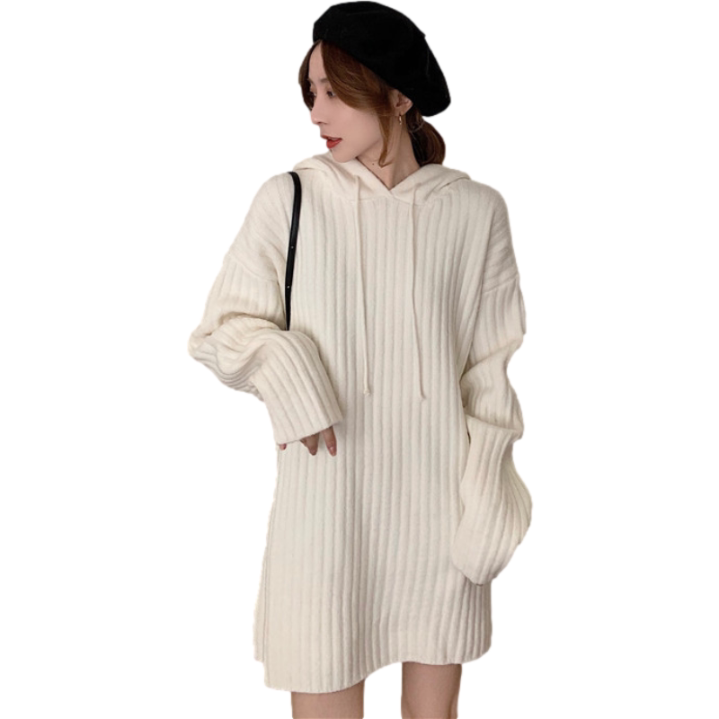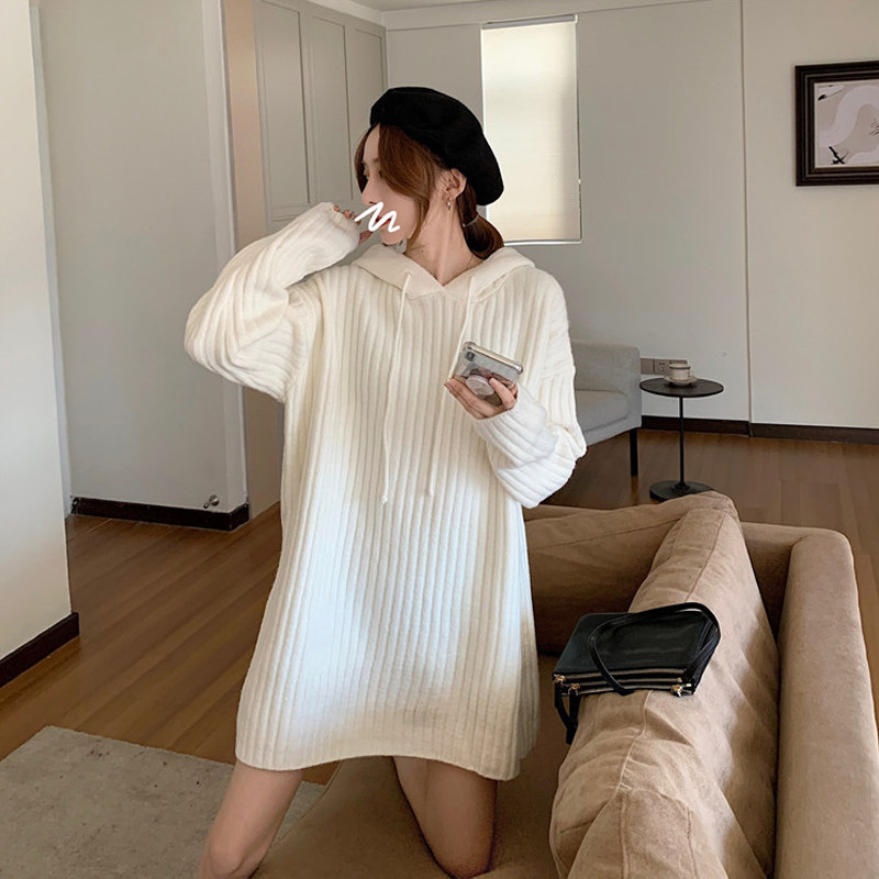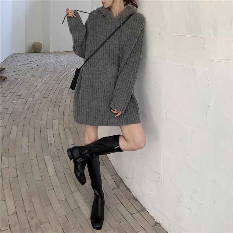 Длинная толстовка с капюшоном, осеннее шерстяное платье, трикотажная юбка, средней длины, оверсайз, с акцентом на бедрах