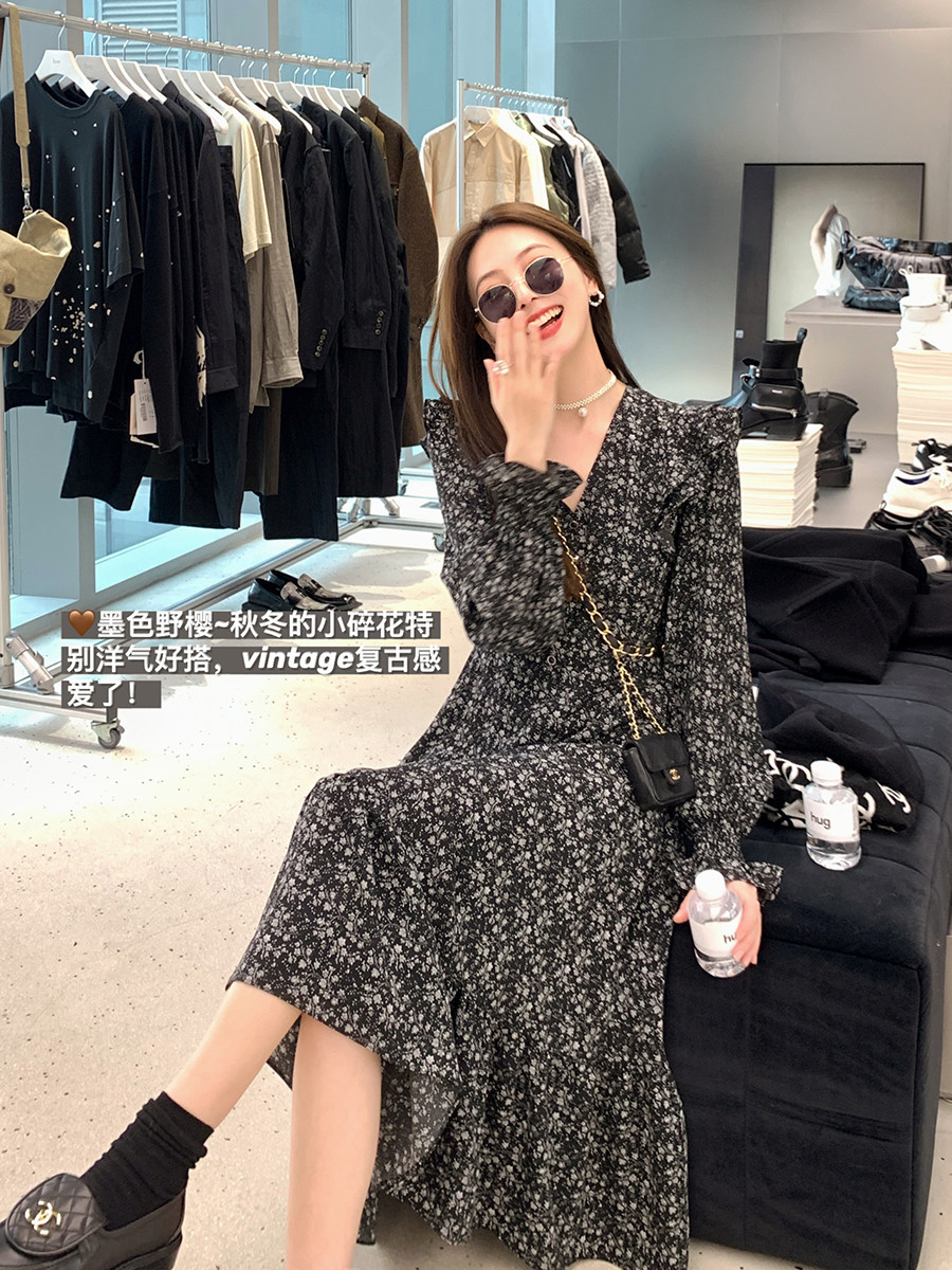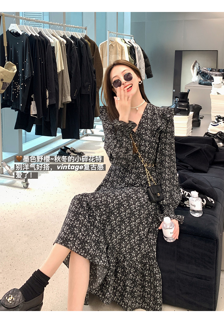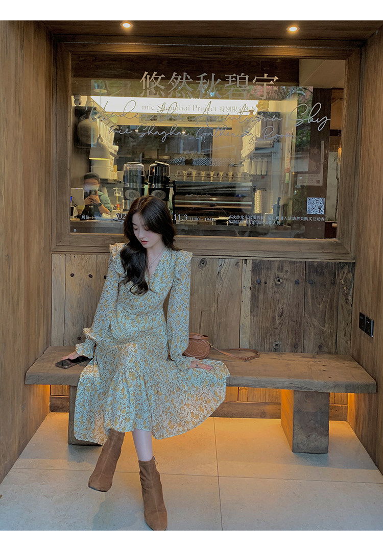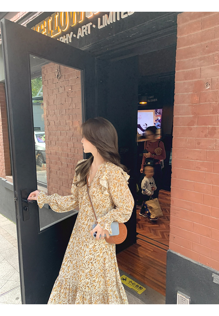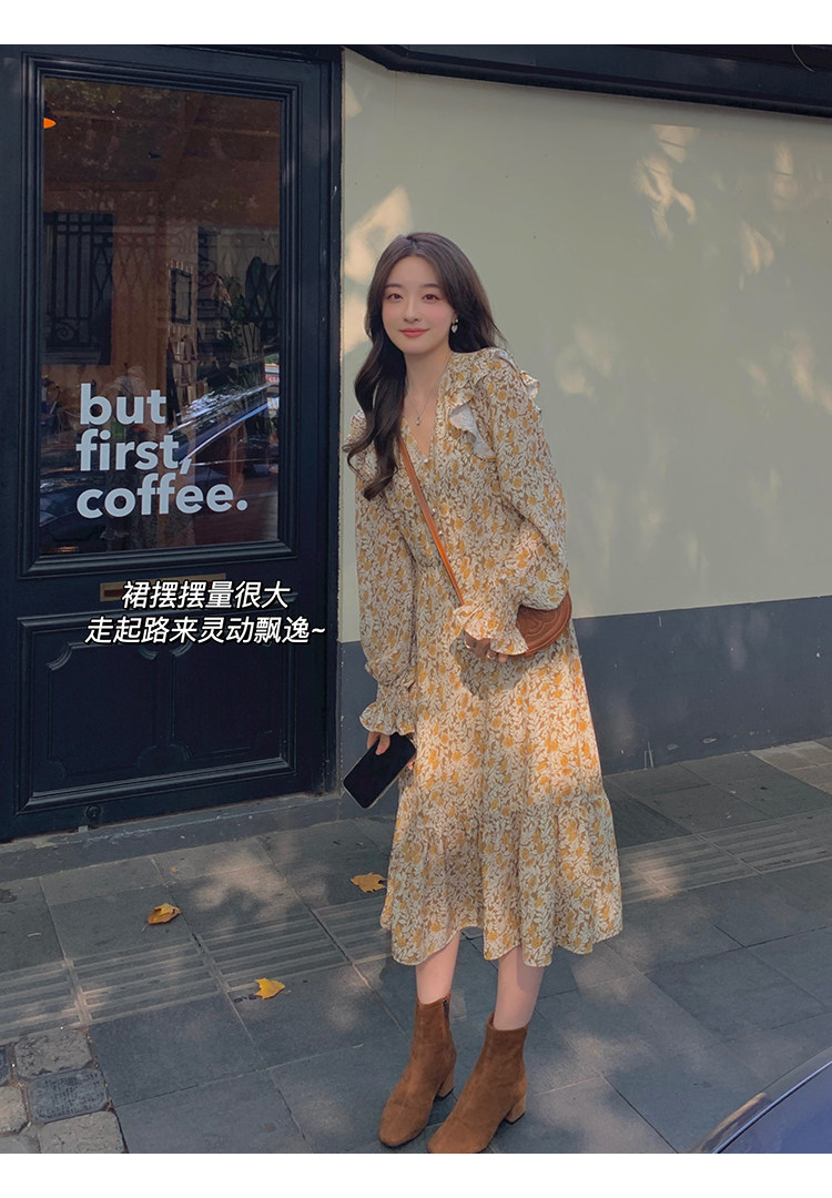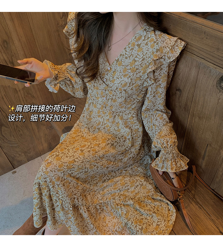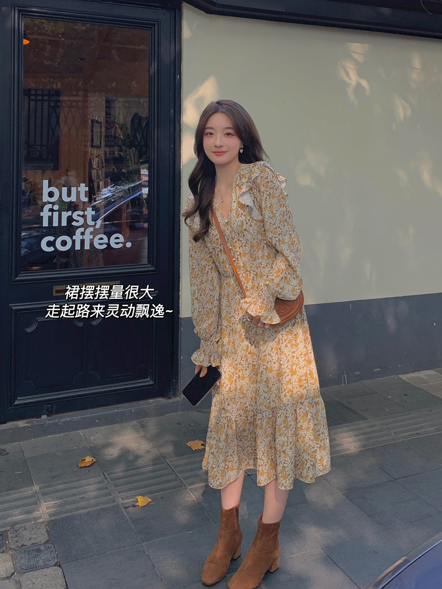 Шифоновый фонарь, осеннее платье, французский стиль, V-образный вырез, в цветочек