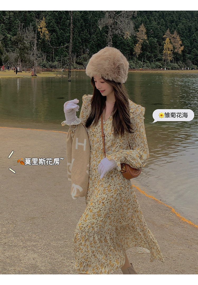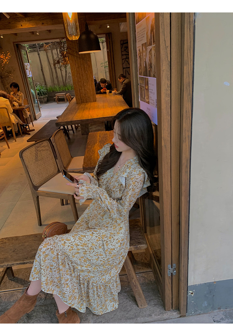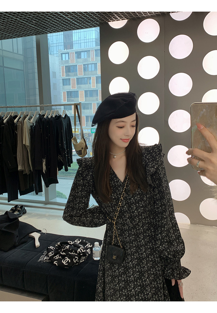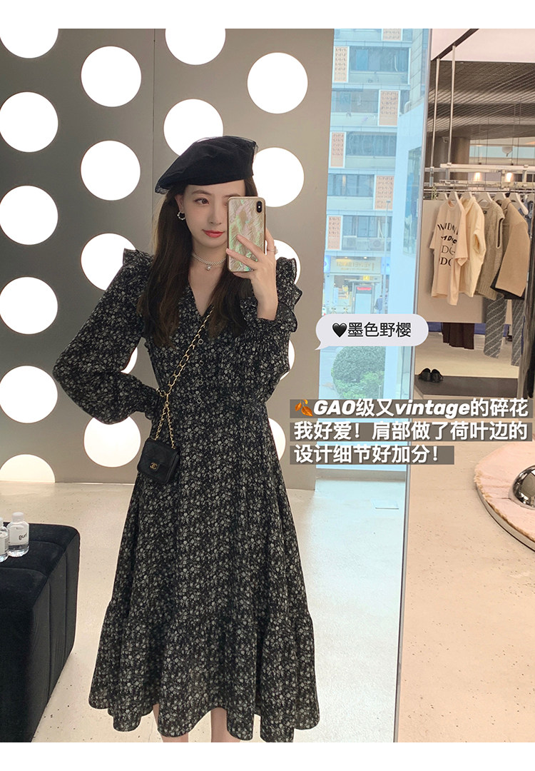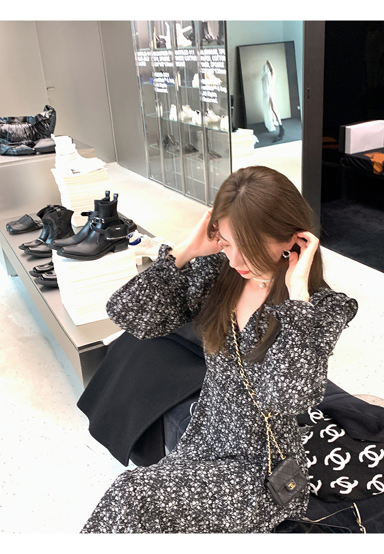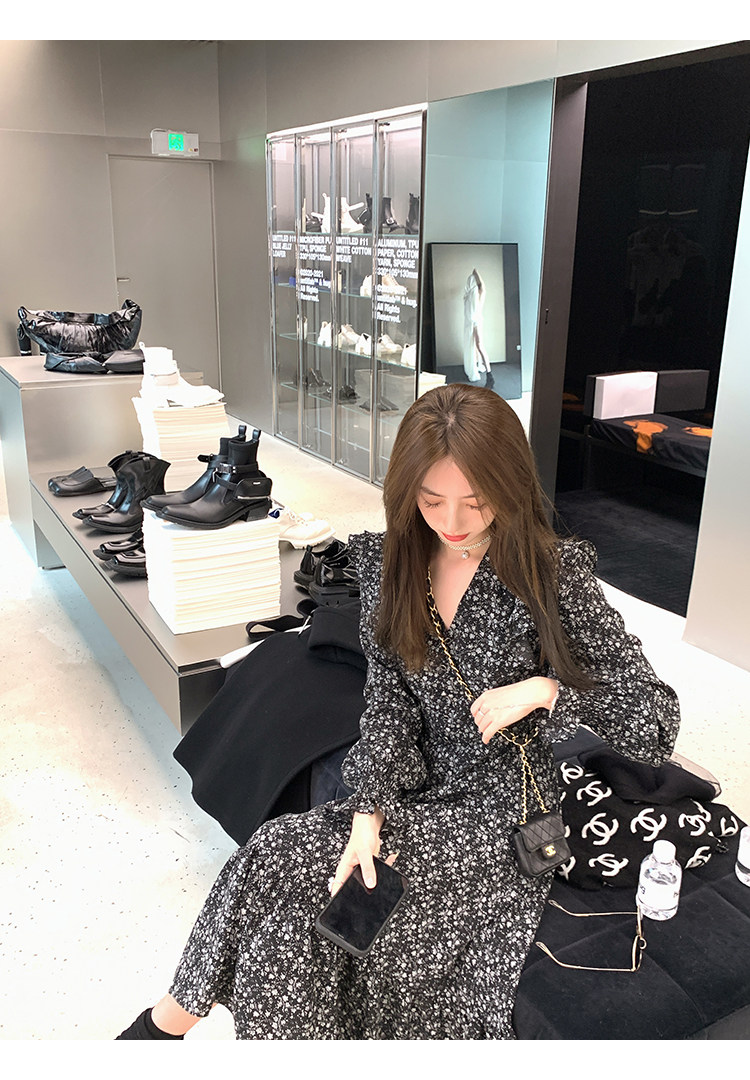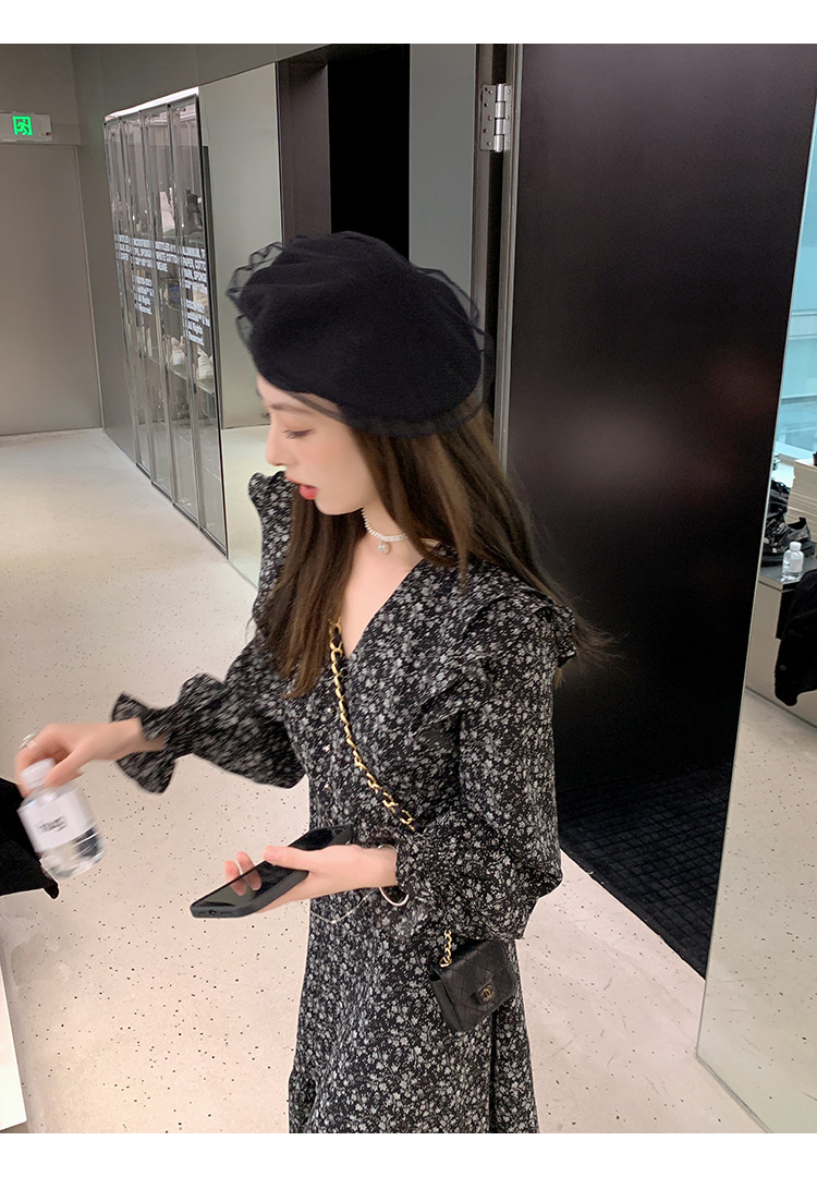 Шифоновый фонарь, осеннее платье, французский стиль, V-образный вырез, в цветочек